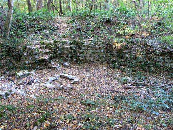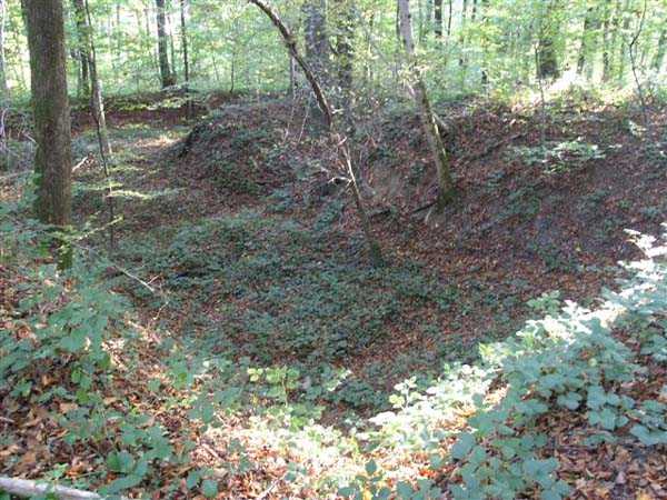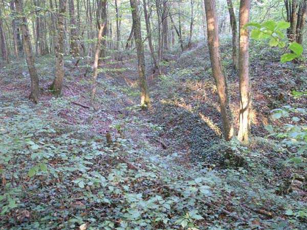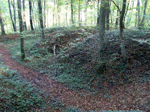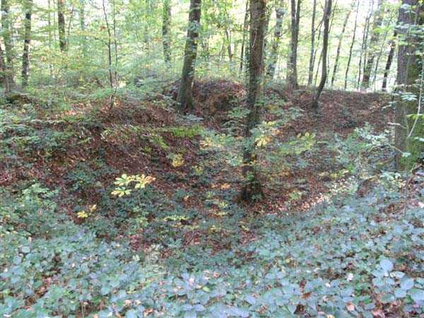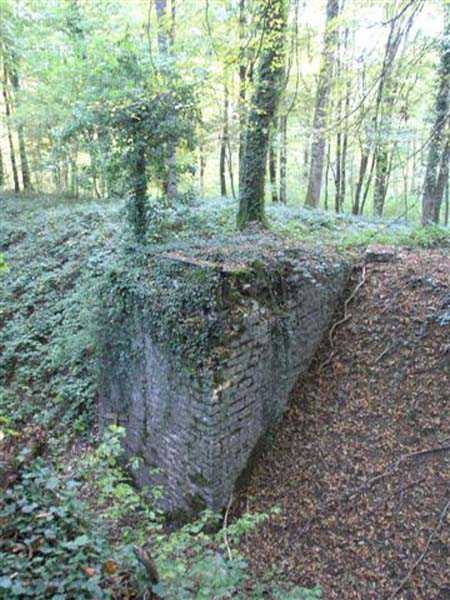 Fortress Besançon, WSO of the city, 1891-1892. 310 m/alt. Located in the middle of a deciduous wood, the walker first makes out the cadastral markers before finding himself facing a deep, steep ditch. The structure has the shape of a chevron, with the central salient of the head front rounded. Only the escarpment of the gorge front is reveted. A bridge, probably retractable, close to salient V, allowed access to a paradossed firing parapet following the shape of the head front. The ditch was in no way defended. On either side of the structure, right next to it, are two alignments of four artillery emplacements separated by solid traverses. This structure is reputed to be the last complex to have been built in the square. The structure and the adjoining batteries are freely accessible (10/2007).