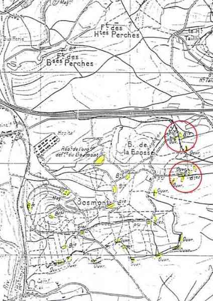 Verschansd kamp van Belfort, ten zuidoosten van de stad. Het hoogtepunt ligt op 406 m/hoogte. Tijdens het beleg van 1870-71 hadden de Pruisen batterijen geïnstalleerd aan de noordrand van het Bosmontbos om de schansen van de Perches aan te vallen. Al in 1874 werd besloten deze locaties te bezetten, waardoor de mogelijke toekomstige investeringslijn verplaatst kon worden van de plaats van Belfort. Het reliëf en de beboste dekking maakten het al snel onmogelijk om één permanente vesting toe te vertrouwen aan deze ongeveer 2,5 km² bestreken door het Bosmontbos en het Bos van Brosse. De bouw van de redoute werd zonder vertraging uitgevoerd (zie redoute van Bosmont), terwijl de omliggende bossen snel wemelden van de bouwplaatsen. In wezen waren dit infanterieloopgraven en batterijen voor middelzware (90 of 95 mm) en zware (120 of 155 mm) kanonnen, volledig gemaakt van aarden wallen die verspreid lagen langs de rand en in het hart van deze bossen. Om de troepen te huisvesten die nodig waren om al deze wallen te bezetten, werden maar liefst vier gebieden als kampementen aangewezen. Over de laatste hebben we geen informatie, maar het is waarschijnlijk dat het tentenkampen waren. Elk kamp zou een drinkwaterput in de buurt moeten hebben. We moeten vaststellen dat de bronnen tegenstrijdig zijn wat betreft het aantal batterijen en wallen. Dit aantal schommelt tussen de 12 en 18 voor de eerste, tussen de 13 en 21 voor de laatste; terwijl het er zes hadden kunnen zijn. Tijdens een conferentie op 14 maart 1885 werd gesproken over versterking van de positie. Er zou een fort worden gebouwd, ongeveer twee keer zo groot als de schans (zie Fort du Bosmont), 250 tot 300 meter ervoor. Aan de flanken van dit fort zouden twee overdekte wegen worden aangelegd, waarvan de noordelijke tak zou worden verbonden met een infanterieschans (voor 1 compagnie) die pal tegen de spoorlijn aan lag, tegenover Bazel, en de zuidelijke tak met de spoorlijn van Morvillars, niet zonder onderbreking door vier batterijen. De schans en een dozijn batterijen zouden worden verlaten, terwijl het overgrote deel van de infanterieschansen moest worden verbeterd. Op 6 mei 1885 werd hiervoor een bedrag van 1.200.000 frank gepland, waarvan 100.000 voor grondaankoop. Het verfijnde project stelt voor om de redoute en 8 batterijen te verlaten, 1 te behouden zoals die is, 2 nieuwe te bouwen en 3 om te vormen tot infanterieredoutes. Het verlaten van bepaalde batterijen zou gedeeltelijk gecompenseerd moeten worden door de artillerie van de nieuwe redoute, die 15 stuks zou bedragen. Uiteraard zijn we ter plaatse geweest om te proberen dit alles te verduidelijken (oktober 2010). Eerste observatie: noch de redoute van de Bazelse spoorlijn, noch het nieuwe fort/de redoute zijn boven water gekomen. Na veel tijd verloren te hebben in het oostelijke deel van het Brosse-bos, waar de paden en paden zich verstrengelen en waar de ondergroei slechts een aaneenschakeling is van holtes en misvormde bulten, kwamen we slechts één betonnen batterij tegen (zie batterij van Proc). We hebben er zeker tien andere gevonden, allemaal in grondwerken en min of meer goed ontworpen. Eén, voor 3 zware kanonnen, werd zelfs voorafgegaan door een diepe, ongevoerde greppel. Van deze 10 waren er 6 bestemd voor zware kanonnen. In detail geeft dit 1 batterij voor 2 kanonnen, 1 voor 3 kanonnen, 1 voor 6 kanonnen en 3 voor 4 kanonnen. De overige 4 batterijen waren allemaal bestemd voor 4 kanonnen van middelgroot kaliber. Van de vermeende 6 putten hebben we er maar één gevonden, maar ons onderzoek moet worden verdiept in het licht van documenten die we na ons bezoek ter plaatse hebben ontvangen. De infanterieloopgraven zijn veel moeilijker te onderscheiden en in plaats van er gedeeltelijke conclusies aan te verbinden, zullen we deze tekst verfijnen na een tweede dag eraan gewijd te hebben. In ieder geval werd de hoofdlijn voortgezet met, van west naar oost, de werken van Fougerais, van Meroux, het fort van Vézelois en de werken van Grands Bois en van Chèvremont. De bossen van Bosmont en Brosse zijn toegankelijk voor het publiek en zeer aangenaam om te verkennen.