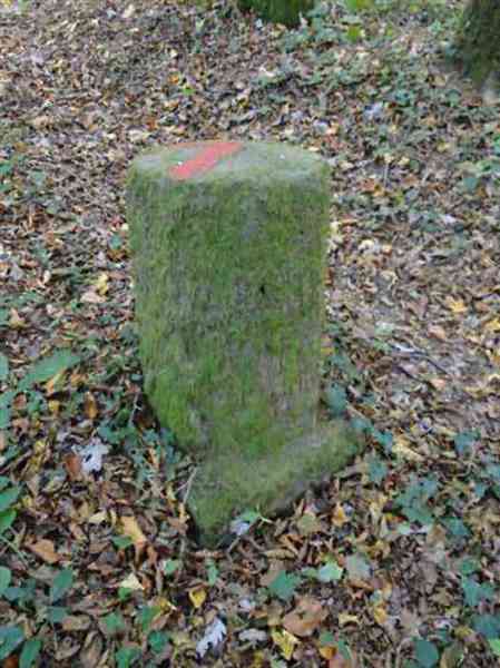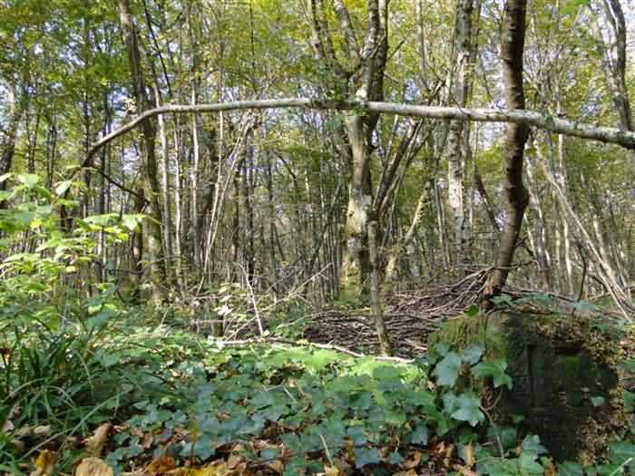 Batterie 9 - Diese Batterie, die fast über dem Bosmont-Felsenmagazin liegt, ist noch deutlich sichtbar. Die Oberseite ihrer Querbalken befindet sich auf Höhe des umgebenden Waldes. Sie war für vier 120- oder 155-mm-Geschütze ausgelegt. Wir haben dort kein Mauerwerk entdeckt. ▼
