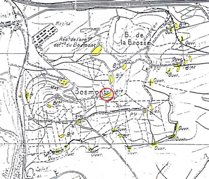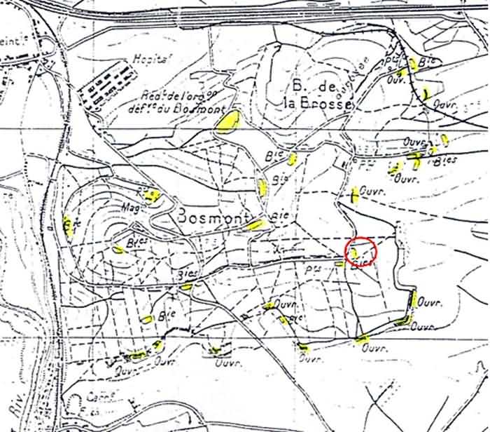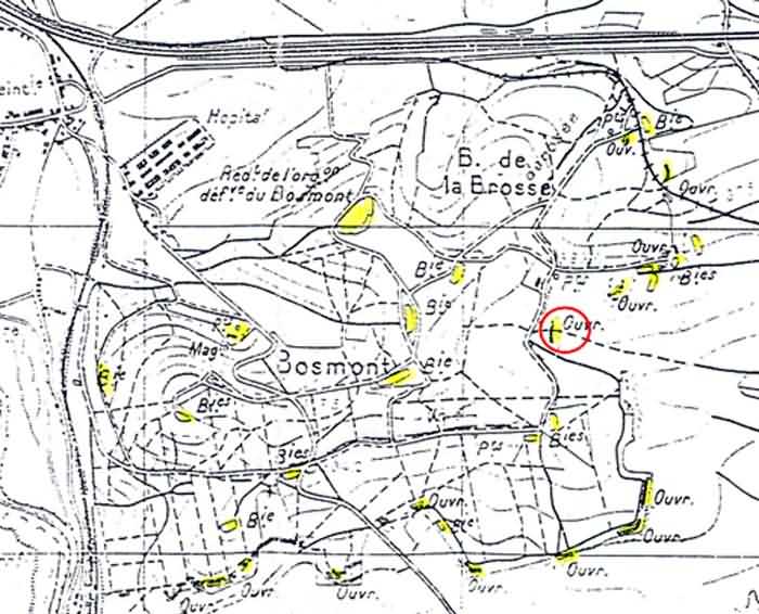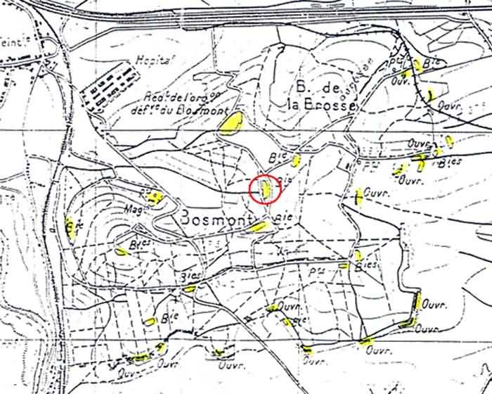 Camp retranché de Belfort, sud-sud-est de la ville. Culmine à 406 m/alt. Lors du siège de 1870-71, les Prussiens avaient installé des batteries en lisière nord du bois du Bosmont afin de s’en prendre aux redoutes des Perches. Dès 1874, il fut convenu d’occuper ces emplacements ce qui permettait d’éloigner l’éventuelle future ligne d’investissement de la place de Belfort. Le relief et la couverture boisée rendit très vite impossible de confier à un seul ouvrage de fortification permanente ces quelques 2,5 km² couverts par les bois du Bosmont et de la Brosse. La construction du réduit s’effectua sans tarder (voir réduit du Bosmont) tandis que les bois à l’entour allaient rapidement grouiller de chantiers. Pour l’essentiel, ce furent des retranchements d’infanterie et des batteries pour moyen (90 ou 95 mm) et gros calibres (120 ou 155 mm) uniquement faits de levées de terre que l’on disséminera tant en lisière qu’au cœur de ces bois. Pour accueillir les effectifs nécessaires à l’occupation de tous ces ouvrages, pas moins de quatre surfaces furent consacrées à des camps. Nous n’avons pas d’information sur ces derniers, mais il y a fort à parier qu’il se soit agi de camps de tentes. Chaque camp était supposé avoir un puits d’eau potable à sa proximité. Force nous est constater que les sources sont contradictoires quant au nombre de batteries et d’ouvrages. Ce nombre oscille entre 12 et 18 pour les premières, entre 13 et 21 pour les seconds ; tandis que les puits auraient pu être six. Lors d’une conférence, en date du 14 mars 1885, il fut question de renforcer la position. Un fort, d’environ le double de la surface du réduit allait être construit (voir fort du Bosmont) 250 à 300 mètres en avant de ce dernier. Aux flancs de ce fort se raccorderaient deux chemins couverts dont la branche nord se rattacherait à une redoute d’infanterie (pour 1 compagnie) placée tout contre la voie de chemin de fer, face vers Bâle et la branche sud se rattacherait à la voie de chemin de fer de Morvillars, non sans avoir été interrompue par quatre batteries. Le réduit et une dizaine de batteries auraient été abandonnés tandis que la grande majorité des retranchements d’infanterie devait être améliorée. Le 6 mai 1885, on envisage pour ce faire une dépense de 1 200 000 francs dont 100 000 en acquisition de terrains. Affiné, le projet propose l’abandon du réduit et de 8 batteries, d’en conserver 1 en l’état, d’en construire 2 nouvelles et d’en transformer 3 en redoute d’infanterie. L’abandon de certaines batteries devant être partiellement compensé par l’artillerie du nouveau réduit qui se monterait à 15 pièces. Bien évidemment, nous nous sommes rendus sur place pour tenter de tirer tout cela au clair (10/2010). Première constatation, ni la redoute du chemin de fer de Bâle, ni le nouveau fort/réduit ne sont sortis de terre. Après avoir perdu pas mal de temps dans la partie est du bois de la Brosse où les chemins et sentiers s’enchevêtrent et où le sous-bois n’est qu’une succession de creux et de bosses difformes, nous n’avons rencontré qu’une seule batterie bétonnée (voir batterie du Proc). Avec certitude, nous en avons retrouvé dix autres, toutes en levées de terres et plus ou moins bien dessinées. Une, pour 3 pièces lourdes, était même précédée d’un profond fossé non revêtu. Sur ce nombre de 10, 6 étaient destinées à des pièces lourdes. Dans le détail cela donne 1 batterie pour 2 pièces, 1 pour 3 pièces, 1 pour 6 pièces et 3 pour 4 pièces. Les 4 batteries restantes étaient toutes prévues pour 4 pièces de moyen calibre. Des prétendus 6 puits, nous n’en avons trouvé qu’un seul, mais nos recherches doivent être approfondies à la lumière de documents reçus après notre visite sur place. Les retranchements d’infanterie sont nettement plus difficiles à discerner et plutôt que de tirer des conclusions partielles à leur encontre, nous affinerons ce texte après une seconde journée qui leur sera consacrée. Quoi qu’il en soit, la ligne principale fut reportée en avant avec, d’ouest en est, les ouvrages des Fougerais, de Meroux, le fort de Vézelois et les ouvrages des Grands Bois et de Chèvremont. Les bois du Bosmont et de la Brosse sont ouverts au public et très agréables à parcourir.