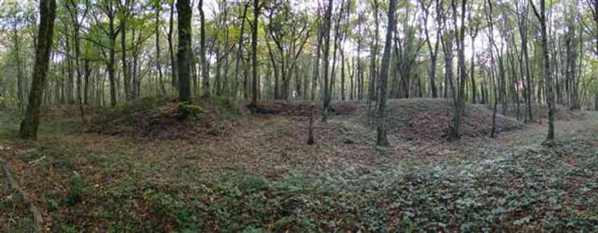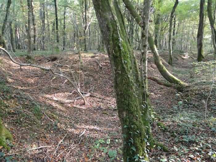 Retranchement 2 - Ouvrage d'infanterie se limitant à un simple parapet longiligne bien affaissé aujourd'hui, ce retranchement est discernable entre tous parce qu'un chemin forestier le coupe en deux perpendiculairement. ▼
