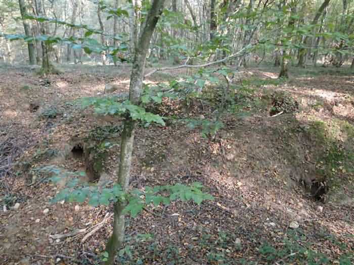 Battery 4 - The first of a group of two batteries, it was designed for four 90 or 95 mm caliber guns. At the forest path to its rear is a long embankment that we have not decided to identify as an entrenchment. The battery, facing southeast, is today occupied by a family of badgers (Meles meles) that should be left alone. ▼