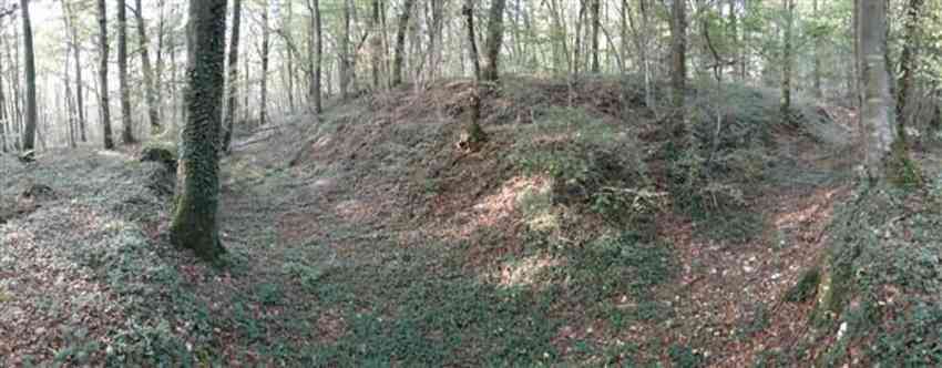 Entranchement 2 - An infantry fortification limited to a simple, long, and now very sagging parapet, this entrenchment is easily discernible because a forest path cuts it in two perpendicularly. ▼