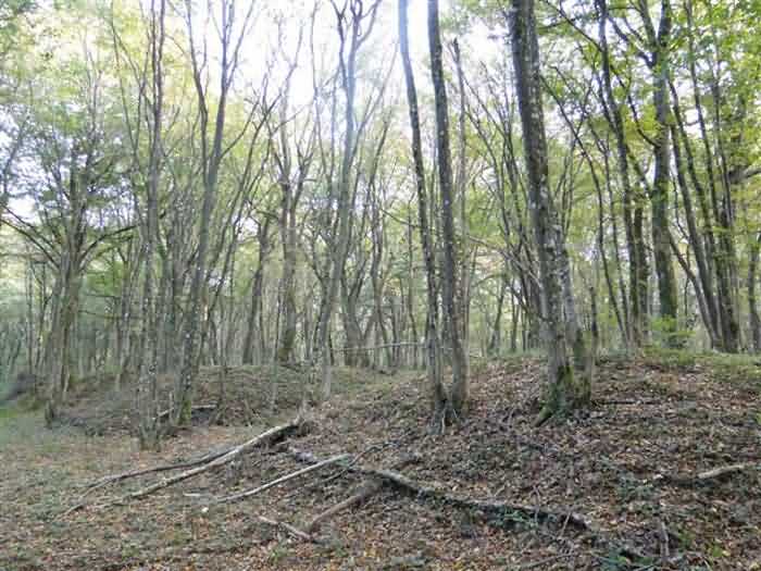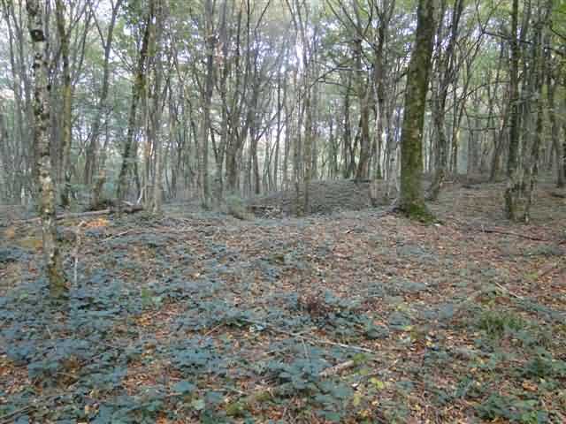 Batterie 2 - Proche de la batterie 1 mais avec un axe de tir braqué sur l'ENE, cette batterie était prévue pour du gros calibre, soit 4 x 120 ou 155 mm. Très bien défilée, elle est bordée sur ses devants par un chemin forestier se situant au niveau du sommet des traverses. Nous n'y avons décelé aucune maçonnerie. ▼