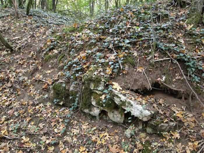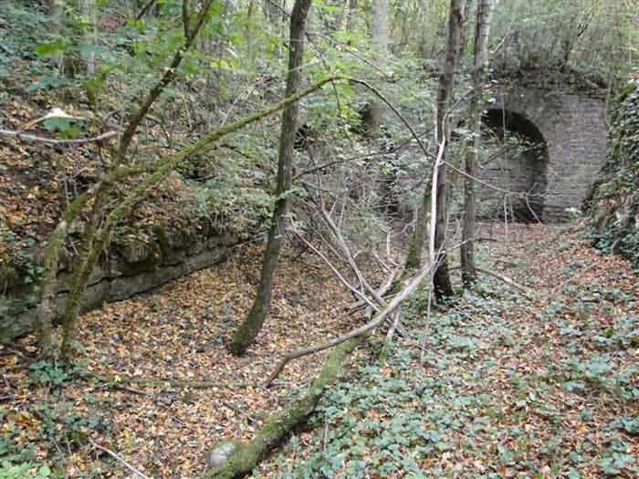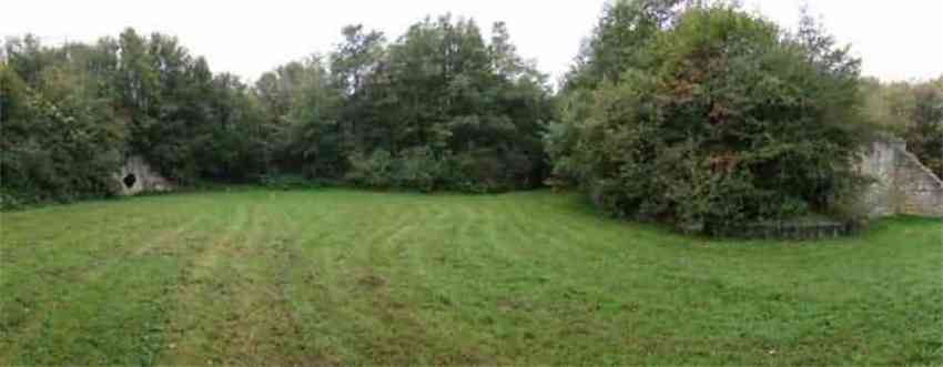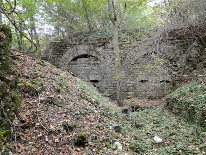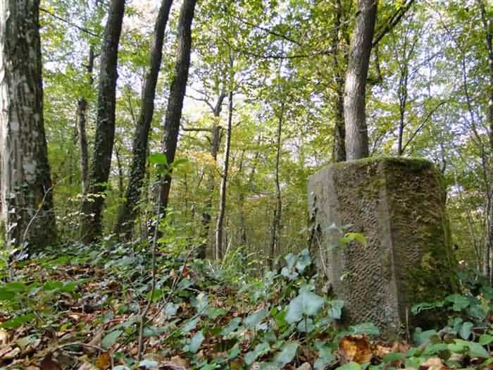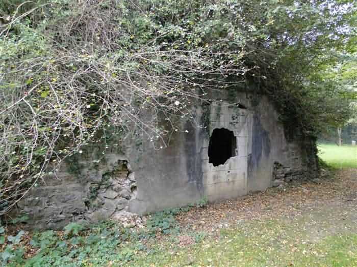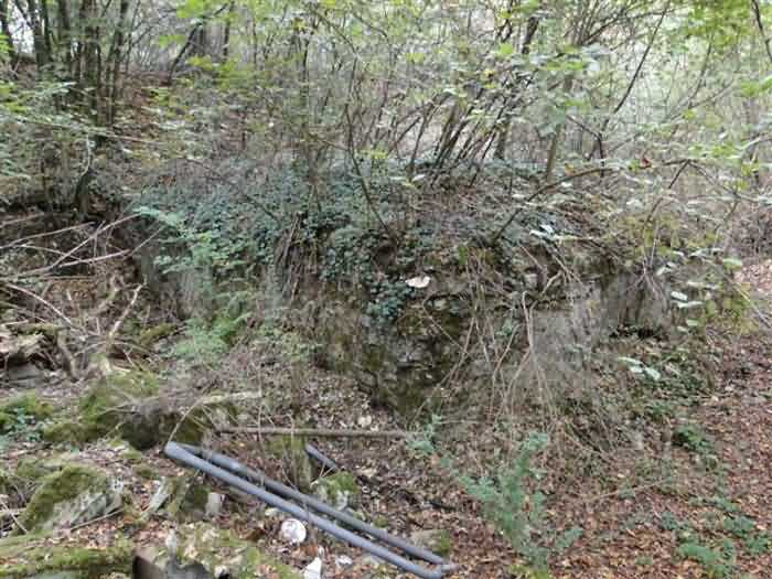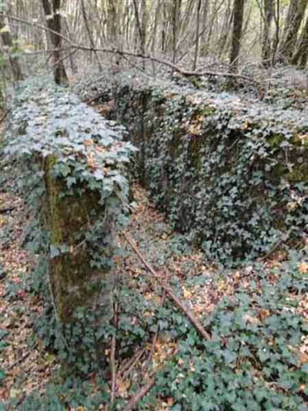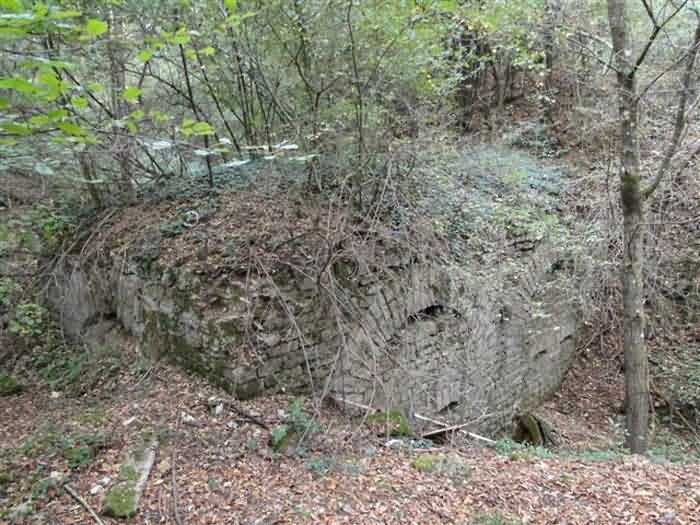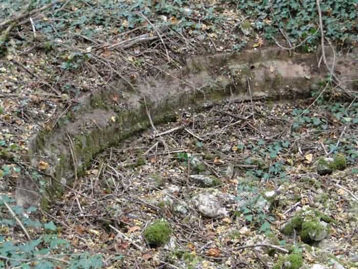 Belfort fortified camp, SSE of the city, 1874-1875. 380 m alt. 51 men and 11 guns. Called ouvrage Amey. This ouvrage, as its name indicates, is the redoubt of the defensive organization of Bosmont. It is a fairly small structure, pentagonal in shape with a reveted escarpment and counterscarp. The entrance, without a porch, consisted of two pilasters. Two crenellated walls extend towards salients I and V, but which, curiously enough, do not follow the line of the escarpment. Thus, they join fronts I-II and IV-V a few meters behind the salients. This is a variation of what we observed at the battery of Sermenaz in Lyon. The entrance to the redoubt was located approximately one-third of the way down the gorge. Once through, there was a guardhouse on the left (now gone) and a long, slender building on the right. We are then in one of the two courtyards of the fortification, the second being on the right, on the other side of a very long traverse practically cutting the fortification in two and having served as a magazine for powder and projectiles. From each of these courtyards, we can access a double caponier (salients II and IV). These caponiers have the particularity of having only right angles. No curves enhance their austerity. They are very small and can only be used for musketry. The one in salient II has its embrasures slightly set back from the front wall, while its opposite has these same embrasures advanced to the height of the facade. Behind front II-III is a shelter traverse much wider than that behind front IV-V. The Bosmont redoubt has suffered many insults. Its ditches are largely filled in, especially the gorge one. Earth had been pushed in front of the accesses to the caponiers but during our visit (10/2010), their settlement allowed passage. The traverses had been walled up, but all these walls are pierced. Only the elongated barracks remain inaccessible, but photos taken from the firing loopholes show nothing interesting except the brick vaulted ceilings resting on metal beams. The premises of this barracks are also quite cramped and their ventilation rather haphazard. We note that on the II-III front, two tanks for anti-aircraft guns and a small concrete shelter were sunk, perhaps during the First World War. The shelter is now bordered by a fitness trail and open to all winds. See also Bosmont (defensive organization of) and Bosmont (fort of).