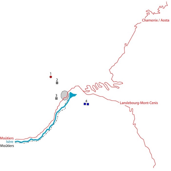 Dept 73 (Savoie) An vorderster Front gegenüber Italien liegt das große Dorf Bourg-Saint-Maurice etwas unterhalb der Zusammenkunft eines von Italien kommenden Passes, des Kleinen St. Bernhard, und der Straße von Briançon und Modane über Val D'Isère und den Col de l'Iseran. General BERGE verdankt man um 1880 nicht nur die Schaffung der Alpentruppen, sondern auch, fortan die Alpen nicht mehr als für eine Armee unpassierbar, sondern vielmehr als ein mögliches Schlachtfeld zu betrachten. Zu diesem Zweck verlagerte er die Verteidigung vor die Festungen von Albertville und Chamousset und zog es vor, geschickterweise die engen Engpässe der Grenzpässe zu verteidigen. In Bourg-Saint-Maurice finden wir 1 Fort, 4 Batterien, 1 Redoute und 1 Blockhaus + 5 Baracken: von Séloges (1890-1891 – 06/2006: durch Witterung zerstört, es bleiben die Fundamente, der Brunnen und ein Kanal, sowie ein Privatgebäude am Straßenrand), vom Chapieux (1890-1894 – 1931 durch eine Lawine zerstört und nach dem Zweiten Weltkrieg von einer weiteren vernichtet), von Veis (1894 – 06/2006: durch Witterung zerstört, man findet nur die Fundamente), vom Plan du Repos (1898-1899 – 06/2006: geschleift) und vom Roc Noir (1904-1905 - 06/2006: es bleiben nur einige Barackenfundamente). Manchmal wird die ruinierte Redoute auch als Baracke Capitaine Desserteaux bezeichnet. Der Großteil dieser Anlagen befindet sich am rechten Ufer der Isère, mit Ausnahme von 3 Batterien, die 1914 angesichts der Unentschlossenheit der Italiener bezüglich der Wahl ihrer Seite eilig errichtet wurden.