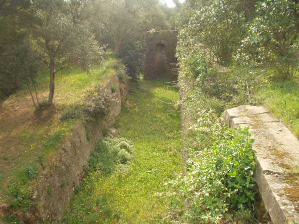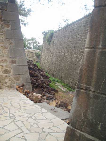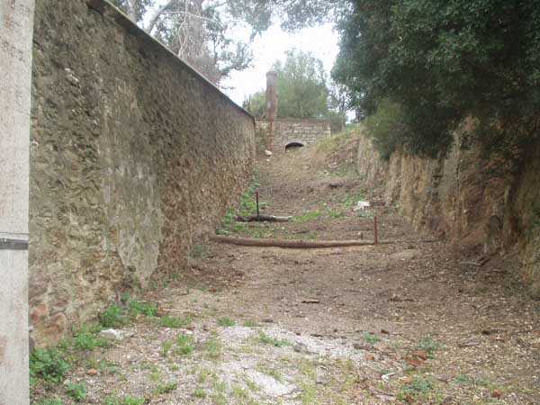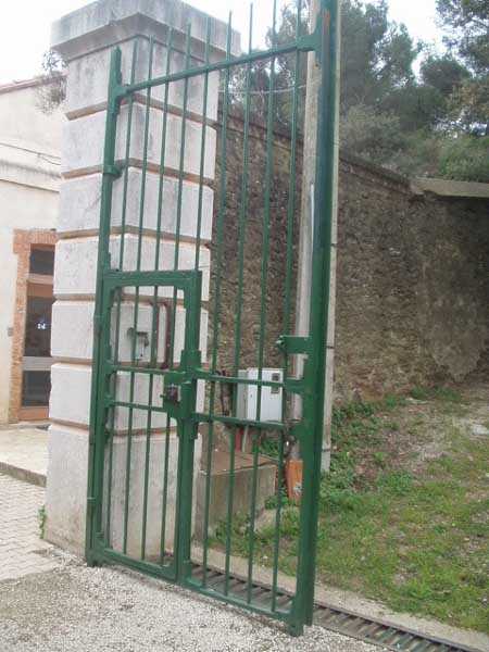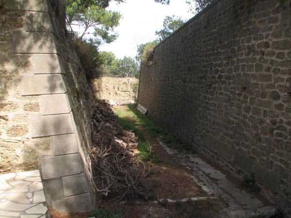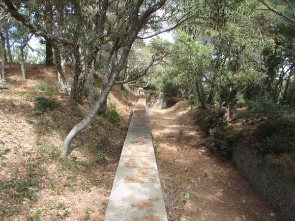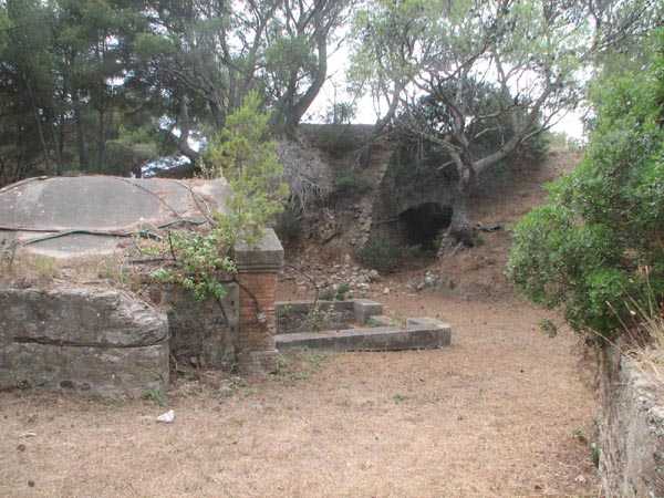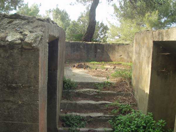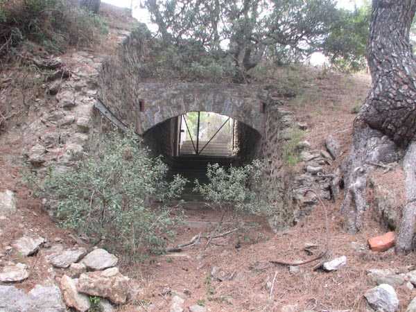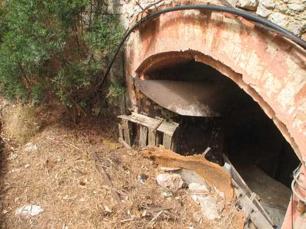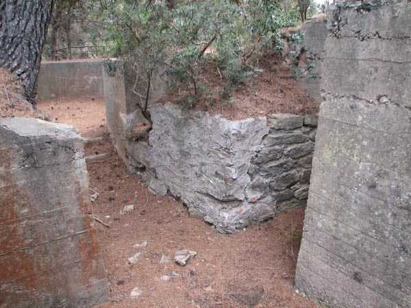 Die Batterie (Juli 2006) - Detail des Lastenaufzugs, immer noch in sehr gutem Zustand in der nördlichen Traverse. Es fehlen nur die Kabel für eine gute Wiederaufnahme des Dienstes. Einige Ansichten des überdachten Gangs, seines Unterstands und des Feuerleitpostens in der verbotenen Zone.