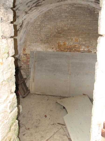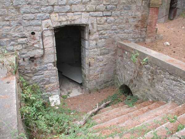 De batterij (juli 2006) - Detail van de goederenlift nog steeds in zeer goede staat in de noordelijke traverse. Er ontbreken alleen de kabels voor een goede hervatting van de dienst. Enkele zichten op de overdekte doorgang, zijn schuilplaats en de vuurleidingspost in de verboden zone.