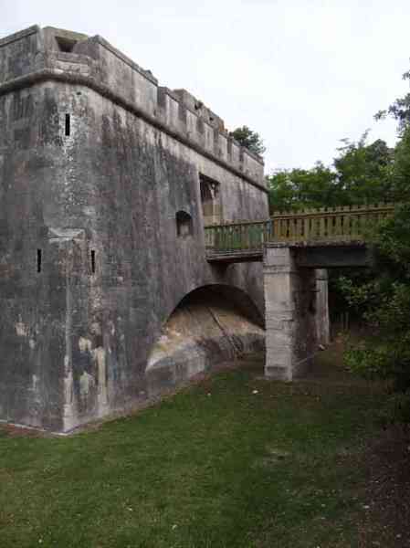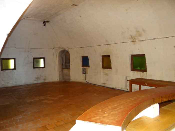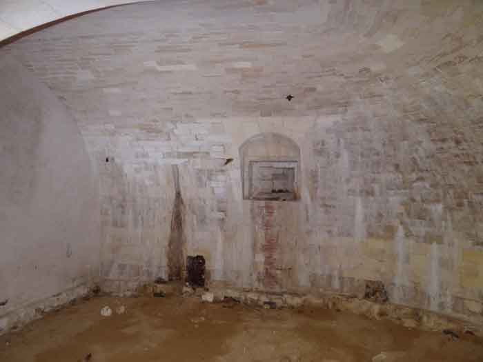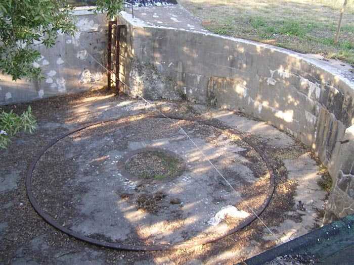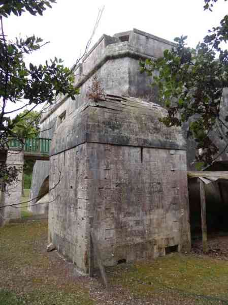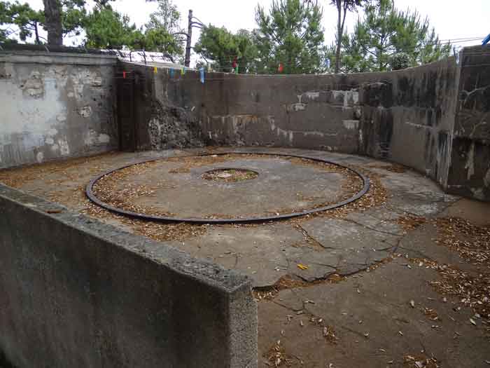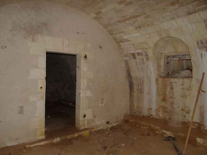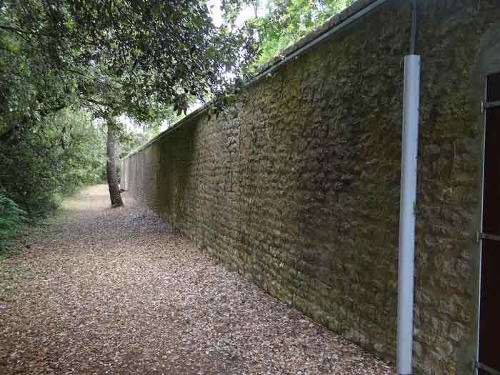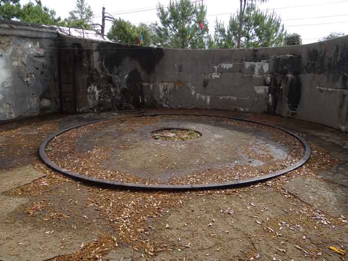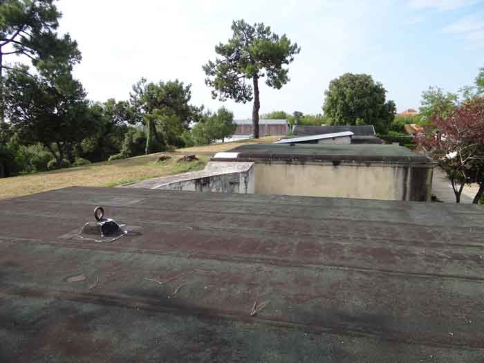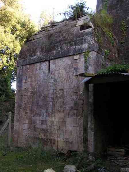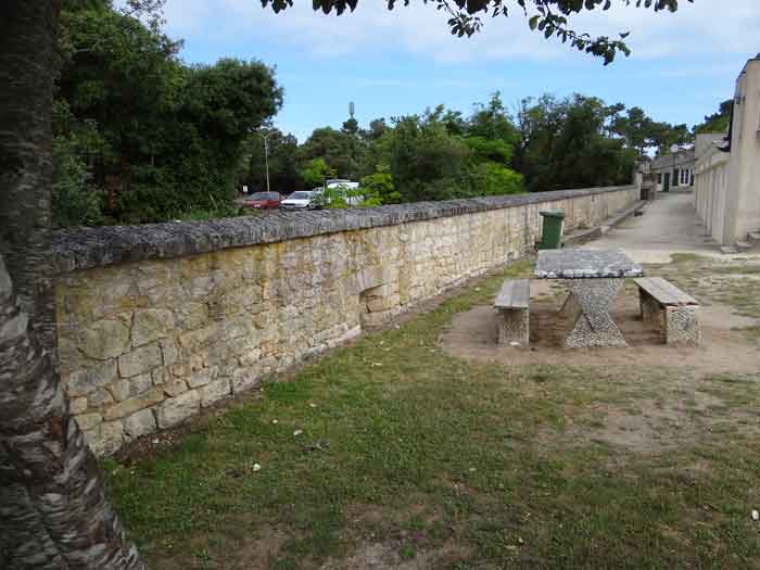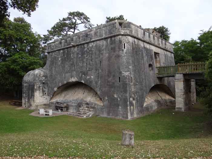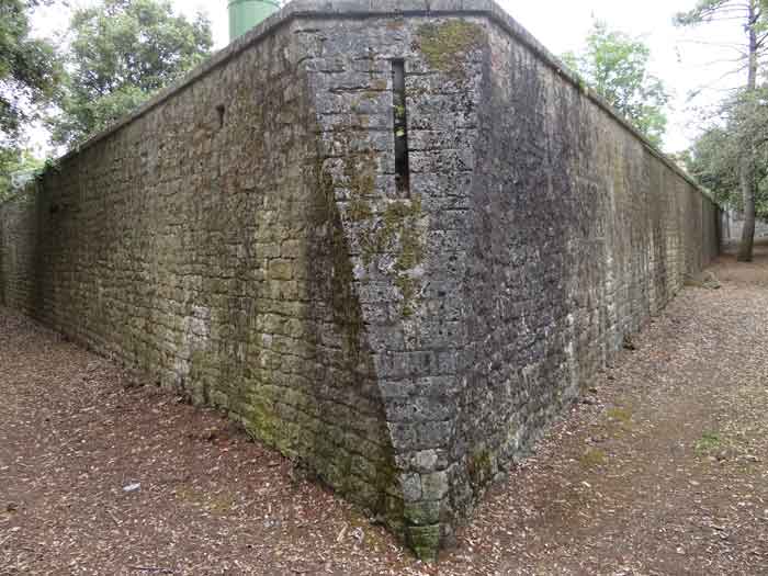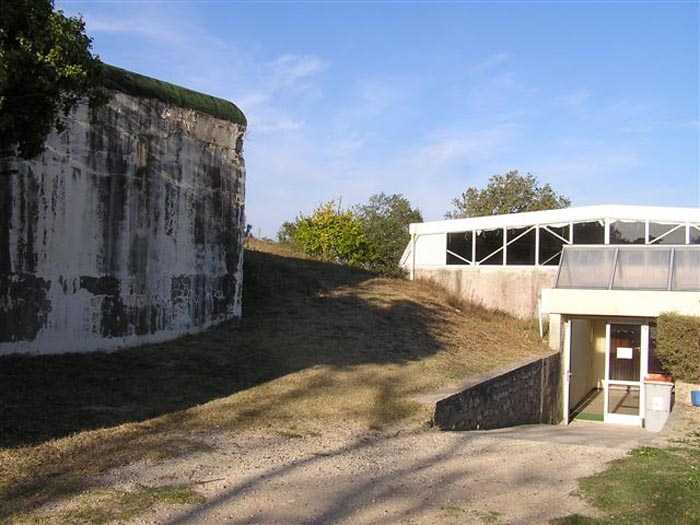 Fortress of Rochefort, north-eastern point of Oléron Island, 1877-1880. Bombardment battery found mentioned only once, and very succinctly. It is located behind the Pointe de la Perrotine. Provided with an enclosure with defensive bastionnets, it takes the shape of a large chevron, each branch of which was to accommodate between traverse-shelters, at least four guns. Its firing steps housed 24 c guns on P.C. mounts. One of the ladders allowing access to the top of the parapet is still sealed in an alcove. The concreted traverses, on the other hand, are completely disfigured. This concreting indicates that the fire crest was recast after 1889. The enclosure, with a semi-detached scarp (breast wall), remained masonry. The battery now houses (09/2007) a holiday center and it is advisable to request permission to enter. To the right of the battery, on the shoreline, was the interior and ignition post for the line of 47 bottom torpedoes that blocked, at the level of the Fort des Saumonards, the passage south of the Boyard shoal. This post was ideally to be doubled with a photoelectric post, but we do not know if anything remains of it. Finally, note to the rear of the battery a very curious tower Model 1811 No. 1 whose flanks are fitted with a single huge foot embrasure and to which two double caponiers have been added, placed on the same diagonal. The construction of this tower was hardly carried out at a rapid pace since started in 1812, one had to wait until 1849 to see it provided with its drawbridge and crowned with a crenellated parapet. This tower constituted the reduit of a battery, a battery which was succeeded by the new battery that motivated the writing of this present short article. The tower is still in very good condition today.