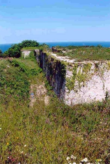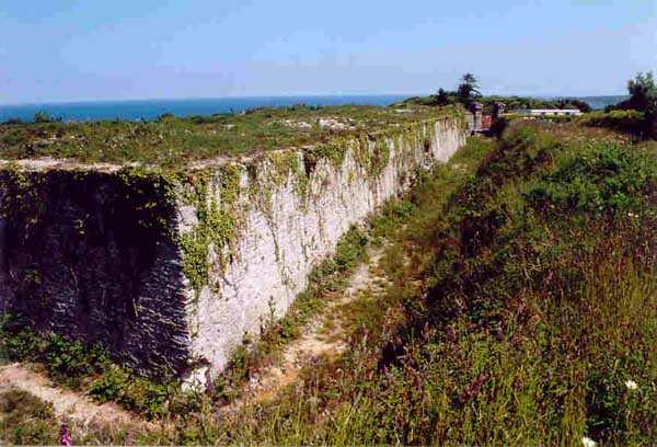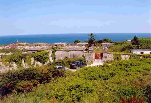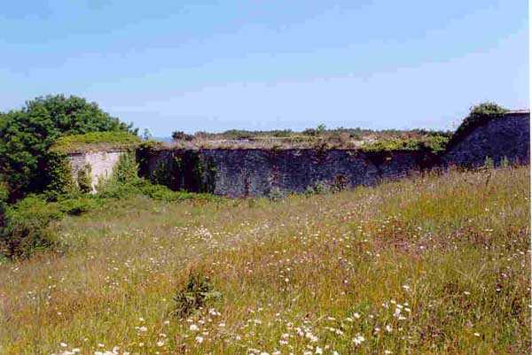 Fortress Cherbourg, ENE of the town, 1878-1880. 75 m/alt. Large coastal battery with views encompassing the entire Cherbourg harbor to the west as far as Cape Lévi to the east. The gorge and the flanks are protected by a ditch whose counterscarp is only lined near the entrance. The scarp is semi-detached. The entrance is from the center of the gorge, which takes the form of a chevron with a single half curtain wall on the left, which ensures the perpendicular defense of the entrance. Curiously, the perpendicular defense of the left half-front of the gorge is non-existent. The head front follows the sheer drop of the cliff. Its first armament consisted of 2 x 19 c and 6 rifled and fretted 22 c howitzers. A fire plan from 1881 provides information in the 8 x 24 c enclosure. A barracks of three bays, the central one being composed of two magazines, is located opposite the I-II front. The same fire plan provides information both to the left and to the right of the 4 x 95 mm battery. These were only simple shoulders, later replaced by the annex battery which will see the light of day a little to the east of the battery. In 1910, this battery will be reworked and will now include 4 x 240 T.R., separated by concrete bunkers model 1904. The front will be equipped with two large fire director positions, identical to those found to the right of the high battery of Nacqueville, therefore, of French construction from the interwar period. Still well clear of vegetation (06/2005), this battery is worth the detour not only for itself, but also for the panorama that one can discover from its location. As it is privately owned and inhabited, we were unable to visit it.