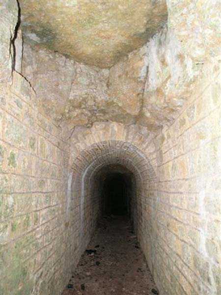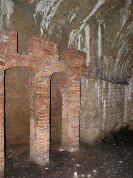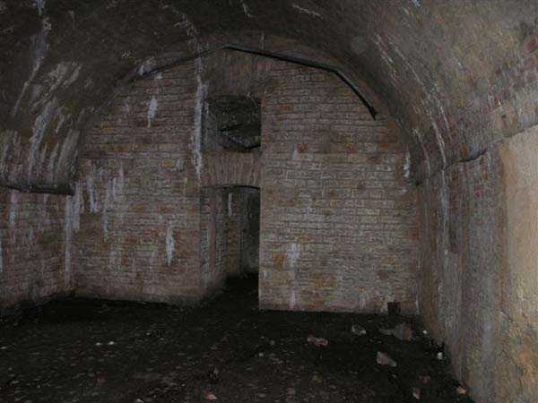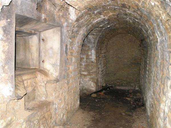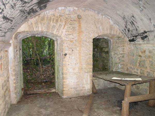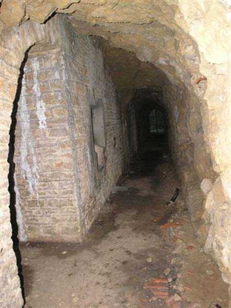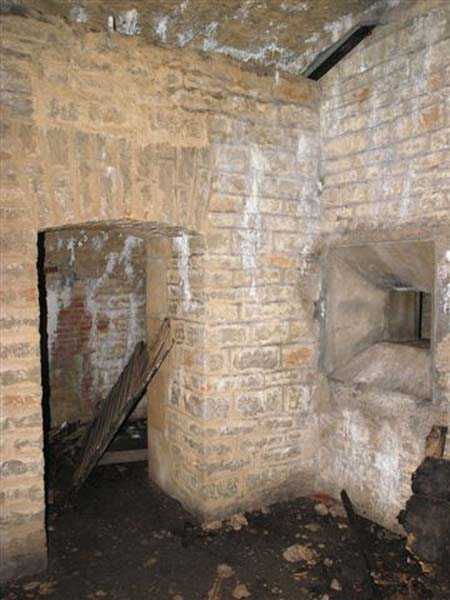 Fortress Langres, west of the town, ± 1890. 440 m/alt. Powder magazine, under rock, second echelon, 200 m north of the structure of the same name. A surrounding wall frames an area of approximately 40 x 13 m supported along its length by a rock face. A gate watched over from the outside by a guardhouse dug into the rock and consisting of a single room of 5 x 4.5 m, still has its original grilles. Once through this gate, the rock face, on the right, reveals three roughly equidistant entrances. These open onto three parallel galleries with a length of respectively and from left to right, 34, 34 and 25 m. These galleries are connected transversely, from their ends. The one on the left to the power station via a compulsory passage in a storage room of 11 x 4 m, a room framed by two airlocks with lamp crenellations. During the excavation of this room, a pocket of friable rock probably had to be evacuated along its length because brick pillars had to be raised to rectify the side and support the sheet metal umbrella (now gone). Between the central gallery and the one on the right, we find a corridor about ten meters long with three niches (2 small and one large - 2.2 m long - the latter for fireworks), followed by a room of 7 x 4 m in the center of which, across the width, a thick masonry arch supports the ceiling resting on two concrete piers. Two lamp crenellations frame this room. Parallel, or almost, to this last room, the gallery on the right shows what is more likely the collapse of a cavity in the rock than the beginning of the excavation of a third room. In this cavity a beautiful stalagmitic drapery is concreting (10/2007). Better known as the "Brevoines powder magazine", this store, devoid of tags but very damp, is closed by the Conservatoire du Patrimoine Naturel de Champagne-Ardenne (C.P.N.C.A.).