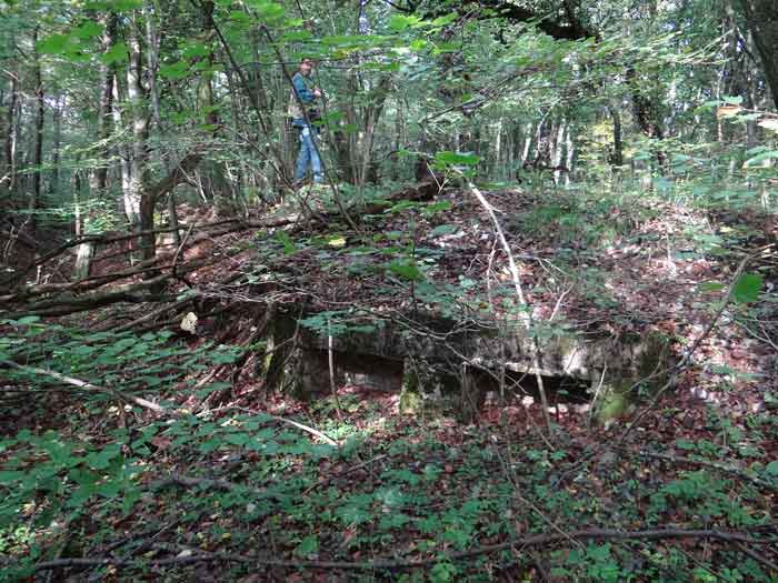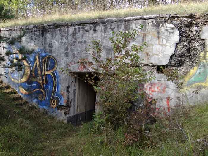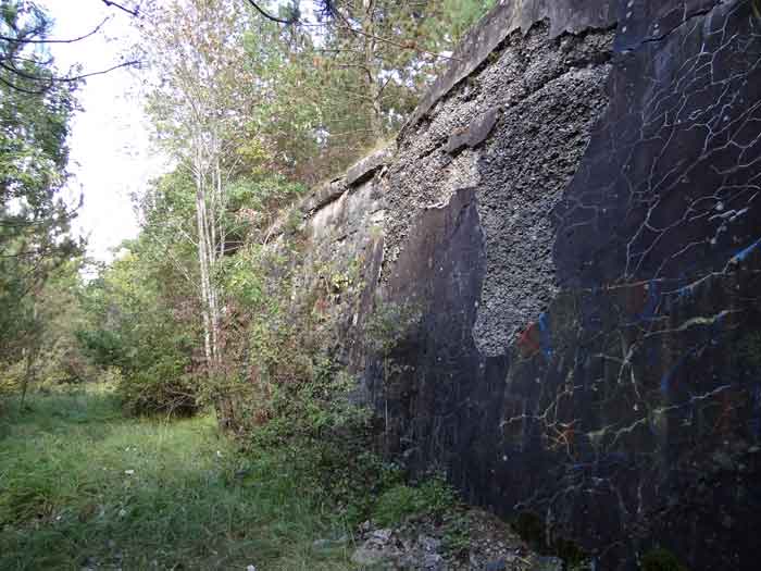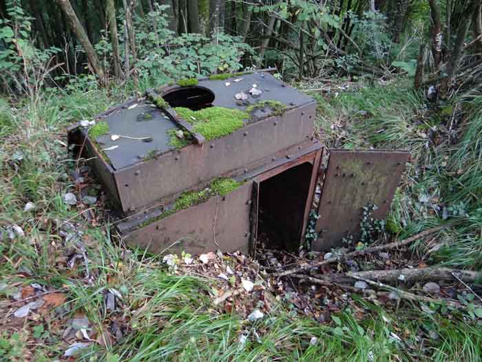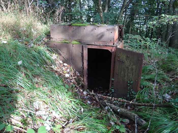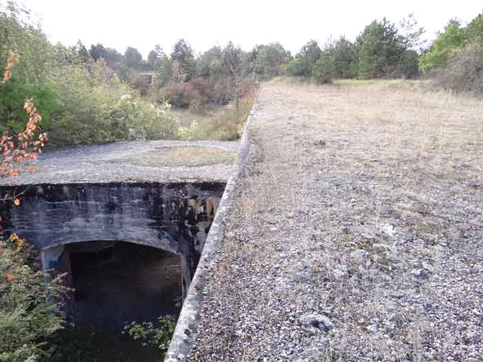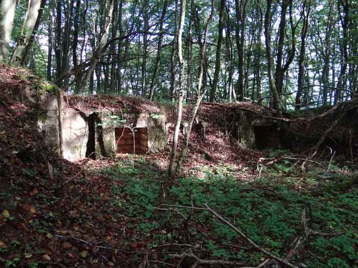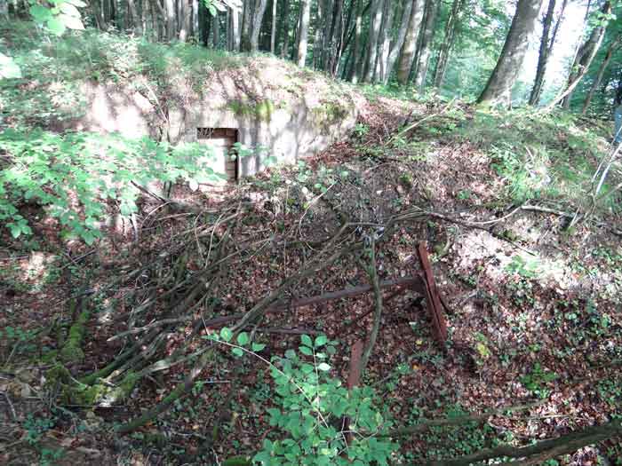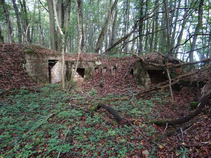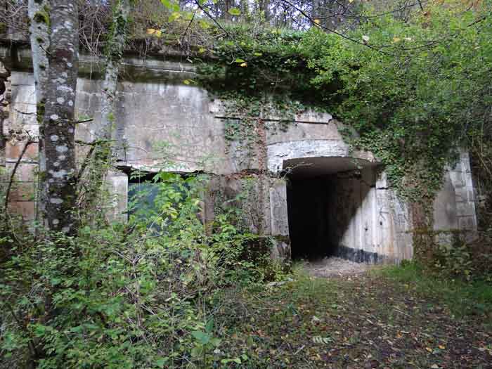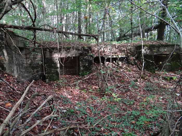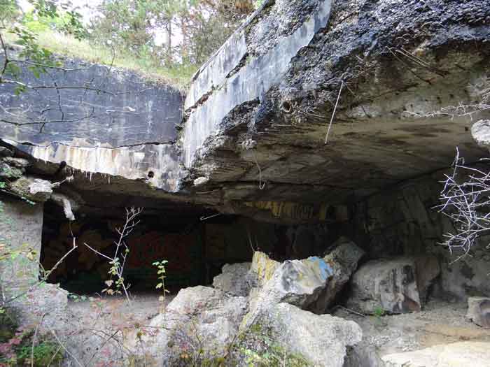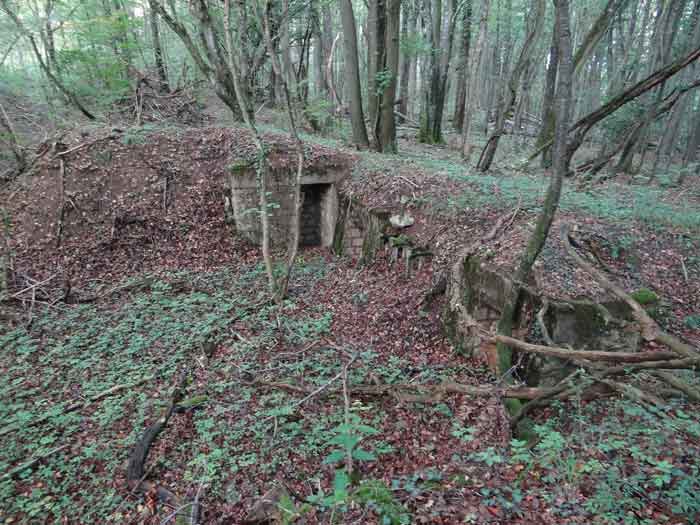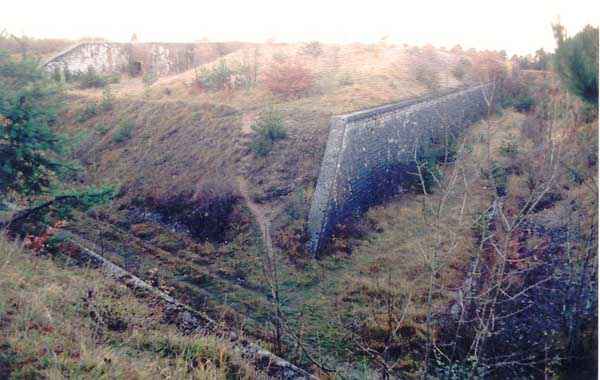 Toul fortified camp, NNW of the city, 1885-1887. 383 m/alt. Called fort Pully. The Bruley post was trapezoidal in shape, with fairly narrow lateral fronts, barely fifty meters wide. The barracks overlooking the gorge were preceded by a ravelin that served as a genuine half-moon. It aligned twice with four casemates separated by the entrance to the capital. To the right and left of this barracks, a small semicircular projection was responsible for defending the gorge. The defense of fronts I-II and II-III was entrusted to a double caponier at salient II, while that of front III-IV was entrusted to a wing at salient III. The capital of the post overlooked a covered passageway leading to a rampart street completely devoid of shelter traverses and even artillery platforms. It was therefore only an infantry redoubt. From 1904, the post was completely redesigned and transformed into a real fort. Only the barracks casemates were preserved, which were located right in the new perimeter of the fort, parallel to front II-III. The new fort, trapezoidal, became a parallelogram, the two lateral fronts being parallel. This being the head front being broken, we end up with five fronts. Only the gorge escarpment was concreted, those of the other fronts being made of flowing earth. On the other hand, the counterscarp of the other fronts was concreted while that of the gorge was made of flowing earth with a gently sloping ramp descending into the ditch at the height of the entrance. A defensive gate occupied the axis of the ditches. The entrance building is limited to very little: an entrance porch with a segmental arched vault and a defensive room to its left. After a bend, the entrance tunnel communicates with a new concrete barracks which was cast parallel to the III-IV front. Seven magazines/officer and non-commissioned officer barracks and three large troop barracks thus form a concrete mass in the center of the fort. From this mass one can reach all the organs of the head fronts by concrete ducts, in its view, from left to right: a single counterscarp box at salient II and an armored observatory beyond the old barracks preserved in its original state; a machine gun turret and a double counterscarp box at salient III; a 75 Mle 05 turret and a simple counterscarp vault at salient IV and, finally, a simple counterscarp vault at salient V. Only the Bourges casemate behind salient I and facing due south could not be reached without going into the open air. The overhaul was completed in 1907 and a final armored observatory was installed in front of the 75 turret. We visited it in November 1996 and it was already in quite poor condition and all its vaults having been used for explosives tests no longer had a facade. That being said, the taggers had spared it. According to the latest news (07/2007) it is still abandoned and in addition to a profusion of ungodly tags, motocross is practiced there, which is probably not the most recommended activity for the preservation of the site.