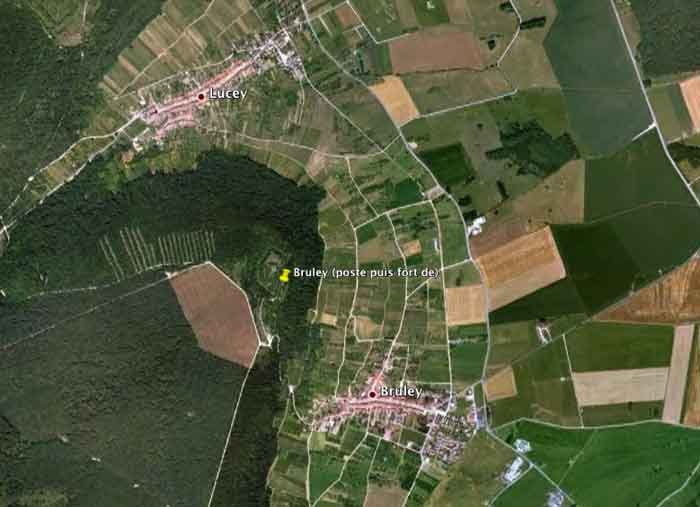 Versterkt kamp Toul, ten noordwesten van de stad, 1885-1887. 383 m/hoogte. Fort Trekhaak genoemd. De Bruley-post was trapeziumvormig, met vrij smalle zijfronten, amper vijftig meter breed. De kazerne met uitzicht op de kloof werd voorafgegaan door een ravelijn die dienstdeed als een echte halvemaan. Deze was twee keer uitgelijnd met vier kazematten, gescheiden door de ingang van het kapiteel. Rechts en links van deze kazerne was een kleine halfronde uitbouw verantwoordelijk voor de verdediging van de kloof. De verdediging van fronten I-II en II-III was toevertrouwd aan een dubbele caponnière bij saillant II, terwijl die van front III-IV was toevertrouwd aan een vleugel bij saillant III. De kapiteel van de post keek uit op een overdekte doorgang die leidde naar een walstraat, volledig verstoken van beschuttingsbruggen en zelfs artillerieplatforms. Het was dus slechts een infanteriesteunpunt. Vanaf 1904 werd de post volledig heringericht en omgebouwd tot een echt fort. Alleen de kazematten van de kazerne bleven behouden, die zich precies binnen de nieuwe omtrek van het fort bevonden, parallel aan front II-III. Het nieuwe fort, trapeziumvormig, werd een parallellogram, waarbij de twee zijfronten parallel liepen. Omdat de kopgevel werd doorbroken, houden we uiteindelijk vijf fronten over. Alleen de helling van de kloof was gebetonneerd, die van de andere fronten waren van vloeiende aarde. De contrescarp van de andere fronten daarentegen was gebetonneerd, terwijl die van de kloof van vloeiende aarde was met een zacht glooiend talud dat ter hoogte van de ingang in de gracht afdaalde. Een verdedigingspoort bevond zich in de as van de grachten. Het entreegebouw is tot zeer weinig beperkt: een entreeportaal met een segmentbooggewelf en een verdedigingsruimte links ervan. Na een bocht staat de entreetunnel in verbinding met een nieuwe betonnen kazerne die parallel aan de III-IV frontlinie is gegoten. Zeven magazijnen/officiers- en onderofficiersbarakken en drie grote troepenbarakken vormen zo een betonnen massa in het centrum van het fort. Vanuit deze massa zijn alle onderdelen van de frontlinie te bereiken via betonnen leidingen, van links naar rechts gezien: een enkele contrascarp-box bij saillant II en een pantserobservatorium achter de oude kazerne, bewaard in zijn oorspronkelijke staat; een machinegeweertoren en een dubbele contrascarp-box bij saillant III; een 75 Mle 05-toren en een eenvoudig contrascarp-gewelf bij saillant IV en, ten slotte, een eenvoudig contrascarp-gewelf bij saillant V. Alleen de Bourges-kazemat achter saillant I, pal naar het zuiden gericht, kon niet worden bereikt zonder de open lucht in te gaan. De renovatie werd voltooid in 1907 en er werd een laatste pantserobservatorium geïnstalleerd vóór de 75e toren. We bezochten het in november 1996 en het was toen al in vrij slechte staat. Alle gewelven, die gebruikt waren voor explosievenproeven, hadden geen façade meer. Desondanks hadden de taggers het gespaard. Volgens het laatste nieuws (07/2007) is het nog steeds verlaten en wordt er, naast een overvloed aan goddeloze tags, ook motorcross beoefend, wat waarschijnlijk niet de meest aanbevolen activiteit is voor het behoud van de site.