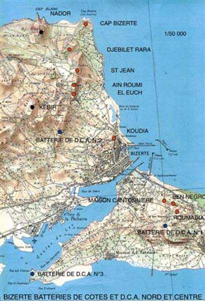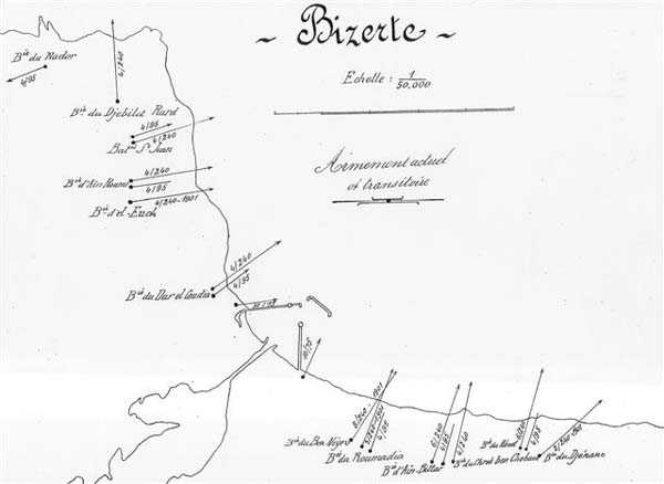 Tenslotte zullen 6 luchtafweerbatterijen, bewapend met kanonnen 75 mm CA Mle 22-24, de verdediging tegen vliegtuigen verzekeren, versterkt door 2 batterijen 90 mm CA Mle 32 SM. Al deze materialen zullen door de As-mogendheden in november 1942 buitgemaakt worden. Deze zullen bij hun vertrek alles vernietigen, behalve 4 van de 6 batterijen 75 mm Mle 22-24 en de batterijen 90 mm. Na de oorlog, waaruit ze geruïneerd tevoorschijn komt, wordt Bizerte, heropgebouwd en gemoderniseerd, hoofdbasis van de Vloot. In de sfeer van de Koude Oorlog zal de batterij van Remel opnieuw bewapend worden met 4 kanonnen 105 mm SKC 32. De strategische ondergrondse installaties van Kébir en Meslem blijven onvoltooid. Na de mislukte gewelddaad van president Bourguiba in juli 1961 verlaat Frankrijk Bizerte op 15 oktober 1963 en maakt daarmee een einde aan 82 jaar aanwezigheid, die het landschap definitief hebben getransformeerd. Tegenwoordig worden de ex-Franse installaties praktisch allemaal door het Tunesische leger gebruikt en zijn bezoekvergunningen quasi onmogelijk te verkrijgen. Een brug met centrale hefoverspanning is over het kanaal gebouwd, die de nachtmerrie van admiraal Ponty materialiseert… JJM 14/10/07