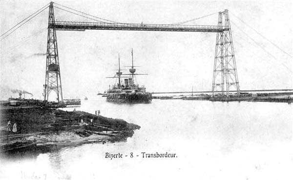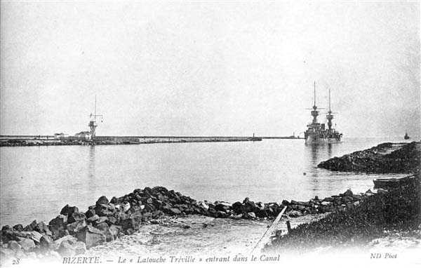 In 1881, through the Treaty of Bardot, France imposed its protectorate over Tunisia which, governed by a bey, had constituted since 1754 the Regency of Tunis, a pashalik of the Ottoman Empire. At that time, Lake Bizerte, with an area of 150 km², was separated from the sea by dunes and marshes over a depth of 2 kilometers. The fishing port, which still exists under the name "Old Port", is only an adaptation of the lake's outlet. When, on 1 May 1881, Admiral Conrand presented himself before Bizerte aboard the Galissonnière, the fortifications of the place included the enceinte built by Ali Pasha from 1740 to 1743, Fort Spain, the Ksibah, built under Charles V around 1540, which commanded the port entrance along with the redoubt of the Casbah, and a battery located on the road to Tunis. These defenses were without garrison, and a summons sufficed to have the city surrendered. As early as 1886, Admiral Aube, Minister of the Navy, requested the creation of a port and an arsenal at Bizerte and, on 16 November, an agreement was signed between the Tunisian government and Messrs. Hersent and Couvreux for the construction of 2 jetties and the excavation of a canal, 1500 meters long, 100 meters wide and 9 meters deep. These works, carried out with modern equipment, were completed between 1890 and 1896. During the same period, the arsenal and the town of Ferryville, now Menzel-Bourguiba, were built at the western end of the lake. This site, then called Sidi-Abdallah, was chosen because of the 15 kilometers separating it from the canal entrance. This distance placed it well out of range of the naval artillery of the time. As nothing existed, the engineers were able to design a modern and coherent installation, comprising a basin of 5000 hectares, 4 dry docks, including 2 of 250 meters, workshops and stores, a pyrotechnics facility, a hospital and barracks. In 1898, a transporter bridge was put into service between the 2 banks of the canal. But the Navy was hostile to this device, fearing it might obstruct the canal if destroyed by a lucky hit during a bombardment. From 1899, under the energetic impetus of Captain Ponty, improvement works succeeded each other until 1906, attributed to Hersent. Thus undertaken were the construction of a 609-meter breakwater, the widening of the canal to 240 meters, the extension of the north jetty, dredging to – 10 meters in the canal and the outer harbour, and the construction of a base for submarines and patrol boats at Sétié-Meriem. To Ponty's great relief, the widening of the canal led to the dismantling of the short-lived transporter bridge, which was reassembled in Brest. From 1911, following various agreements and rights buyouts, commercial ships were evicted from the canal's berthing stations and relegated to Sebra Bay. The speed of warships in the canal was increased to 10 knots, and the Navy was at home in the lake, whose anchorage, with a depth of 10 meters, could accommodate 150 large modern vessels.