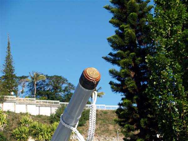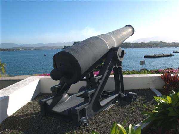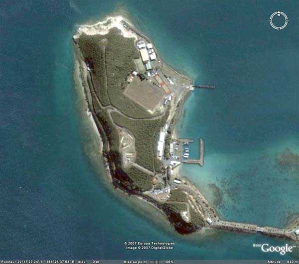 Nouméa. Cette batterie est établie au centre de l’îlot Brun, à la cote 44. Armée, comme la batterie de la Pointe Picard, de 2 canons de 16 cm Mle 1858-60 sur affût Mle 1847, elle est une des trois défendant à l’origine l’entrée de la petite rade. Elle fait face à la batterie de la Pointe Desnouel. Elle est déclassée en 1896, et il est un moment question de la réarmer avec 4 canons de 16 cm Mle 1881. Ce projet n’a pas de suite. De nos jours, l’îlot Brun a été réuni à la pointe Chaleix, et l’ensemble abrite la base navale de Nouméa. L’ouvrage de l’îlot Brun est inaccessible, car il abrite des installations sensibles de la Marine nationale. Mais les images satellitaires montrent un site complètement transformé, et complètement nivelé, où il ne reste vraisemblablement plus grand-chose à voir. Les canons ont été récupérés, malheureusement sans leurs châssis, et montent la garde au pied du mat du pavillon de la base navale. À noter la présence insolite, à proximité des appontements, d’un canon allemand de 10,5 cm SKC/32, absolument impeccable, et muni de sa tape de bouche et de ses dispositifs de pointage. JJM 30/06/07