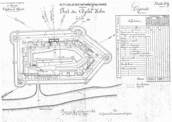 In 1907, consideration is given to building on Djebel Dekounia, 10 kilometres from Sidi-Abdallah, a work that would finally solve the problem of the defence of the arsenal. The planned armament then includes 2 disappearing turrets for 2 75 mm R guns, 2 disappearing turrets for 155 mm R guns and 2 disappearing turrets for 2 machine guns. But the adoption of 2 cupolas for 155 mm short guns is recommended, in preference to disappearing turrets. This project will not be carried out, and the problem of the defence of the arsenal is never resolved. In 1939, the defence of the land front is provided by 6 positions, built between 1930 and 1939: