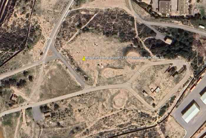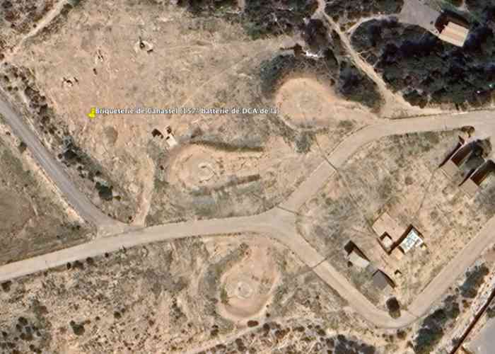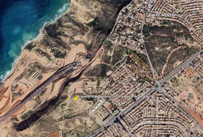 Oran. Position de la batterie de DCA 157/411 de la guerre, établie à 2 kilomètres au sud de la batterie du Canastel. Elle est armée de 4 canons de 75 CA Mle 32 et de 2 canons de 20 Oerlikon. Du 8 au 10 novembre 1942, elle exécute de nombreux tirs contre avions, puis contre la terre. Elle cesse le feu sur ordre, le 10 à 12 heures 30. Elle consomme 1438 coups de 75. Elle est bien visible sur les vues satellitaires, et la vocation du site ne semble pas avoir changé, puisqu’on y distingue nettement une batterie de missiles sol-air. JJM 10/08/2008