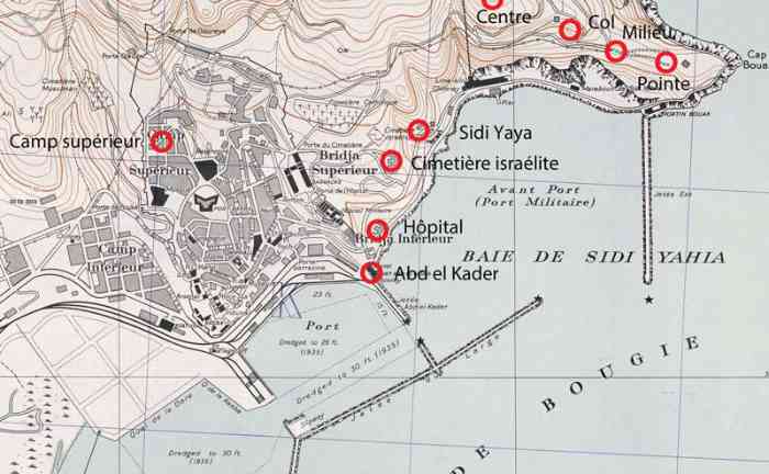 In 1914 werd de kustverdediging van Bougie verzorgd door vijf batterijen: Abd el Kader, Camp Supérieur, Centre, Cimetière Israélite en Hôpital. In 1940 waren het er nog maar twee, Bouak en Abd el Kader. © JJM 22/01/2026