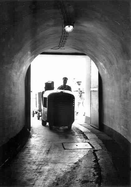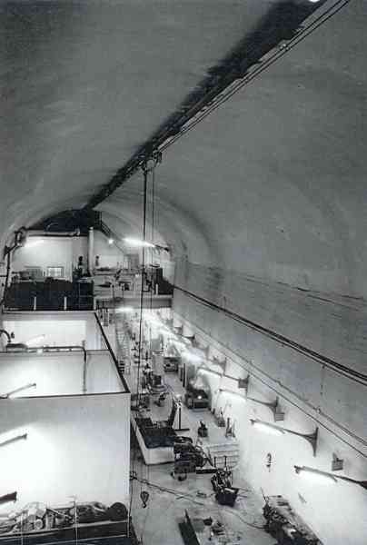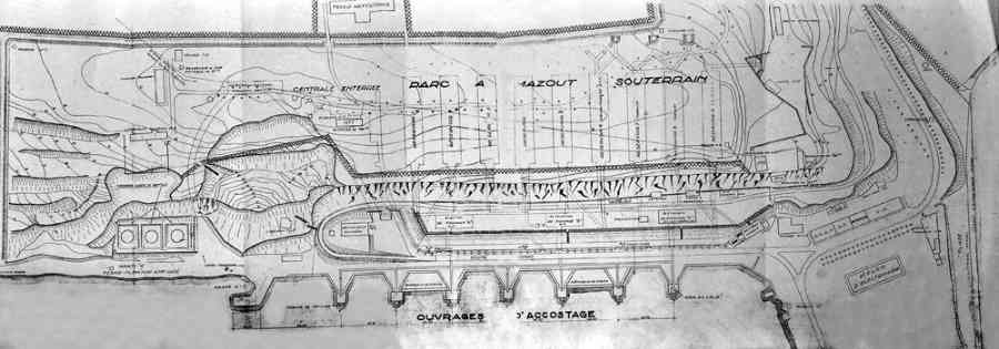 Ce parc souterrain, semblable à celui de Brécourt à Cherbourg, réalisé peu avant 1939 sur la rive sud du canal, disposait à l’origine d’une capacité de 90 000 m3 de mazout, répartie dans neuf réservoirs. Les navires à ravitailler disposaient de trois postes à quai par fond de -12 mètres. Sa capacité a par la suite été réduite à 50 000 m3, trois alvéoles souterraines ayant été transformées en atelier et magasin à torpilles, et une en station d’émission radio de la Marine, pendant la Guerre froide. L’établissement disposait en outre d’une centrale électrique de 4 500 kwh, et l’ensemble était protégé par une épaisseur de roc de 17 à 25 mètres. Dieser unterirdische Öllagerpark, ähnlich dem von Brécourt in Cherbourg, wurde kurz vor 1939 am Südufer des Kanals errichtet und hatte ursprünglich eine Kapazität von 90 000 m³ Heizöl, verteilt auf neun Tanks. Die zu versorgenden Schiffe verfügten über drei Liegeplätze bei einer Wassertiefe von -12 Metern. Seine Kapazität wurde später auf 50 000 m³ reduziert, nachdem drei unterirdische Zellen zu einer Werkstatt und einem Torpedolager umgebaut worden waren und eine weitere während des Kalten Krieges zu einer Funksendestation der Marine. Die Anlage verfügte außerdem über ein Kraftwerk mit einer Leistung von 4 500 kWh, und das Ganze war durch eine Felsschicht von 17 bis 25 Metern geschützt. Dit ondergrondse park, vergelijkbaar met dat van Brécourt in Cherbourg, aangelegd kort voor 1939 op de zuidoever van het kanaal, had oorspronkelijk een capaciteit van 90 000 m³ stookolie, verdeeld over negen tanks. De te bevoorraden schepen beschikten over drie aanlegplaatsen bij een diepte van -12 meter. De capaciteit werd later teruggebracht tot 50 000 m³, doordat drie ondergrondse cellen werden omgebouwd tot werkplaats en torpedomagazijn, en één tijdens de Koude Oorlog tot een radiozendstation van de Marine. De inrichting beschikte bovendien over een elektriciteitscentrale van 4 500 kWh, en het geheel werd beschermd door een rotslaag van 17 tot 25 meter. This underground depot, similar to that of Brécourt at Cherbourg, built shortly before 1939 on the south bank of the canal, originally had a capacity of 90,000 m³ of fuel oil, distributed in nine tanks. The ships to be refuelled had three berths with a depth of -12 metres. Its capacity was subsequently reduced to 50,000 m³, three underground cells having been converted into a workshop and torpedo magazine, and one into a Navy radio transmitting station during the Cold War. The establishment also had a power plant of 4,500 kWh, and the whole was protected by a layer of rock 17 to 25 metres thick. Tento podzemní sklad, podobný skladu v Brécourtu v Cherbourgu, vybudovaný krátce před rokem 1939 na jižním břehu kanálu, měl původně kapacitu 90 000 m³ motorové nafty, rozdělenou do devíti nádrží. Lodě určené k zásobování měly k dispozici tři stání při hloubce dna -12 metrů. Jeho kapacita byla následně snížena na 50 000 m³, přičemž tři podzemní buňky byly přeměněny na dílnu a torpédový sklad a jedna na vysílací rádiovou stanici námořnictva během studené války. Zařízení dále disponovalo elektrárnou o výkonu 4 500 kWh a celek byl chráněn vrstvou skály o tloušťce 17 až 25 metrů. © JJM 28/02/2026