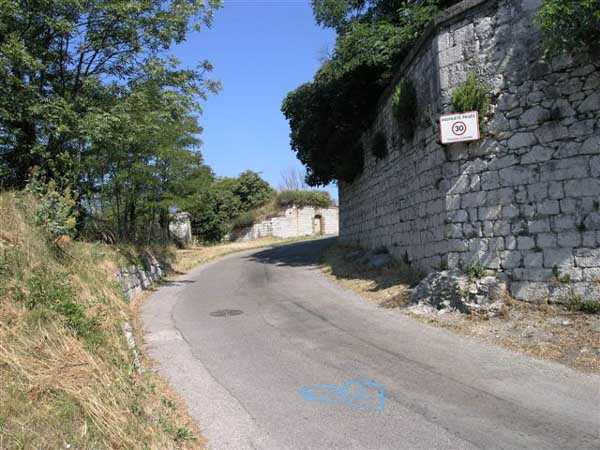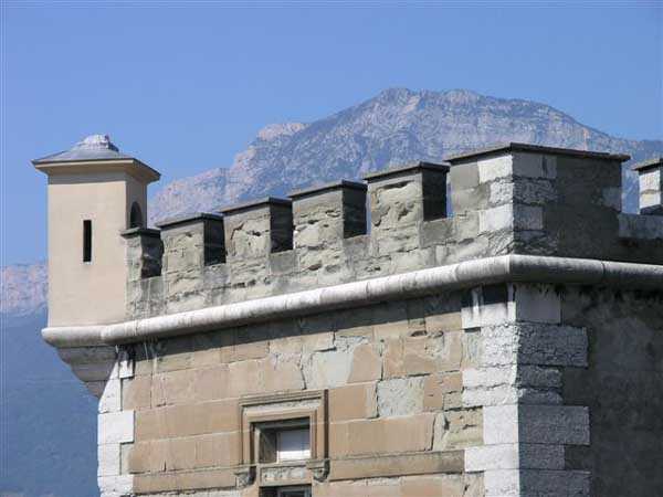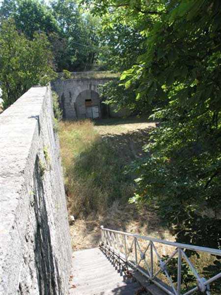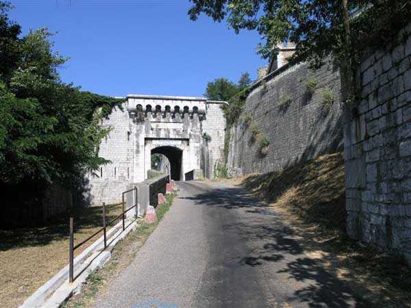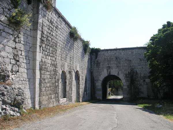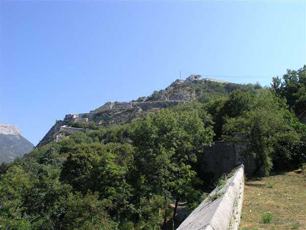 Fortress of Grenoble, north of the city. From 220 to 498 m/alt. Old fortress built from 1823 on Mont Rachais. It encompassed Rabot fort, located lower down on the west face and near which a cavern magazine was excavated. The west face includes impressive staircases flanked by musket firing posts. Included in the optical communications network. Relayed from Moucherotte to Barraux fort and from there to Albertville. Note, at the summit, a rock-cut battery with reverse fire.