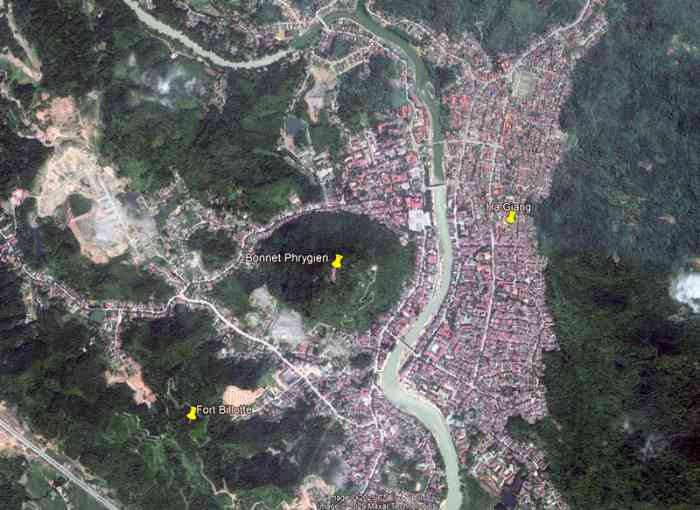 Ha Giang. C’est un ouvrage moderne, réalisé entre 1942 et 1945. Il porte le nom de Gaston Billotte (1875-1940), commandant le 1er groupe d’armées en 1940, mort des suites d’un accident de voiture le 21 mai 1940. Il comprend une enceinte maçonnée, flanquée par des casemates en béton pour mitrailleuses, et une infrastructure souterraine, reliée à des blocs de combat. Il est complété par un observatoire bétonné, situé au sommet du Bonnet Phrygien, qui domine la ville du haut de ses 406 mètres, et par une dizaine de blockhaus isolés, contrôlant les routes d’accès. En mars 1945, l’ouvrage, qui est loin d’être terminé, comprend dix blocs, armés en tout de douze mitrailleuses, de dix FM, et de cinq lance-grenades VB. L’armement comprend également un canon de 75 Mle 1897 sur affût Mle 1916, qui sera détruit dès les premières minutes de l’attaque par un coup d’embrasure. Le réseau de barbelés n’étant pas encore déployé, et une passerelle permettant de monter les matériaux de construction sur les dessus de l’ouvrage étant restée en place, l’assaillant pourra s’y infiltrer facilement. L’installation électrique du fort n’est pas opérationnelle, pas plus que son PC et son réseau téléphonique. Si bien que son commandant devra lui-même porter ses ordres aux blocs de combat, en s’éclairant avec une torche. Avant leur attaque, les Japonais utilisent la même ruse qu’à Lang Son : invitation des officiers français de la garnison à l’hôtel Laîné, leur PC. Cette invitation est déclinée par le chef de bataillon Moullet, commandant la subdivision de Ha Giang, qui invite l’état-major japonais à la demeure du résident. C’est là qu’à 19 heures 10, l’attaque japonaise les surprend. Le fort Billotte est défendu par la 19e compagnie du 1er régiment de tirailleurs tonkinois (RTT), aux ordres du capitaine Jancenelle. Celui-ci étant absent le 9 mars au soir, c’est l’officier de permanence, le capitaine Casaula, qui le remplace. L’ouvrage succombe dans la nuit, après une belle résistance. La plus grande partie des défenseurs, faits prisonniers, sera massacrée. Le fort est détruit par les troupes chinoises, avant leur départ, en 1946. La région n’a jamais été réoccupée par l’armée française, et nous ignorons complètement, à ce jour, ce qu’il peut rester de l’ouvrage. Sur les vues satellitaires, il semble avoir disparu. Dies ist ein modernes Werk, errichtet zwischen 1942 und 1945. Es trägt den Namen von Gaston Billotte (1875-1940), Befehlshaber der 1. Armeegruppe im Jahr 1940, gestorben an den Folgen eines Autounfalls am 21. Mai 1940. Es umfasst eine gemauerte Umwallung, die von Betonkasematten für Maschinengewehre flankiert wird, und eine unterirdische Infrastruktur, die mit Kampfblöcken verbunden ist. Es wird durch einen betonierten Beobachtungsposten ergänzt, der sich auf dem Gipfel des Bonnet Phrygien befindet, der die Stadt aus 406 Metern Höhe überragt, sowie durch etwa zehn isolierte Bunker, die die Zufahrtsstraßen kontrollieren. Im März 1945, als das Werk weit von der Fertigstellung entfernt ist, umfasst es zehn Blöcke, die insgesamt mit zwölf Maschinengewehren, zehn leichten Maschinengewehren und fünf VB-Granatwerfern bewaffnet sind. Die Bewaffnung umfasst auch eine 75-mm-Kanone Mle 1897 auf Lafette Mle 1916, die in den ersten Minuten des Angriffs durch einen Schartentreffer zerstört wird. Da das Stacheldrahtnetz noch nicht ausgebracht war und eine Brücke zum Transport von Baumaterial auf die Oberfläche des Werks stehen geblieben war, kann der Angreifer leicht eindringen. Die elektrische Anlage des Forts ist nicht betriebsbereit, ebenso wenig sein Gefechtsstand und sein Telefonnetz. So dass sein Kommandeur seine Befehle selbst zu den Kampfblöcken bringen muss, wobei er sich mit einer Taschenlampe beleuchtet. Vor ihrem Angriff wenden die Japaner die gleiche List an wie in Lang Son: Einladung der französischen Garnisonsoffiziere in das Hotel Laîné, ihren Gefechtsstand. Diese Einladung wird von Bataillonschef Moullet, dem Befehlshaber des Unterabschnitts Ha Giang, abgelehnt, der den japanischen Stab in die Residenz des Residents einlädt. Dort überrascht sie um 19:10 Uhr der japanische Angriff. Fort Billotte wird von der 19. Kompanie des 1. Tonkin-Schützenregiments (RTT) unter dem Befehl von Hauptmann Jancenelle verteidigt. Da dieser am Abend des 9. März abwesend ist, wird er vom diensthabenden Offizier, Hauptmann Casaula, vertreten. Das Werk fällt in der Nacht nach tapferem Widerstand. Der größte Teil der Verteidiger, die gefangen genommen werden, wird massakriert. Das Fort wird von chinesischen Truppen vor ihrem Abzug im Jahr 1946 zerstört. Die Region wurde nie wieder von der französischen Armee besetzt, und wir wissen bis heute nichts darüber, was von dem Werk übrig geblieben sein könnte. Auf Satellitenbildern scheint es verschwunden zu sein. Dit is een modern werk, gerealiseerd tussen 1942 en 1945. Het draagt de naam van Gaston Billotte (1875-1940), commandant van de 1e Legergroep in 1940, overleden aan de gevolgen van een auto-ongeluk op 21 mei 1940. Het omvat een gemetselde omwalling, geflankeerd door betonnen kazematten voor mitrailleurs, en een ondergrondse infrastructuur, verbonden met gevechtsblokken. Het wordt aangevuld door een betonnen observatiepost, gelegen op de top van de Bonnet Phrygien, die de stad domineert vanaf 406 meter hoogte, en door een tiental geïsoleerde bunkers, die de toegangswegen controleren. In maart 1945, wanneer het werk verre van voltooid is, omvat het tien blokken, bewapend met in totaal twaalf mitrailleurs, tien lichte mitrailleurs en vijf VB-granaatwerpers. De bewapening omvat ook een 75 mm-kanon Mle 1897 op affuit Mle 1916, dat in de eerste minuten van de aanval door een schietgattreffer zal worden vernietigd. Omdat het prikkeldraadnet nog niet was uitgerold en een brug voor het transport van bouwmateriaal naar de bovenz