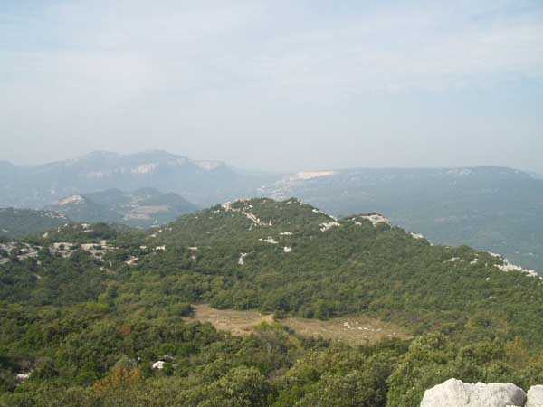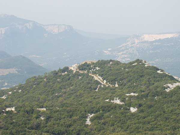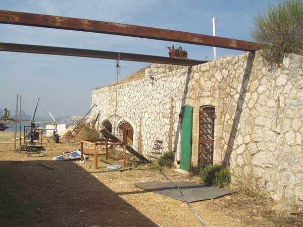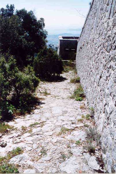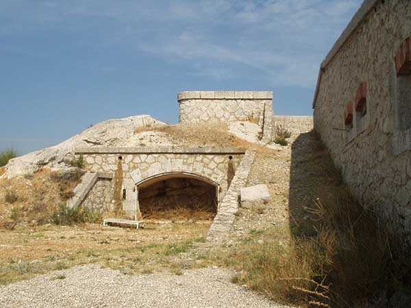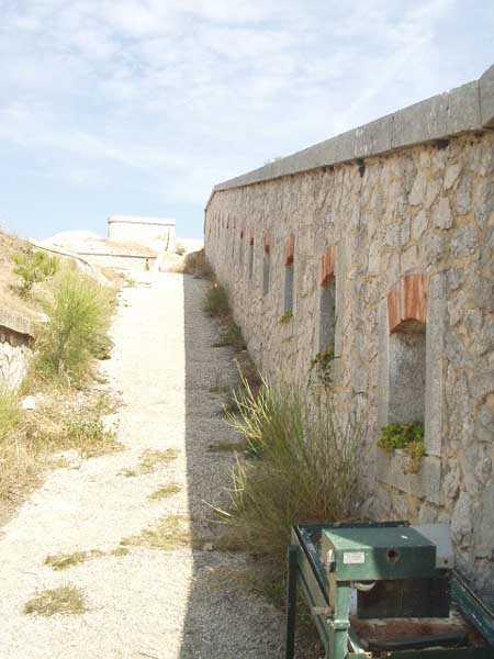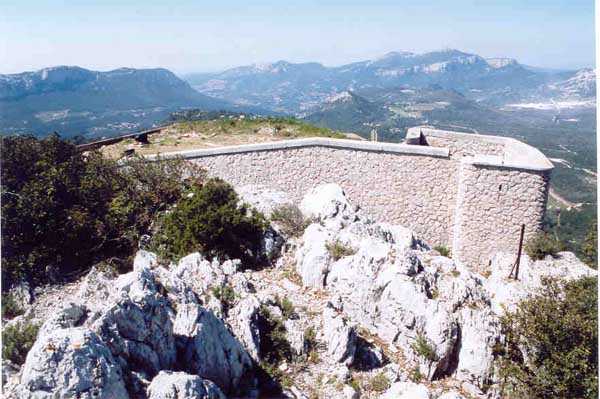 Fortress of Toulon, north-east of the city, 1884. 643 m/alt. Located on the western ridge of Mount Coudon whose approaches it protects together with the Coudon fort and its 3 batteries. About 40 men, 4 cannons 120 mm and 3 mortars 22 cm. Very pretty small work perched on a rocky ridge. Of vaguely triangular shape, the front facing Coudon has a ditch dug into the rock, ditch whose ceiling is lined with rough rubble masonry to collect rainwater. Close defense is carried out from the scarp wall pierced with loopholes and 3 small bastionets. The barracks consist of only two large bays and a third smaller one. There seems to be no powder magazine but we noted three ammunition niches of dimensions slightly larger than usual. Private property, a walking path however leads to the entrance which, just for the landscape offered, is worth the detour. (04/2006). Pronounce "baou".