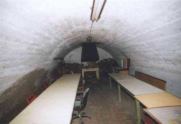 Verdun fortified camp, southwest of the city, 1888-1889. 269 m/alt. In front (2800 m southwest) of the fort of Regret. Small terraced structure for the infantry with a central concrete shelter but whose facade is made of terracotta brick masonry. As can be seen in the work of the neighboring Chapter, this facade, although opening onto a single room, includes two doors framing a single window. On either side of the central room, on the facade, are niches. Some distance from this shelter, there is a concrete shelter, both to the left and to the right. Today (03/2005), the central shelter serves as a hunting lodge and the structure, although probably privately owned, is open to all winds.