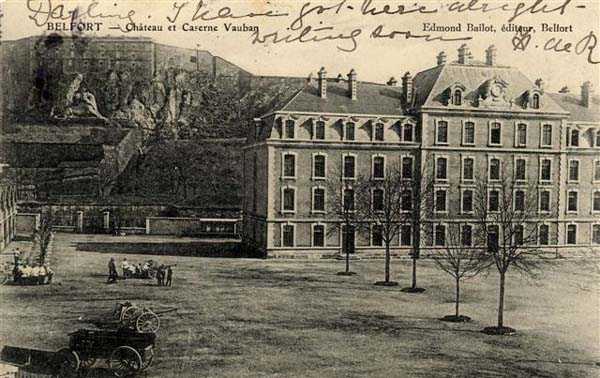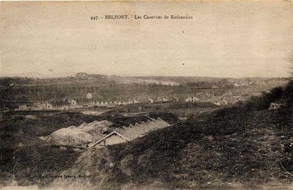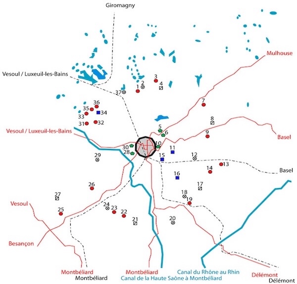 Dept 90 (Belfort territory) The southernmost of the four large eastern squares. Connected to that of Épinal by the Upper Moselle Curtain, and extended to the south by the Place de Montbéliard and the Lomont defensive pier. Eight forts dating from after 1874, five intermediate artillery works (+ 1 under construction), ± 30 infantry works and around 60 batteries. All this for a garrison of 65,000 men and around 1,000 guns, including 340 with a caliber greater than or equal to 120 mm. (data from 1914). In 1877, the Canrobert Commission had decided on a war garrison of 27,131 men and 685 guns. The city, already very military, will see its infrastructure multiplied. Thus, the Hatry barracks were built in 1893-1894, the Bougenel barracks (42 RI) from 1881 to 1884, the Friederich barracks (35 RI) from 1880 to 1884, the Béchaud barracks (151 RI) from 1882 to 1885, the Vauban barracks (5 RA and 4th Engineers) from 1883 to 1900. Others were built shortly before the First World War, such as the Brisach, Offemont and Maud’huy barracks (or Rethenans barracks – 1 battalion of the 35 RI), all erected in 1913-1914. A hospital was built and enlarged from 1881 to 1909, a fodder park in 1882-1883, the Vallon arsenal was modeled from 1875 to 1911, while a refrigeration plant was built in 1907. A fleet of carriages was also planned from 1887 and the quartermaster's office was located in the Espérance barracks (1860-1885). In 1913, the Brisach barracks housed a group of balloonists. It should also be noted that in 1908 a small concrete shelter (1.70 thick, sky slab and walls) was installed behind the town hall, housing the first permanent military radiotelegraph station installed in Belfort, unfortunately destroyed in 1988. Belfort has the sad privilege of being the place which was, among all, the most victim of metal scavengers, especially Germans during the Second World War. All that remains is an armored observatory and a few armored sentry boxes. It should also be noted that this is the only place where an association "La Caponnière" has been working for the benefit of the entire fortified heritage, guiding, supporting and helping the various associations since 1985. Why there isn't a "Caponnière" in every square…