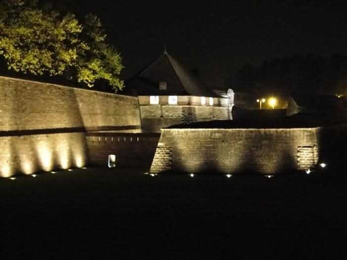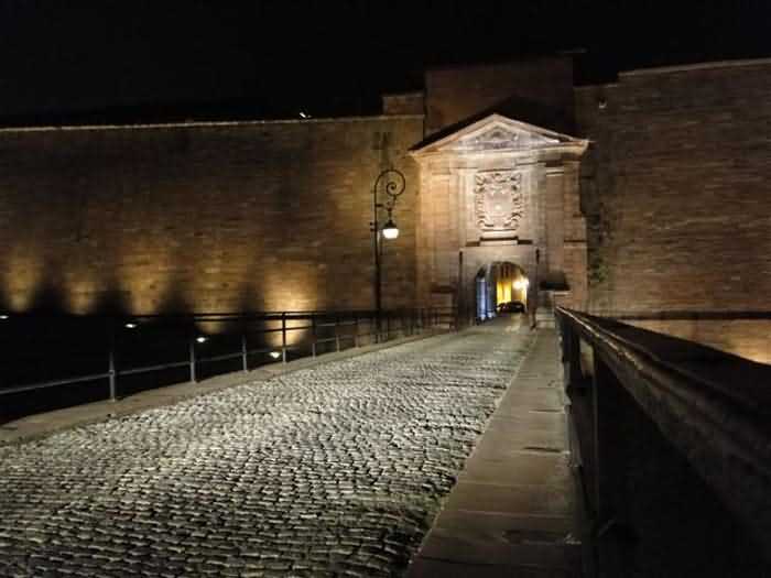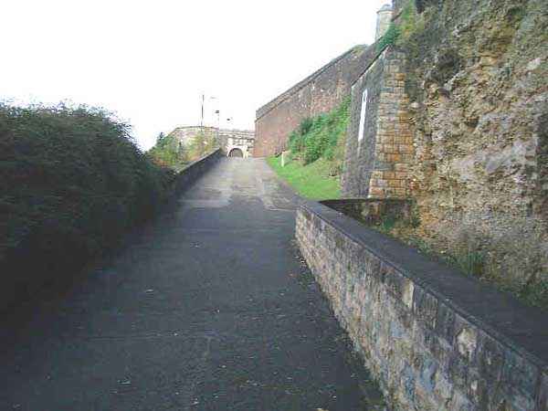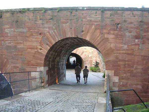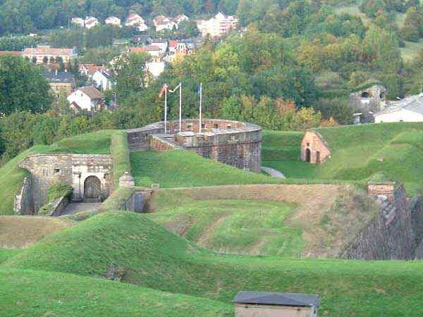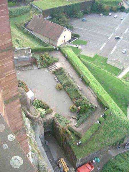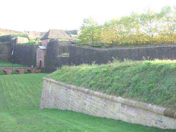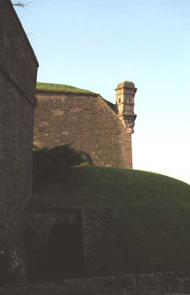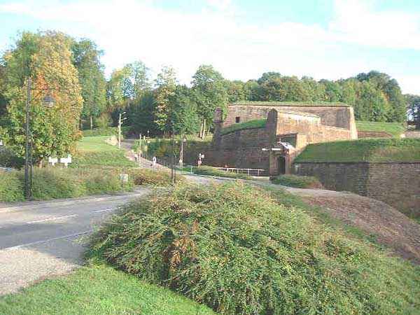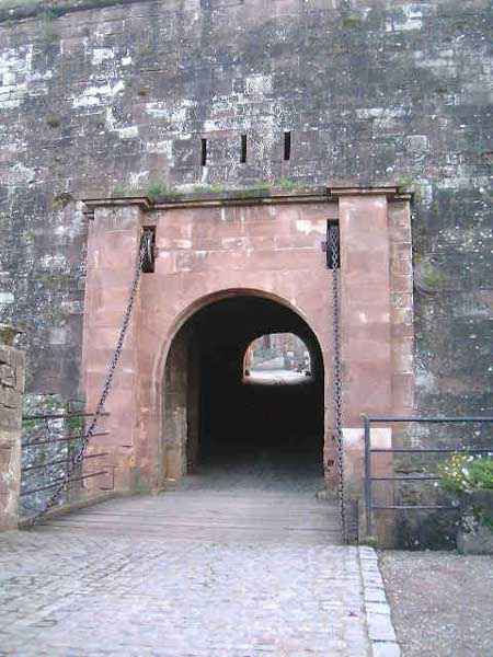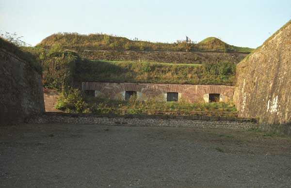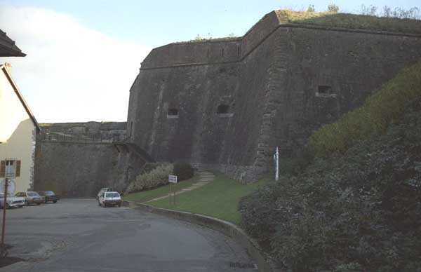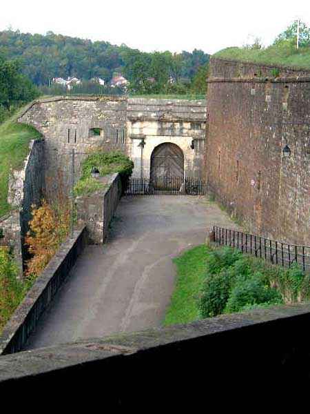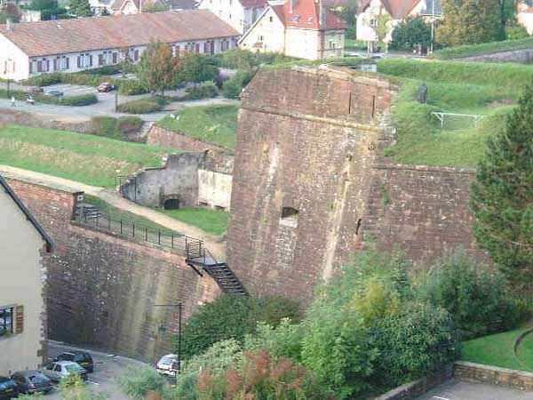 West center of the square, ± 420 m/alt. It is not our intention to describe here the inestimable heritage that is the Château de Belfort and its walls. Of the first fortress dating from the beginning of the 13th century, only the Bourgeois Tower remains. The various walls appeared from the 17th century and the castle was extensively remodeled by Haxo from 1819 to 1827, which led to the site being excluded from the UNESCO World Heritage nomination… on the pretext that Vauban's work was no longer sufficiently visible. What is even less well known is that the castle was chosen to house deep powder magazines that were dug in 1877 (see Château magazines). What heresy! What some purists reject is nothing other than the testimony of the military value of a site for nearly half a millennium. Go figure… This castle was reputed to be the stronghold of the place, even though it was probably more or less devoid of weapons. The governor of the place stayed there and there was an important optical communications relay of which we know nothing, whether its exact location or its configuration (casemated or not?). During our visit (10/2007), we also had our attention drawn to an artillery platform whose parapet is made of prefabricated concrete elements. These elements date from around 1880 and the platform equipped with them is none other than the one surmounting, from the second enclosure, the quadruple Haxo casemate of the third enclosure, a casemate enfilading perpendicularly the approaches to the access road to the castle. The platform is narrow, barely eight elements, and could only be occupied by an 80, 90 or 95 mm cannon, but was it armed? Indeed, why not arm the four casemates? The defense had everything to gain from it. Unfortunately, the restoration of these casemates and the laying of tiles now prevent any trace of possible armament from being detected. So, artillery position or simple belvedere made with available materials? We do not have the answer, except that we must note the little interest in serving a single cannon here. We did not have time to check all the ridges of the site, but we were assured that only this platform possessed such characteristics. The elements of interest in this index are located outside the tourist route, but the architectural treasures of the castle, as well as the art and history museum that has found a setting there, are undoubtedly worth the trip. The visitor will not miss, a short distance from the entrance to the castle, to go and admire the Porte de Brisach and its rare drawbridge à la Lacoste.