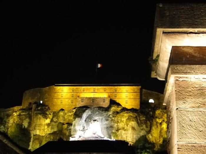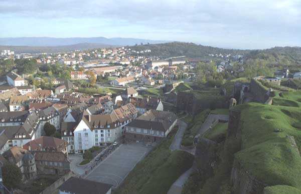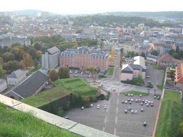 Západní střed náměstí, ± 420 m/nm. Není naším záměrem zde popisovat neocenitelné dědictví, kterým je zámek Belfort a jeho hradby. Z první pevnosti z počátku 13. století se dochovala pouze Měšťanská věž. Různé hradby se objevily od 17. století a hrad byl Haxem v letech 1819 až 1827 rozsáhle přestavěn, což vedlo k vyloučení lokality z nominace na seznam světového dědictví UNESCO… pod záminkou, že Vaubanovo dílo již nebylo dostatečně viditelné. Ještě méně známo je, že hrad byl vybrán pro umístění hlubokých prachových skladů, které byly vykopány v roce 1877 (viz zámecké časopisy). Jaké kacířství! To, co někteří puristé odmítají, není nic jiného než svědectví o vojenské hodnotě místa po téměř půl tisíciletí. Kdo by si myslel… Tento hrad byl pokládán za pevnost místa, i když byl pravděpodobně víceméně bez zbraní. Zde pobýval guvernér a nacházelo se zde důležité optické komunikační relé, o kterém nevíme nic, ať už o jeho přesném umístění nebo konfiguraci (zastřešené či nikoliv?). Během naší návštěvy (10/2007) nás také zaujala dělostřelecká plošina, jejíž parapet je vyroben z prefabrikovaných betonových prvků. Tyto prvky pocházejí z doby kolem roku 1880 a plošina, která je jimi vybavena, není nic jiného než ta, která z druhé strany ohrady převyšuje čtyřnásobnou kasematu Haxo třetí ohrady, kasematu kolmo obepínající přístupy k přístupové cestě k hradu. Plošina je úzká, sotva osmidílná, a mohla být obsazena pouze kanónem ráže 80, 90 nebo 95 mm, ale byl ozbrojen? Ano, proč nevyzbrojit čtyři kasematy? Obrana z toho měla jen prospěch. Bohužel, restaurování těchto kasemat a pokládka dlaždic nyní brání odhalení jakékoli stopy po možné výzbroji. Takže dělostřelecká pozice nebo prostý vyhlídkový bod postavený z dostupných materiálů? Nemáme odpověď, kromě toho, že musíme poznamenat malý zájem o službu zde jedinému kanónu. Neměli jsme čas prozkoumat všechny hřebeny lokality, ale byli jsme ujištěni, že pouze tato plošina má takové vlastnosti. Zajímavé prvky v tomto indexu se nacházejí mimo turistickou trasu, ale architektonické poklady hradu, stejně jako muzeum umění a historie, které zde našlo své místo, nepochybně stojí za návštěvu. Návštěvník si nenechá ujít, kousek od vchodu do hradu, možnost obdivovat bránu Porte de Brisach a její vzácný padací most à la Lacoste.