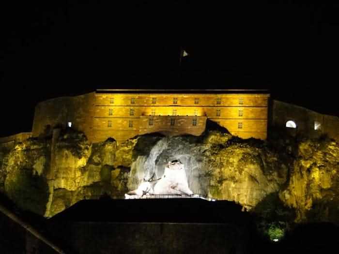 Centre ouest de la place, ± 420 m/alt. Il n’entre pas dans nos intentions de décrire ici l’inestimable patrimoine qu’est le château de Belfort et ses enceintes. De la première forteresse datant du début du XIIIè siècle, il ne reste que la tour des Bourgeois. Les différentes enceintes apparaîtront à partir du XVIIè siècle et le château sera fortement remanié par Haxo 1819 à 1827, ce qui vaut au site d’avoir été écarté de la candidature au titre de patrimoine mondial à l’Unesco… sous prétexte que l’œuvre de Vauban n’y était plus suffisamment lisible. Ce que l’on sait encore moins, c’est que le château sera choisi pour abriter de profonds magasins à poudre que l’on creusera en 1877 (voir magasins du Château). Quelle hérésie ! Ce que certains puristes rejettent n’est autre que le témoignage de la valeur militaire d’un site durant près d’un demi millénaire. Allez donc comprendre… Ce château était réputé constituer le réduit de la place et ce bien qu’il ait probablement été peu ou prou dénué d’armement. Le gouverneur de la place s’y tenait et il y avait un important relais de communications optiques dont nous ignorons tout, que ce soit son emplacement exact ou sa configuration (casematé ou non ?). Lors de notre visite (10/2007), nous avons aussi eu l’attention attirée par une plate-forme d’artillerie dont le parapet est composé d’éléments préfabriqués en béton. Ces éléments datent des environs de 1880 et la plate-forme qui en est équipée n’est autre que celle surmontant, depuis la seconde enceinte, la quadruple casemate Haxo de la troisième enceinte, casemate enfilant perpendiculairement les approches de la voie d’accès au château. La plate-forme est étroite, à peine huit éléments, et ne pouvait être occupée que par un canon de 80, 90 ou 95 mm, mais a-t-elle été armée ? En effet, pourquoi ne pas armer les quatre casemates ? La défense y avait tout à gagner. Hélas, la restauration de ces casemates et la pose de carrelages empêchent dorénavant de détecter toute trace d’éventuel armement. Alors, position d’artillerie ou simple belvédère constitué avec des matériaux disponibles ? Nous n’avons pas la réponse, sinon qu’il nous faut bien constater le peu d’intérêt de servir ici un canon unique. Nous n’avons pas eu le temps de vérifier toutes les crêtes du site, mais il nous a été certifié que seule cette plate-forme possédait de telles caractéristiques. Les éléments intéressant cet index sont situés en dehors du parcours touristique, mais les trésors architecturaux du château, tout autant que le musée d’art et d’histoire qui y a trouvé écrin valent incontestablement le déplacement. Le visiteur ne manquera pas, à peu de distance de l’entrée du château, d’aller admirer la porte de Brisach et son rare pont-levis à la Lacoste.