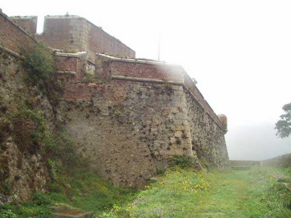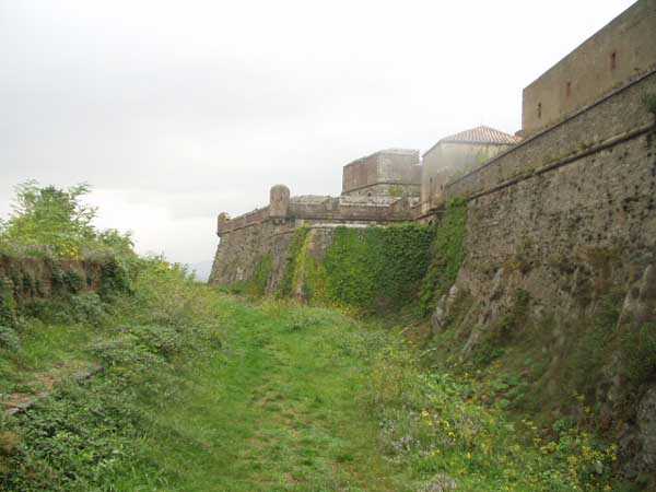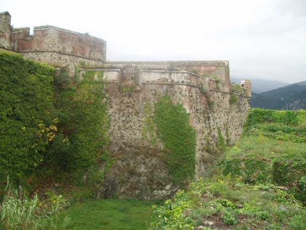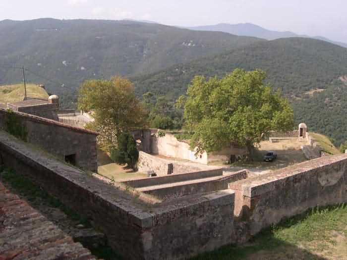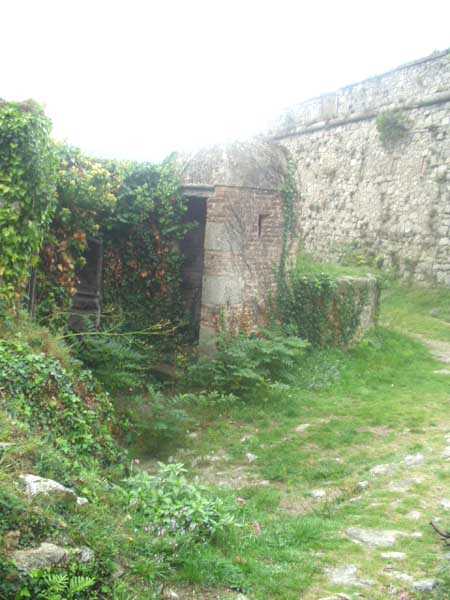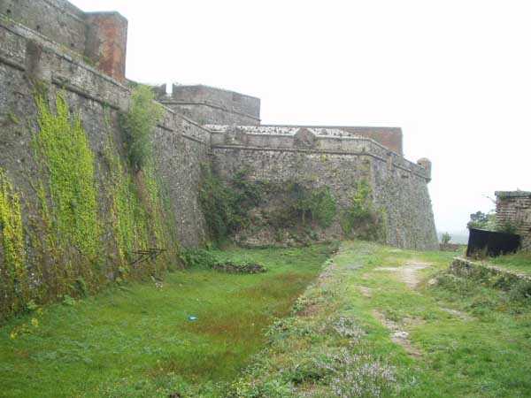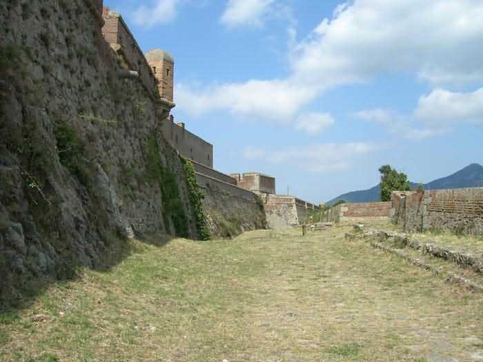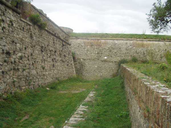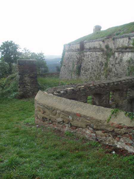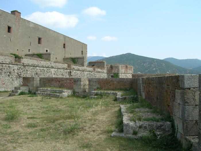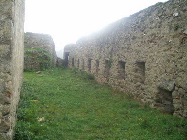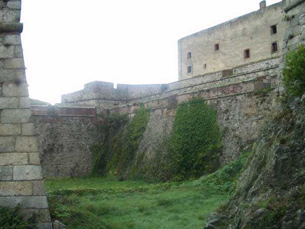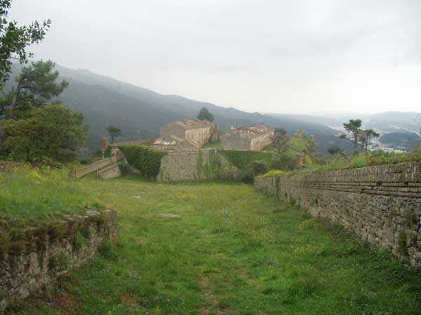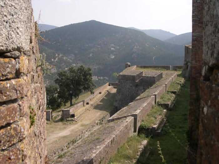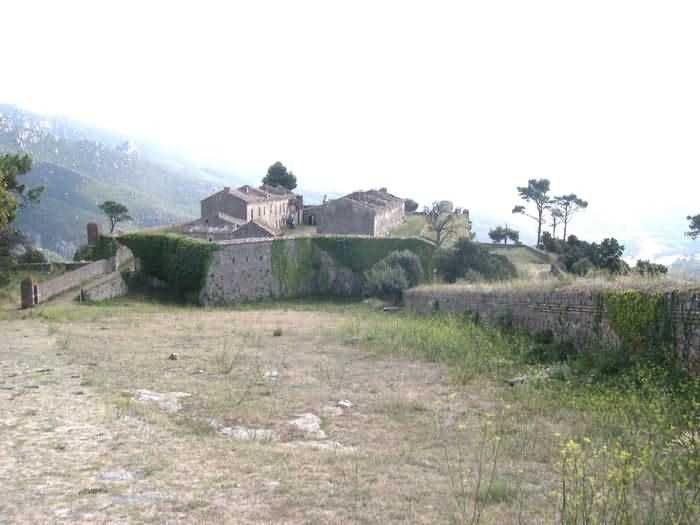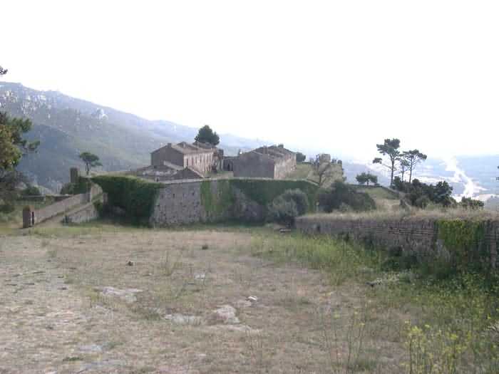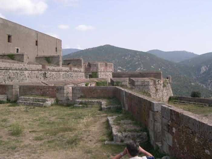 Dept 66 (Pyrénées-Orientales) 420 m/alt. An old bastioned fort located at the Col du Perthus (270 m/alt), on the Franco-Spanish border. Imposing and well-cleared, the fort includes a large redoubt connected by a covered way, itself protected by the wall, to a redoubt positioned a little further down (402 m/alt). The main entrance opens onto a very wide staircase ramp, which means that the steps extend laterally beyond the ramps. The lower redoubt is currently abandoned and its barracks are falling into ruins. It is worth noting a very beautiful well in the center of the courtyard of this redoubt. Voulquin does not cite it as having been declassified with the other works in the Pyrenees, by the law of June 24, 1907, nor do the archives of previous declassifications that we were able to consult. From the photos that were brought back to us (10/2005), we were unable to detect any elements of modernization after 1874.