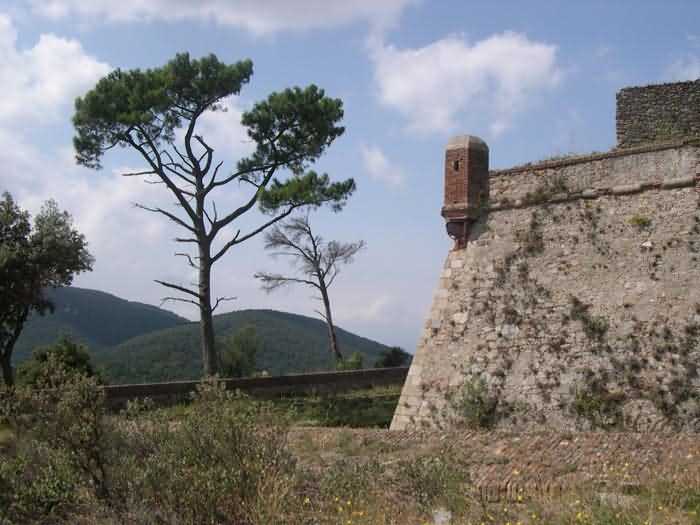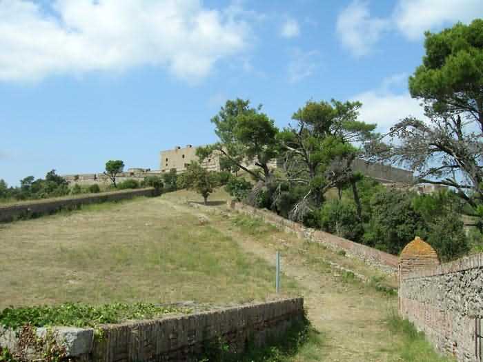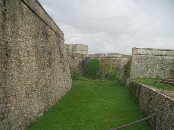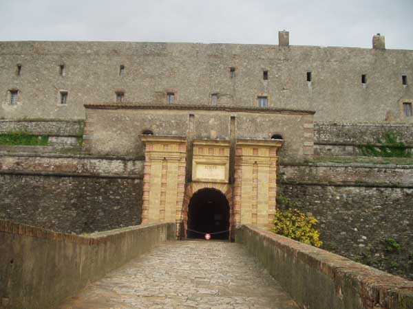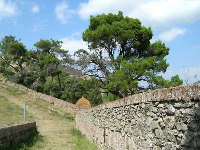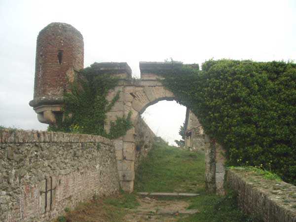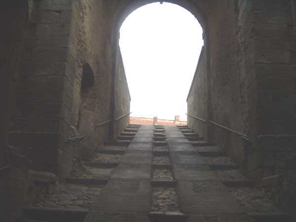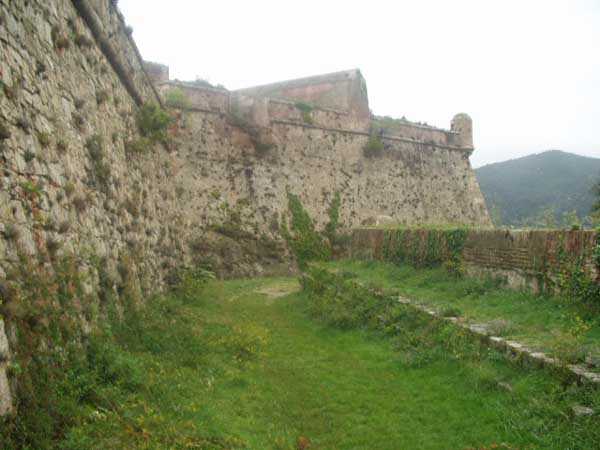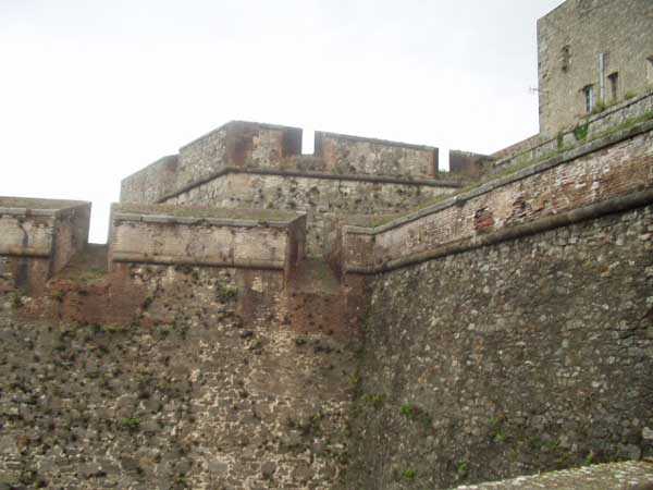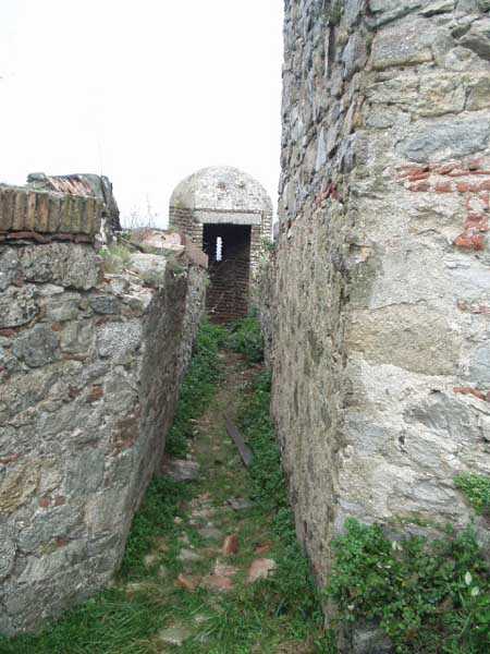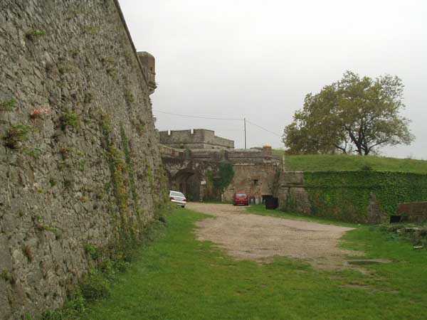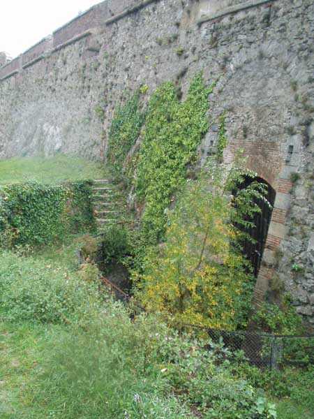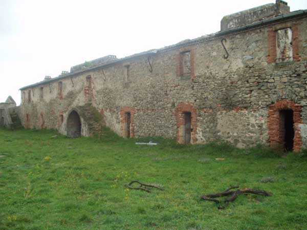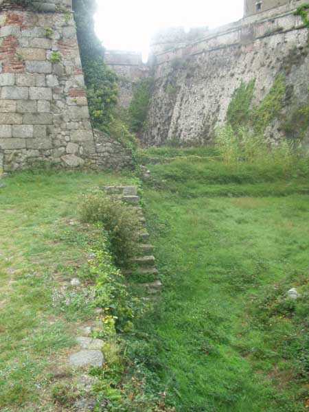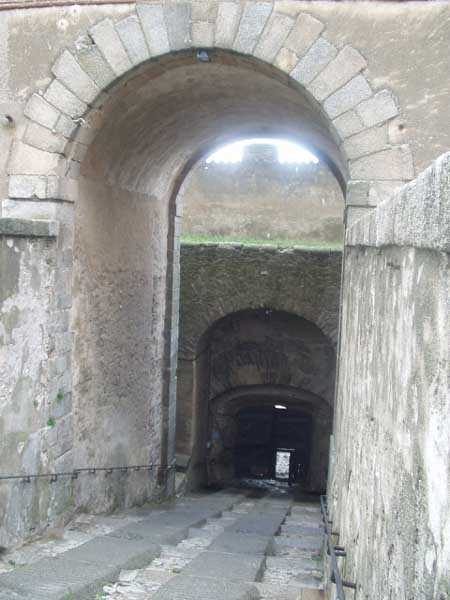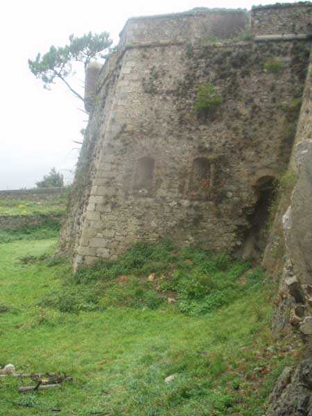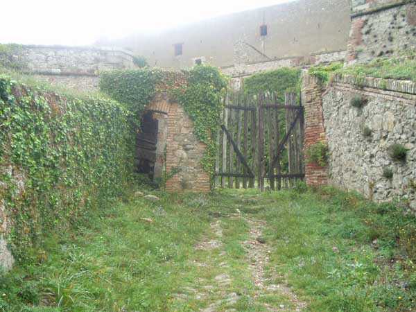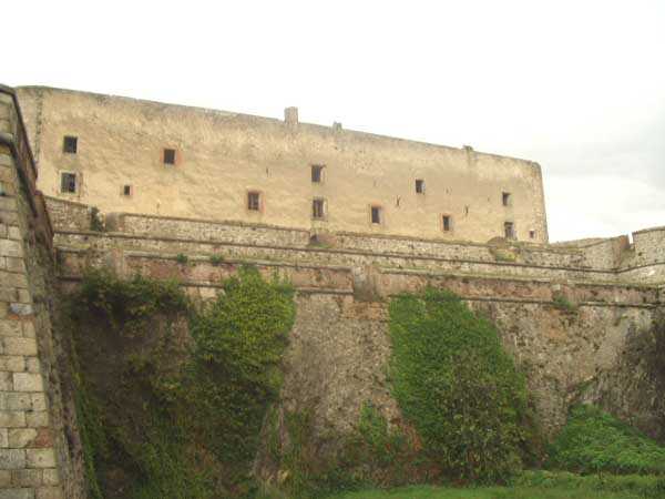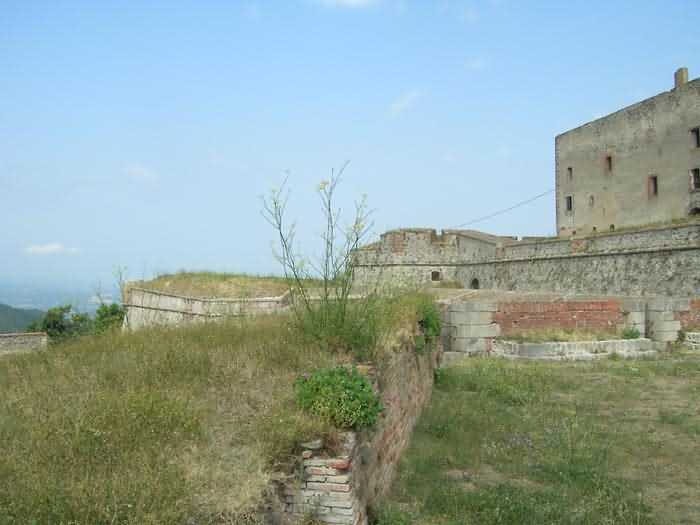 Dept 66 (Pyrénées-Orientales) 420 m/alt. An old bastioned fort located at the Col du Perthus (270 m/alt), on the Franco-Spanish border. Imposing and well-cleared, the fort includes a large redoubt connected by a covered way, itself protected by the wall, to a redoubt positioned a little further down (402 m/alt). The main entrance opens onto a very wide staircase ramp, which means that the steps extend laterally beyond the ramps. The lower redoubt is currently abandoned and its barracks are falling into ruins. It is worth noting a very beautiful well in the center of the courtyard of this redoubt. Voulquin does not cite it as having been declassified with the other works in the Pyrenees, by the law of June 24, 1907, nor do the archives of previous declassifications that we were able to consult. From the photos that were brought back to us (10/2005), we were unable to detect any elements of modernization after 1874.