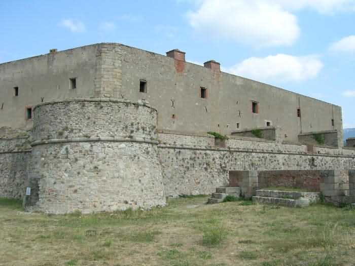 Dept 66 (Pyrénées-Orientales), 420 m ü. M. Eine alte Bastionfestung am Col du Perthus (270 m ü. M.), an der französisch-spanischen Grenze. Das imposante und gut erhaltene Fort umfasst eine große Schanze, die durch einen überdachten Weg, der wiederum durch die Mauer geschützt ist, mit einer etwas tiefer gelegenen Schanze (402 m ü. M.) verbunden ist. Der Haupteingang öffnet sich zu einer sehr breiten Treppenrampe, d. h. die Stufen ragen seitlich über die Rampen hinaus. Die untere Schanze ist derzeit verlassen, und ihre Kasernen verfallen. Bemerkenswert ist ein sehr schöner Brunnen in der Mitte des Hofes dieser Schanze. Voulquin erwähnt weder, dass sie zusammen mit den anderen Anlagen in den Pyrenäen durch das Gesetz vom 24. Juni 1907 freigegeben wurde, noch enthalten die uns zugänglichen Archive früherer Freigaben einen entsprechenden Hinweis. Auf den uns überlassenen Fotos (10/2005) konnten wir keine Modernisierungselemente nach 1874 erkennen.