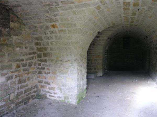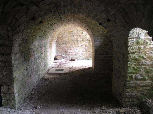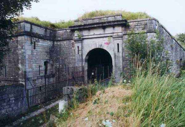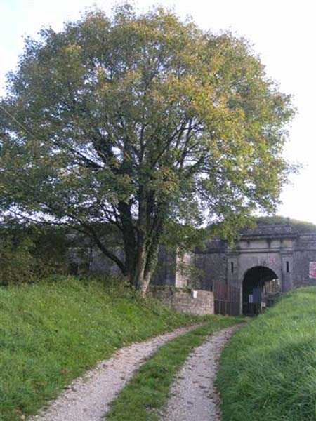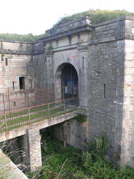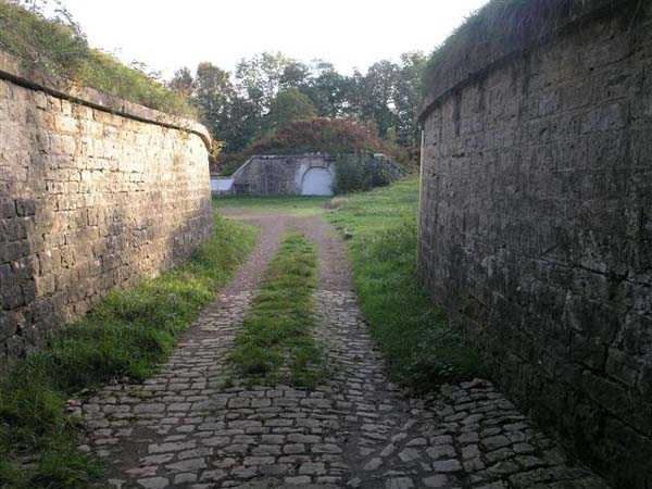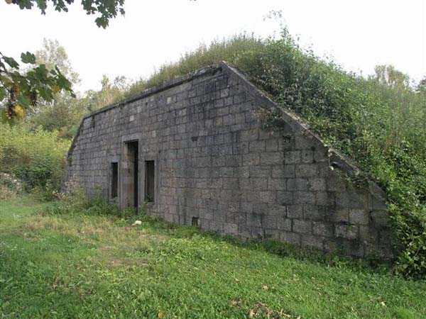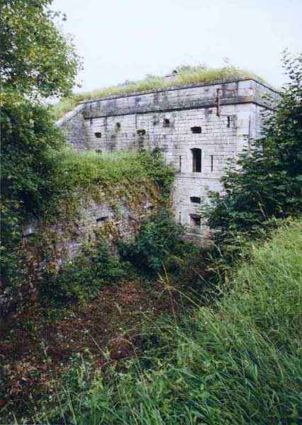 Fortress Besançon, NE of the city, 1877-1880. 364 m/alt. Redoubt dating from the conflict of 1870-1871 and then housing 18 guns, it was first called redoubt or fort de "Palente". It took its definitive name in 1876. Initially planned for 24 guns. Fronts II-III and IV-V are defended by double caponiers while the gorge front is flanked by casemates set into the side of the two-level barracks which protrudes on this side. The powder magazine, with a fairly low ceiling and three battlements, is attached to the rear of the barracks. Part of the escarpment is semi-detached. The courtyard shows an alignment of four hollow traverses and five artillery platforms. To the left of this line, in the axis of salient I, there is a much longer traverse at the end of which, by a metal ladder, one reaches an open-air observatory. Right against the fort, there are 2 annex batteries, 1 to the NE, the other to the SE, the latter comprising a single hollow traverse without particularity. Fort Benoît directly attacked the N 83 and the railway coming from Belfort. In good general condition, it is currently (10/2006) occupied by a firing circle.