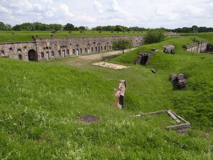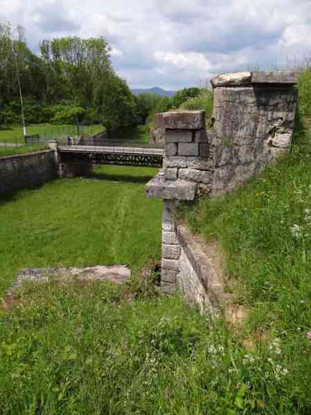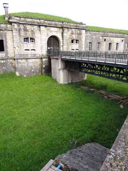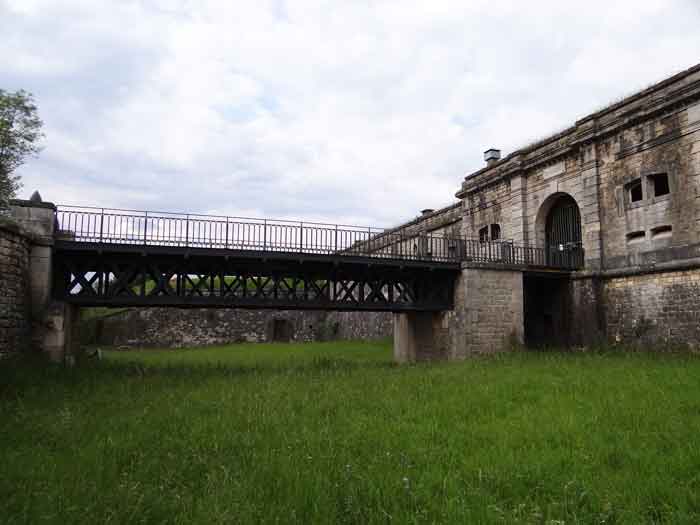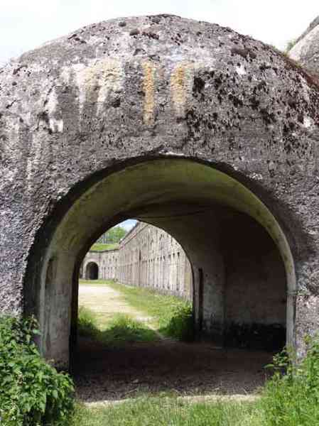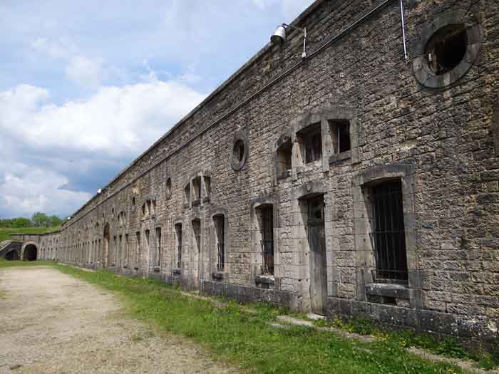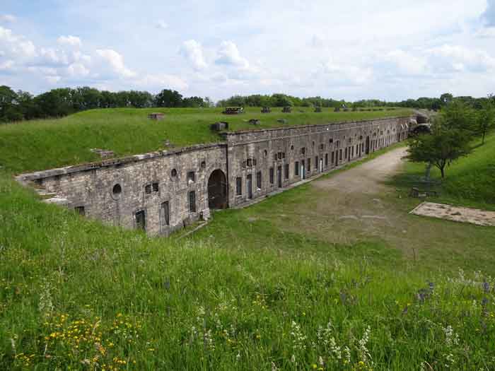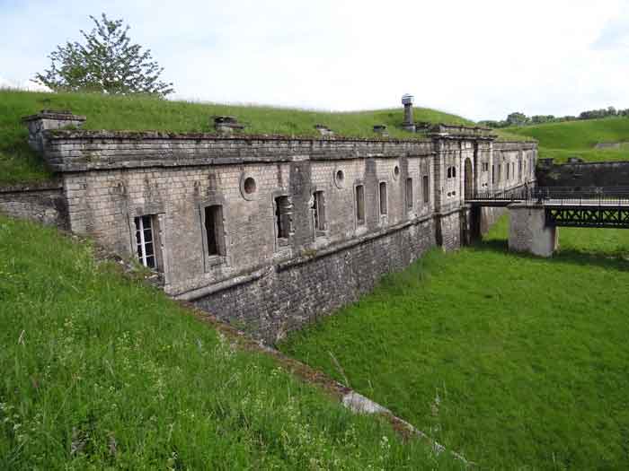 Befestigtes Lager Belfort, östlich der Stadt, 1883–1886. 381 m ü. M. 673 Mann und 34 Geschütze, darunter 12 Flankengeschütze. Genannt Fort Sénarmont. Großes fünfeckiges Fort mit einer zerklüfteten Schlucht, in deren Mitte sich eine breite Kurtine befindet. Seine Gräben wurden durch zwei Flügel (Vorsprünge II und IV) und eine doppelte Kaponniere (Vorsprung III) verteidigt; die Kurtinekassetten hatten die Aufgabe, den Schluchtgraben durch ihr Kreuzfeuer zu schützen. Diesen Kassen war ein Graben vorgelagert, der Angreifer, die in den Graben hinabstiegen, daran hinderte, ihre Schießscharten zu erreichen. Den unteren Teil der Kurtine nehmen zehn Kasematten ein, in denen insbesondere die Offiziere untergebracht waren. Der Eingang zum Fort besteht aus einem Portalvorbau, der die fünfte von der sechsten Kasematte trennt. Davor, auf dem Glacis, befindet sich noch das Stallgebäude. Der Eingangsbereich mit seinen beiden Wachhäusern ragt leicht aus der Kasemattenreihe der Kurtine hervor. Mit seiner von kleinen dekorativen Konsolen getragenen Tropfkante ist er recht ansprechend, und am Giebel trägt er eine Gedenktafel mit dem Namen „Boulanger“. Der Eingangstunnel ist recht kurz und öffnet sich in der Mitte und vor einer senkrechten Reihe von nicht weniger als 21 Jochen (auf einer Ebene) + zwei Vordächern, die die Truppenbaracken bilden. Diese Baracken wurden auf beiden Seiten um drei Räume erweitert, deren Fassaden das Ganze noch weiter in die Länge zogen. Das Unvollkommene ist angebracht, da, wie wir sehen werden, Modernisierungen das ursprüngliche Erscheinungsbild des Ortes etwas verändert haben. In den Rücksprüngen zur Schlucht der Flügel des Massivs der Hauptkaserne befanden sich zwei Pulvermagazine. Die Wallstraße hatte dreizehn überdachte Traversen, die gleichmäßig auf die Seiten- und Kopfflanken verteilt waren. Kaum zwei Jahre nach ihrer Erbauung war das Fort veraltet. Die Modernisierungen, die dort durchgeführt werden sollten, machten dieses Fort sehr interessant, da man die Unordnung der Pioniere und die ersten Bemühungen zur Bewältigung der Torpedogranatenkrise erkennen kann. So blieben beispielsweise die Artillerieplattformen erhalten, die Geschütze wurden jedoch unter Betonbunkern untergebracht. Die Wallstraße blieb bestehen. Ab 1888 erhielten die fünf Joche ganz links von der Hauptkaserne eine spezielle, 2,50 m dicke Betonabdeckung, die durch eine 1,50 m dicke Sandschicht von den Gewölbeaußenseiten getrennt war. Diese Betonabdeckung sollte vor die ursprüngliche Fassade gelegt werden, um davor einen Verkehrskorridor zu schaffen. Der Verkehrskorridor auf der Rückseite wurde ebenfalls instand gehalten und auf die gleiche Weise geschützt. Beachten Sie das Bemühen, den Beton zu ästhetisch aufzuwerten, indem auf der Hofseite Bruchsteinmauerwerk imitiert wurde. Bessoncourt war das erste Fort in der Gegend, dessen Kaponniere bereits 1895 durch Kontekarpengewölbe ersetzt wurden. Die Forts von Vézelois, Bois d'Oye und Roppe folgten erst elf Jahre später. Allerdings wäre es für ihn nicht sehr profitabel gewesen, der Erste zu sein, da keines seiner Gewölbe durch einen unterirdischen Gang mit dem Zentralmassiv verbunden war. Die Kaponniere-Abstiegsschächte blieben erhalten und wurden auf der Höhe der Steilwand durch ein Tor versperrt. Um die Gewölbe zu erreichen, musste man den offenen Graben überqueren. Wahrscheinlich zur gleichen Zeit (nach 1896) wurde rechts von der Kurtine am Grund des Grabens ein Kriegseingang geschaffen. Entlang der Achse dieses Eingangs führt ein Betontunnel zum ehemaligen zweiten Vorbau der Hauptkaserne, der sich zwischen den Buchten 14 und 15 befindet. Dieser ebenfalls betonierte Vorbau wird bis zur Wallstraße verlängert und blickt auf den rechten Ausgang einer hufeisenförmigen Infanteriestellung mit Betongalerie und Schikaneneingängen. Diese Stellungen ersetzen die Traversen 6, 7 und 8 im Hauptkapitell. Ähnliche Stellungen werden die Frontvorsprünge II und IV besetzen und mit Artillerieschuppen ausgestattet. Ähnliche Geschützunterstände, deren beide Öffnungen zur Schlucht zeigen, werden vor den Traversen 1 und 13 errichtet, die abgetragen und mit Beton ausgefüllt werden. Diese Unterstände und Infanteriestellungen sind eine echte Besonderheit dieses Forts. Die abgerundeten Betonmassive erinnern an die belgischen Forts an der Maas, deren Betonierung 1892 abgeschlossen war. Die Pulvermagazine werden erheblich verändert. Nur wenige Meter des Lagerraums bleiben erhalten, der Rest wird vollständig verfüllt. Unterhalb dieses verfüllten Abschnitts dienen die belüfteten Hohlräume nach der Torpedokrise als Decke für ein neues Projektilmagazin, da diese in den Forts nicht mehr hergestellt werden. Der Zugang zu diesen unterirdischen Magazinen erfolgt über die Gänge zu beiden Seiten der großen Kaserne, und zwar über einen leicht ansteigenden Gang, der an einen Lampenschacht grenzt, der an die Magazinschleuse angrenzt. In den Jahren 1908 und 1909 wird das Fort gepanzert. Zwei 75er-Türme werden neben den neuen Zugängen zu den soeben erwähnten Projektilmagazinen aufgestellt. Somit wird das Fort Bessoncourt das einzige sein, dessen Eingang zu seinen 75 Turmblöcken zur Frontlinie zeigt. Ein Maschinengewehrturm ist für den Frontvorsprung II vorgesehen und ein zweiter für den Frontvorsprung V. Für Letzteren waren zwei gepanzerte Beobachtungsposten geplant, die jedoch nicht installiert wurden. Nur die der 75 Türme und einer, der für das Kommando bestimmt ist und ungefähr in der Mitte der Front III-IV installiert wird, werden gepanzert. Die Infanteriebrüstungen werden jeweils über einen Beobachtungsposten verfügen. Es gab Pläne, in der Nähe des Forts einen Betonmonolithen für zwei Geschütztürme des Typs 155 R Mle 1907 zu errichten. Die beiden Türme sollten durch Projektilmagazine und zwei große Kasernen voneinander getrennt sein. Dieses Projekt wurde nicht weiterverfolgt. 1917 wird im Fort ein 