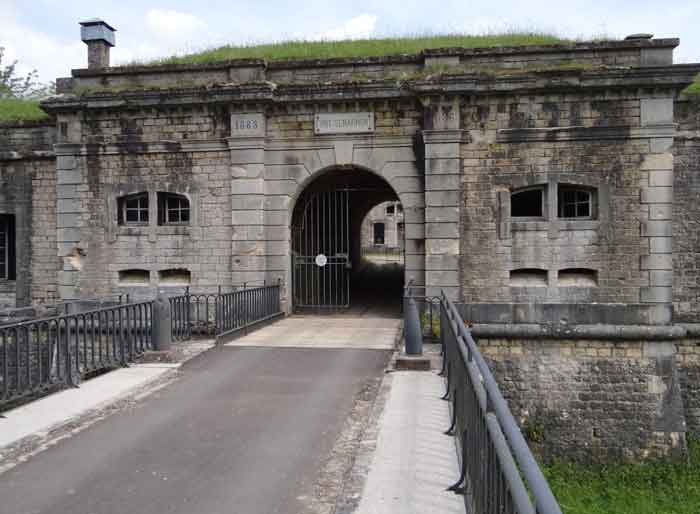 Opevněný tábor Belfort, východně od města, 1883-1886. 381 m/n.m. 673 mužů a 34 děl včetně 12 obranných. Nazýval se Fort Sénarmont. Velká pětiúhelníková pevnost s rozbitou roklí, uprostřed které se nachází široká kurtinová zeď. Její příkopy byly bráněny dvěma křídly (výběžky II a IV) a dvojitým kaponiérem (výběžek III); kazety kurtinové zdi měly za úkol chránit příkop rokle křížovou palbou. Těmto kazetám předcházel příkop, který bránil útočníkovi sestupujícímu do příkopu dosáhnout střílen. Spodní část kurtinové zdi zabírá deset kasemat, kde byli ubytováni zejména důstojníci. Vchod do pevnosti tvoří veranda oddělující pátou od šesté kasematy. Před ní, na svahu, se dodnes nachází budova stájí. Vstupní veranda, obložená dvěma strážnicemi, mírně vystupuje z linie kasemat na obvodové zdi. Je docela atraktivní s okapnicí podepřenou malými ozdobnými konzolami a na štítu nese plaketu s názvem Boulanger. Vstupní tunel je poměrně krátký a otevírá se uprostřed a před kolmou linií nejméně 21 polí (na jedné úrovni) + dvě verandy tvořící kasárna pro vojáky. Tato kasárna byla dále rozšířena na obou stranách o tři místnosti, jejichž fasády dále prodlužovaly rozlohu celku. Tato nedokonalost je na místě, protože, jak uvidíme, modernizace poněkud změnily původní vzhled místa. V zákrutách směrem k rokli křídel masivu hlavních kasáren se nacházely dva prachárny. Ulice valu měla třináct krytých traverz rovnoměrně rozložených na bočních a předních křídlech. Sotva dva roky po své výstavbě byla pevnost zastaralá. Modernizace, které zde měly být provedeny, učinily tuto pevnost velmi zajímavou, protože je vidět chaos ženistů a první snahy o řešení krize s torpédovými granáty. Například dělostřelecké plošiny byly zachovány, ale zbraně byly umístěny pod betonovými kryty. Ulice s valy zůstala zachována. Od roku 1888 dostalo pět polí na krajní levé straně hlavních kasáren speciální betonový kryt o tloušťce 2,50 m, oddělený od přízemí kleneb 1,50 m písku. Tento betonový kryt měl být nesen před původní fasádou, aby se před ní vytvořila cirkulační chodba. Cirkulační chodba v zadní části byla také udržována a chráněna stejným způsobem. Všimněte si snahy o estetizaci betonu napodobením lomového zdiva na straně nádvoří. Bessoncourt byl první v oblasti, kde byly jeho kaponiéry nahrazeny protiskluzovými klenbami, a to již v roce 1895. Pevnosti Vézelois, Bois d'Oye a Roppe následovaly až o jedenáct let později. Být první by pro něj však nebylo příliš ziskové, protože žádná z jeho kleneb nebyla spojena s centrálním masivem podzemní galerií. Sestupné šachty kaponiérů byly zachovány a ve výšce srázové zdi byly zablokovány branou. Do sklepení bylo nutné se dostat přes otevřený příkop. Pravděpodobně ve stejnou dobu (po roce 1896) byl vpravo od obvodové zdi na dně příkopu vytvořen válečný vchod. Podél osy tohoto vchodu povede betonový tunel k tomu, co bývalo druhou verandou hlavních kasáren, která se nachází mezi boxy 14 a 15. Tato veranda, rovněž vybetonovaná, bude prodloužena až k hradební ulici směřující k pravému výtoku z pěchotní pozice ve tvaru podkovy, s betonovou galerií a šikanovými vstupy, které nahradí traverzy 6, 7 a 8 v hlavním městě. Podobné pozice budou obsazovat výběžky II a IV a budou k nim připojeny dělostřelecké přístřešky. Podobné dělostřelecké kryty, jejichž dva otvory budou směřovat do rokle, budou odlity před traverzami 1 a 13, které budou zabetonovány a vylity betonem. Tyto kryty a pěchotní pozice jsou skutečnou zvláštností této pevnosti. Zaoblené betonové masivy připomínají belgické pevnosti na Meuse, které byly dokončovány betonáží (1892). Prašné sklady budou velmi výrazně upraveny. Zachováno bude pouze několik metrů skladovací místnosti, zbytek bude kompletně zasypán. Pod touto zasypanou částí budou větrané dutiny sloužit jako strop pro nový sklad střel po krizi s torpédy, které se v pevnostech již nevyrábějí. Přístup k těmto podzemním zásobníkům bude z chodeb vyhloubených po obou stranách velkých kasáren, a to mírně svažitou galerií navazující na sloup lampy, který vede zpět k přechodové komorě zásobníků. V letech 1908 a 1909 pevnost obdrží pancéřování. Dvě věže z 75 děl budou umístěny vedle nových přístupů k právě zmíněným zásobníkům střel. Fort Bessoncourt tak bude jediný, jehož vchod do bloků 75 věží bude směřovat do frontové linie. Jedna kulometná věž bude určena pro II. výběžek a druhá pro V. Pro druhý výběžek byla plánována dvě obrněná pozorovací stanoviště, ale nebyla instalována. Budou zde pouze věže z 75 děl a jedno určené pro velení, instalované zhruba uprostřed III.-IV. Pěchotní valy budou mít svou pozorovací budku. Byly vypracovány plány na vykopání betonového monolitu pro dvě věže 155 R Mle 1907 poblíž pevnosti. Obě věže by byly odděleny zásobníky střel a také dvěma velkými kasárnami. Tento projekt nebyl dále realizován. V roce 1917 bude v pevnosti vykopána síť podzemních galerií, trochu podobných těm, které byly k vidění u Verdunu. Klenby budou propojeny pod příkopem a pod přední částí hlavice budou spuštěny dva divertikuly pro uložení zvonů Pamart, které však nikdy nebudou instalovány. Při návštěvě v říjnu 2001 se nám pevnost jevila ve velmi dobrém stavu, a to i přes zesílení veškerého pancéřování. Tunelový systém z roku 1917 je pravděpodobně nejkrásnější a nejzachovalejší, jaký jsme kdy viděli. Pevnost, zbavená vegetace, nabízí dobrý výhled na své reliéfy. Interiér areálu je bezvadný a tu a tam se dochovaly zárub