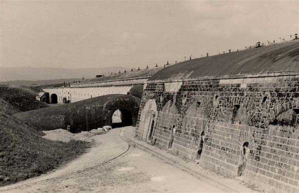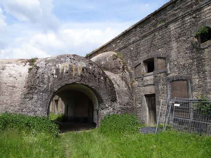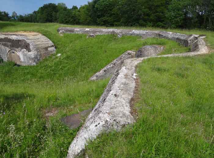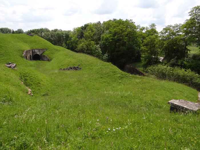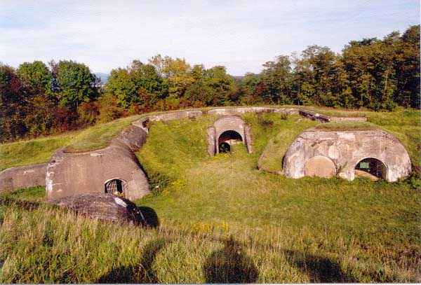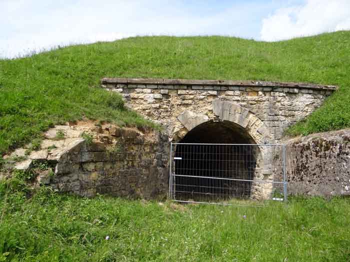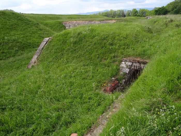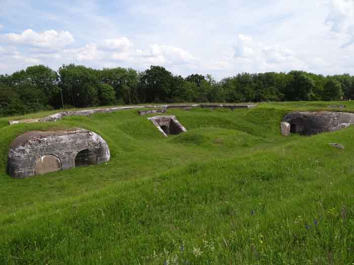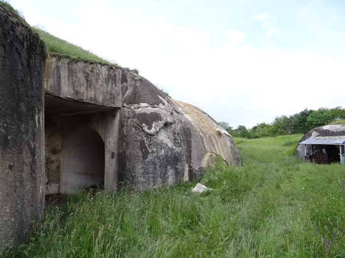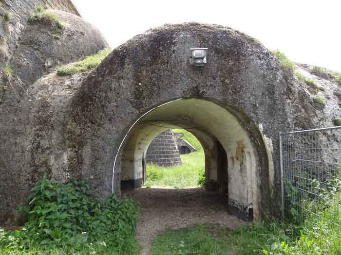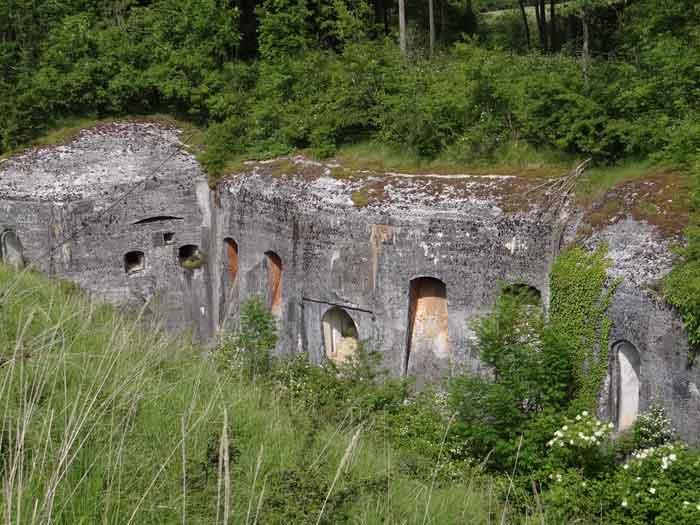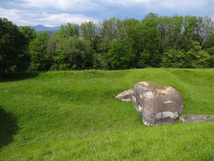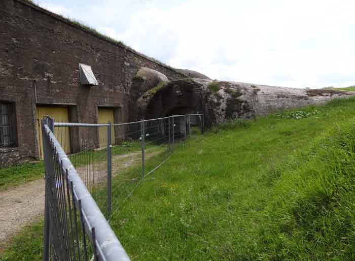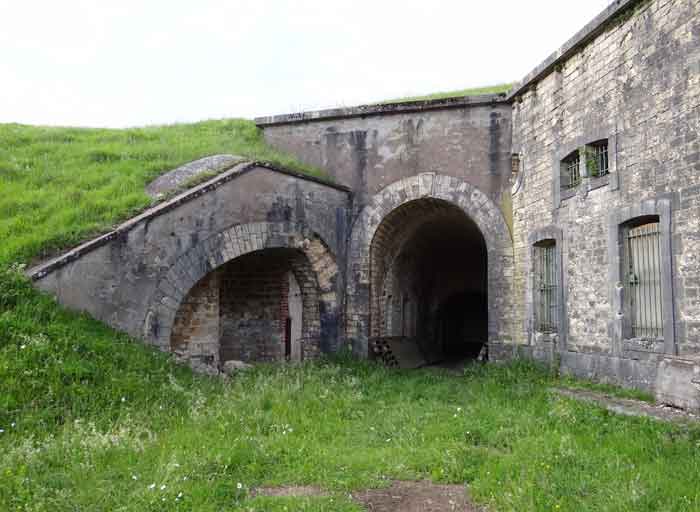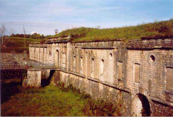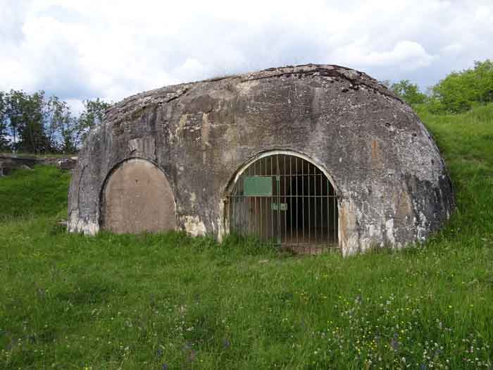 Belfort fortified camp, east of the city, 1883-1886. 381 m/alt. 673 men and 34 guns including 12 flanking. Called Fort Sénarmont. Large pentagonal fort with a broken gorge in the center of which is a wide curtain wall. Its ditches were defended by two wings (salients II and IV) and by a double caponier (salient III); the curtain wall coffers were responsible for protecting the gorge ditch with their crossfire. These coffers were preceded by a ditch preventing the attacker descending into the ditch from reaching their embrasures. The bottom of the curtain wall is occupied by ten casemates where, in particular, the officers were housed. The entrance to the fort consists of a porch separating the fifth from the sixth casemate. In front of it, on the glacis, we still find the stable building. The entrance porch, clad with its two guardhouses, projects slightly from the line of the casemates on the curtain wall. Quite attractive with its drip edge supported by small decorative corbels, it bears a plaque on the pediment indicating its name Boulanger. The entrance tunnel is quite short and opened in the center and in front of a perpendicular alignment of no fewer than 21 bays (on a single level) + two porches making up the troop barracks. These barracks were further extended on both sides by three rooms whose facades further lengthened the stretching of the whole. The imperfect is appropriate since, as we will see, modernizations have somewhat modified the initial appearance of the place. In the returns towards the gorge of the wings of the massif of the main barracks, there were two powder magazines. The rampart street had thirteen sheltered traverses distributed equally on the lateral and head flanks. Barely two years after its construction, the fort was outdated. The modernizations that were to be carried out there made this fort very interesting since one can see the disarray of the Engineers and the first efforts to deal with the torpedo shell crisis. For example, the artillery platforms were retained but the guns were placed under concrete shelters. The rampart street remained. From 1888, the five bays on the far left of the main barracks received a special concrete covering, 2.50 m thick and separated from the extrados of the vaults by 1.50 m of sand. This concrete covering was to be carried in front of the initial facade in order to create a circulation corridor in front of the latter. The circulation corridor at the rear was also maintained and protected in the same way. Note the concern to aestheticize the concrete by imitating, on the courtyard side, rubble masonry. Bessoncourt was the first in the area to have its caponiers replaced by counterscarp vaults, as early as 1895. The forts of Vézelois, Bois d'Oye and Roppe would not follow until eleven years later. That said, being the first would not have been very profitable for him since none of his vaults were connected to the central massif by an underground gallery. The caponier descent shafts were preserved and, at the height of the scarp wall, blocked by a gate. To reach the vaults, it was necessary to cross the open ditch. Probably at the same time (after 1896), a war entrance was created on the right of the curtain wall at the bottom of the ditch. Along the axis of this entrance, a concrete tunnel will lead to what was the second porch of the main barracks, located between bays 14 and 15. This porch, also concreted, will be extended to the rampart street facing the right outlet of a horseshoe-shaped infantry position, with a concrete gallery and chicane entrances, which will replace traverses 6, 7 and 8 in the capital. Similar positions will man salients II and IV and will have artillery sheds attached to them. Similar gun shelters, their two openings facing the gorge, will be cast in front of traverses 1 and 13, which will be condemned and filled with concrete. These shelters and infantry positions are a real particularity of this fort. The rounded concrete massifs are reminiscent of the Belgian forts of the Meuse which were being finished pouring (1892). The powder magazines will be very significantly modified. Only a few meters of the storage room will be preserved, the remainder being completely filled in. Below this backfilled section, the ventilated voids will then serve as a ceiling for a new projectile magazine, after the torpedo shell crisis, the latter being no longer manufactured in the forts. Access to these underground magazines will be from the passages rooted on either side of the large barracks, and this by a gently sloping gallery coming up against a lamp crenel backing onto the magazine airlock. In 1908 and 1909, the fort will receive its armor. Two 75 turrets will be placed next to the new accesses to the projectile magazines just mentioned. Thus, the fort of Bessoncourt will be the only one to have the entrance to its 75 turret blocks facing the front line. A machine gun turret will be intended for salient II and a second for salient V. Two armored observation posts were planned for the latter, but they were not installed. Only those of the 75 turrets and one intended for the command, installed roughly in the center of the III-IV front, will be. The infantry parapets will each have their observation sentry box. Plans had been drawn up to sink a concrete monolith for two 155 R Mle 1907 turrets near the fort. The two turrets would have been separated by projectile magazines as well as two large barracks. This project was not followed up. In 1917, the fort will have a network of underground galleries dug, a bit like those seen at Verdun. The vaults will be connected below the ditch and two diverticula will be launched under the front of the head to receive Pamart bells, bells which will never be installed. Visited in October 2001, the fort appeared to us to be in very good condition, notwithstanding the reinforcement of all its armor. The 1917 tunnel system is probably the most beautiful and intact we have eve