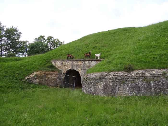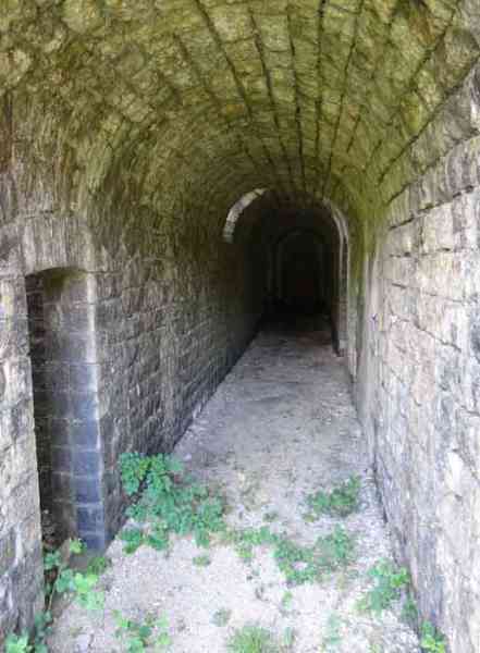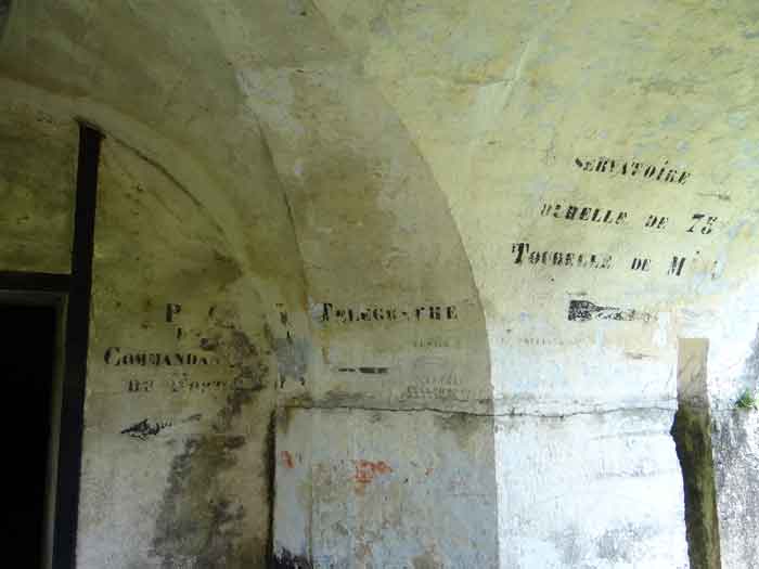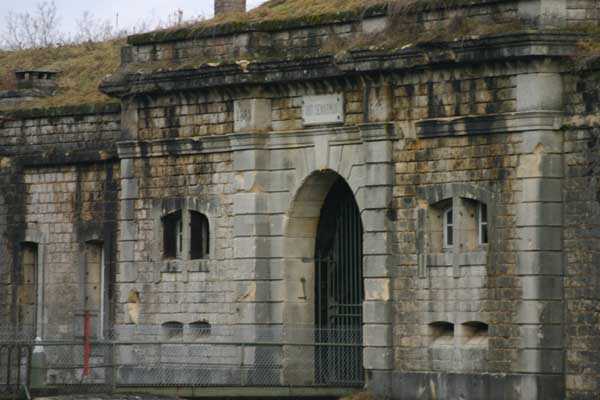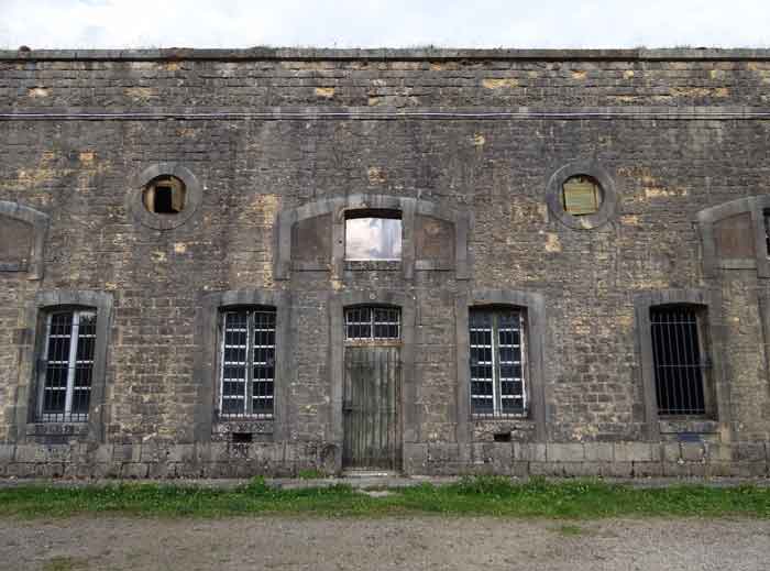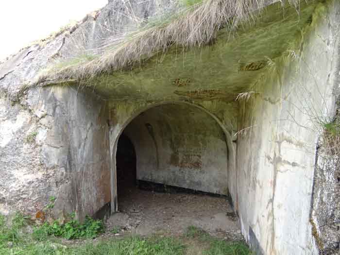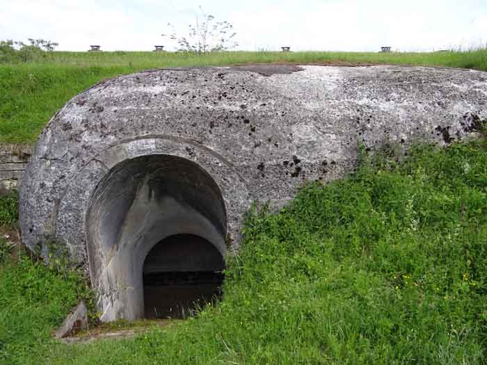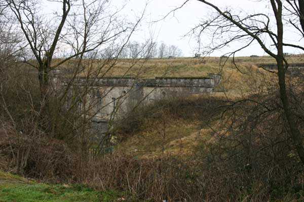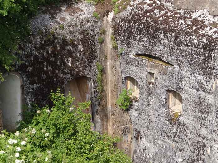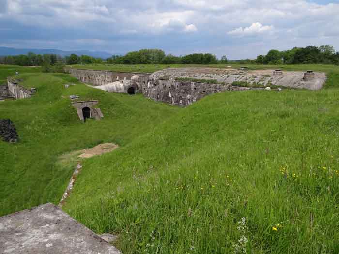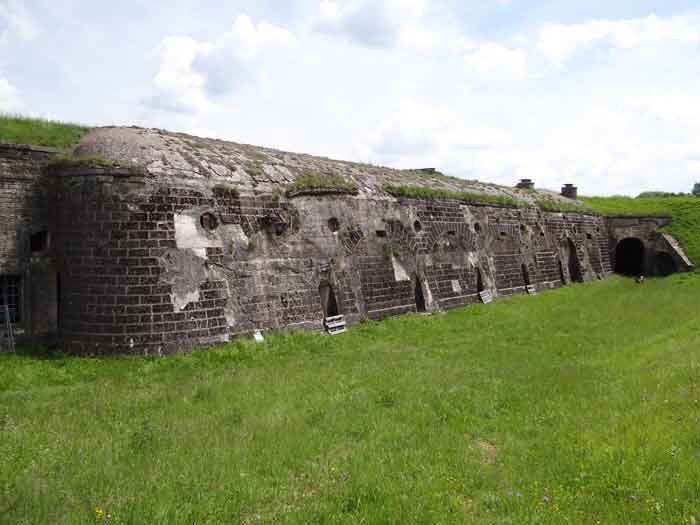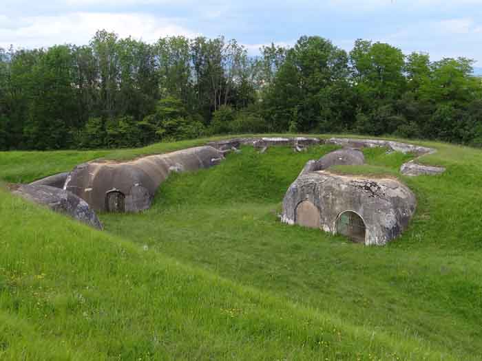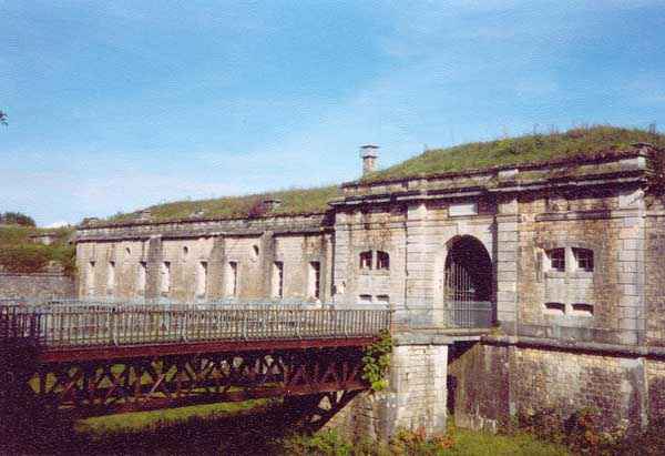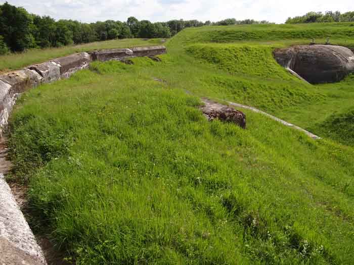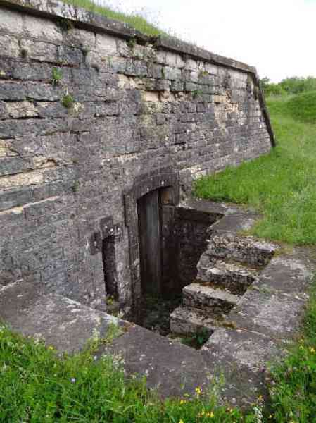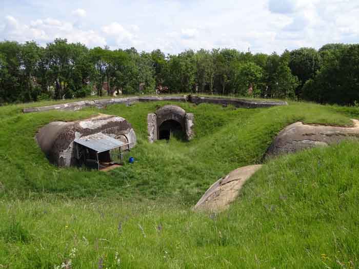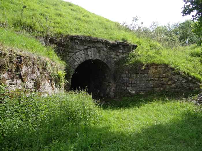 Belfort fortified camp, east of the city, 1883-1886. 381 m/alt. 673 men and 34 guns including 12 flanking. Called Fort Sénarmont. Large pentagonal fort with a broken gorge in the center of which is a wide curtain wall. Its ditches were defended by two wings (salients II and IV) and by a double caponier (salient III); the curtain wall coffers were responsible for protecting the gorge ditch with their crossfire. These coffers were preceded by a ditch preventing the attacker descending into the ditch from reaching their embrasures. The bottom of the curtain wall is occupied by ten casemates where, in particular, the officers were housed. The entrance to the fort consists of a porch separating the fifth from the sixth casemate. In front of it, on the glacis, we still find the stable building. The entrance porch, clad with its two guardhouses, projects slightly from the line of the casemates on the curtain wall. Quite attractive with its drip edge supported by small decorative corbels, it bears a plaque on the pediment indicating its name Boulanger. The entrance tunnel is quite short and opened in the center and in front of a perpendicular alignment of no fewer than 21 bays (on a single level) + two porches making up the troop barracks. These barracks were further extended on both sides by three rooms whose facades further lengthened the stretching of the whole. The imperfect is appropriate since, as we will see, modernizations have somewhat modified the initial appearance of the place. In the returns towards the gorge of the wings of the massif of the main barracks, there were two powder magazines. The rampart street had thirteen sheltered traverses distributed equally on the lateral and head flanks. Barely two years after its construction, the fort was outdated. The modernizations that were to be carried out there made this fort very interesting since one can see the disarray of the Engineers and the first efforts to deal with the torpedo shell crisis. For example, the artillery platforms were retained but the guns were placed under concrete shelters. The rampart street remained. From 1888, the five bays on the far left of the main barracks received a special concrete covering, 2.50 m thick and separated from the extrados of the vaults by 1.50 m of sand. This concrete covering was to be carried in front of the initial facade in order to create a circulation corridor in front of the latter. The circulation corridor at the rear was also maintained and protected in the same way. Note the concern to aestheticize the concrete by imitating, on the courtyard side, rubble masonry. Bessoncourt was the first in the area to have its caponiers replaced by counterscarp vaults, as early as 1895. The forts of Vézelois, Bois d'Oye and Roppe would not follow until eleven years later. That said, being the first would not have been very profitable for him since none of his vaults were connected to the central massif by an underground gallery. The caponier descent shafts were preserved and, at the height of the scarp wall, blocked by a gate. To reach the vaults, it was necessary to cross the open ditch. Probably at the same time (after 1896), a war entrance was created on the right of the curtain wall at the bottom of the ditch. Along the axis of this entrance, a concrete tunnel will lead to what was the second porch of the main barracks, located between bays 14 and 15. This porch, also concreted, will be extended to the rampart street facing the right outlet of a horseshoe-shaped infantry position, with a concrete gallery and chicane entrances, which will replace traverses 6, 7 and 8 in the capital. Similar positions will man salients II and IV and will have artillery sheds attached to them. Similar gun shelters, their two openings facing the gorge, will be cast in front of traverses 1 and 13, which will be condemned and filled with concrete. These shelters and infantry positions are a real particularity of this fort. The rounded concrete massifs are reminiscent of the Belgian forts of the Meuse which were being finished pouring (1892). The powder magazines will be very significantly modified. Only a few meters of the storage room will be preserved, the remainder being completely filled in. Below this backfilled section, the ventilated voids will then serve as a ceiling for a new projectile magazine, after the torpedo shell crisis, the latter being no longer manufactured in the forts. Access to these underground magazines will be from the passages rooted on either side of the large barracks, and this by a gently sloping gallery coming up against a lamp crenel backing onto the magazine airlock. In 1908 and 1909, the fort will receive its armor. Two 75 turrets will be placed next to the new accesses to the projectile magazines just mentioned. Thus, the fort of Bessoncourt will be the only one to have the entrance to its 75 turret blocks facing the front line. A machine gun turret will be intended for salient II and a second for salient V. Two armored observation posts were planned for the latter, but they were not installed. Only those of the 75 turrets and one intended for the command, installed roughly in the center of the III-IV front, will be. The infantry parapets will each have their observation sentry box. Plans had been drawn up to sink a concrete monolith for two 155 R Mle 1907 turrets near the fort. The two turrets would have been separated by projectile magazines as well as two large barracks. This project was not followed up. In 1917, the fort will have a network of underground galleries dug, a bit like those seen at Verdun. The vaults will be connected below the ditch and two diverticula will be launched under the front of the head to receive Pamart bells, bells which will never be installed. Visited in October 2001, the fort appeared to us to be in very good condition, notwithstanding the reinforcement of all its armor. The 1917 tunnel system is probably the most beautiful and intact we have eve