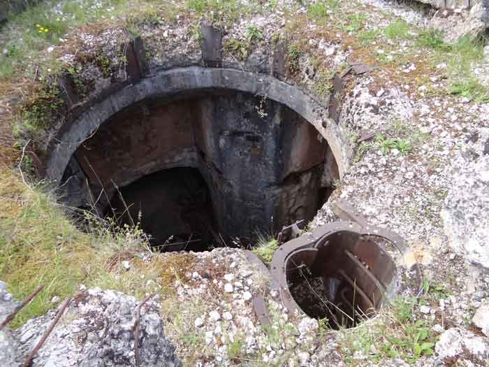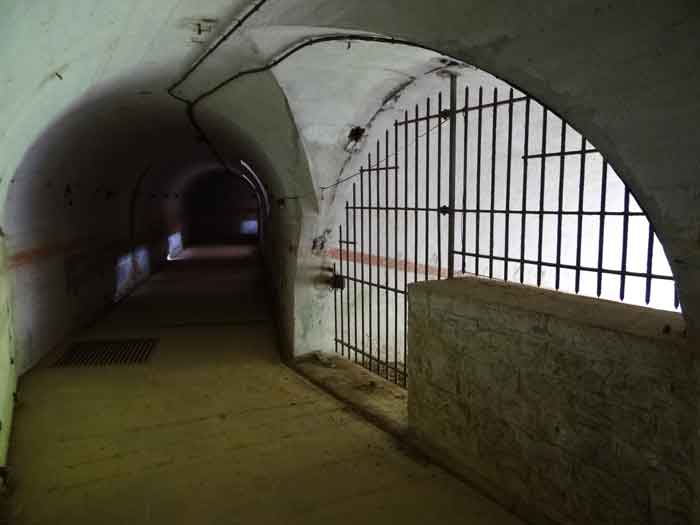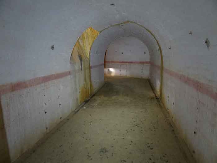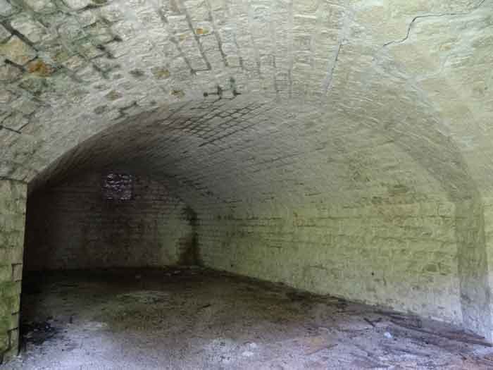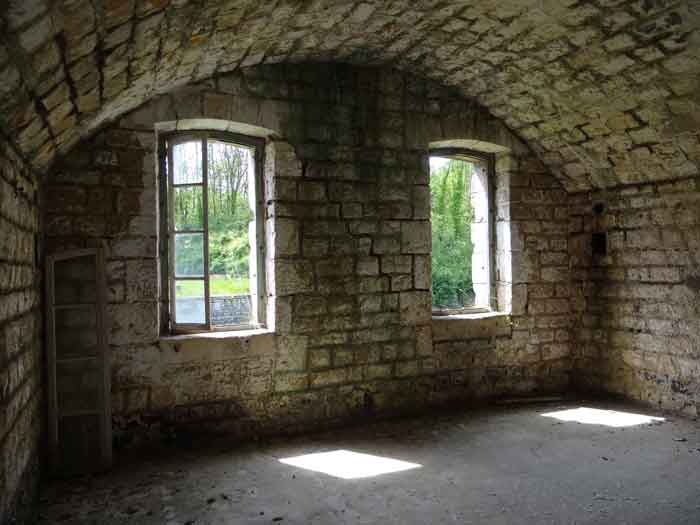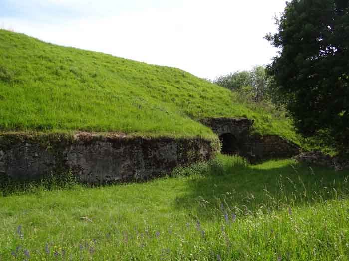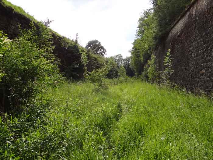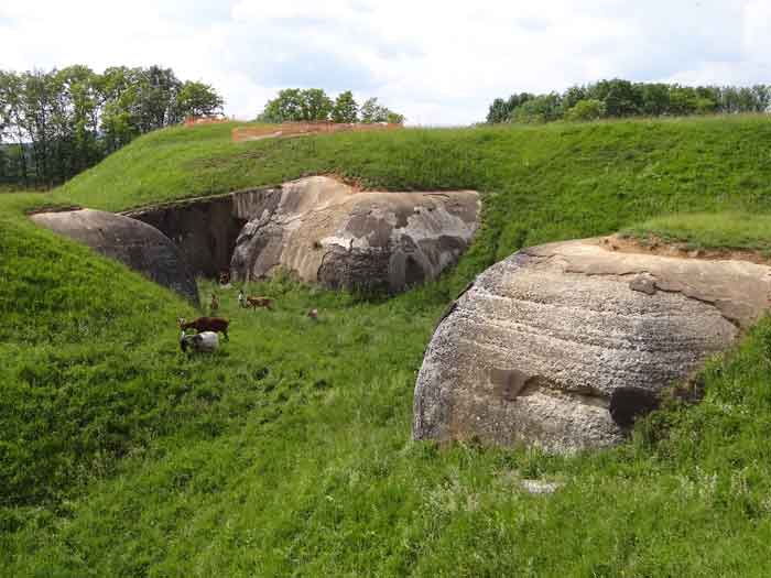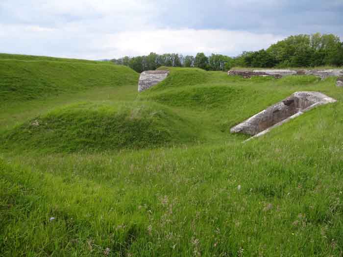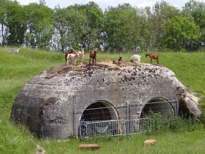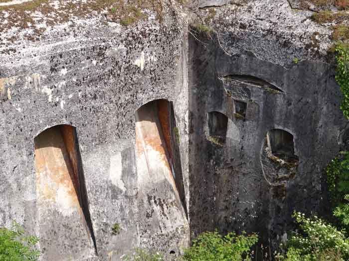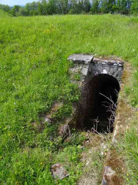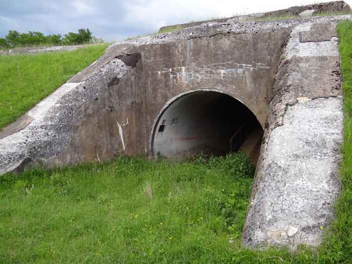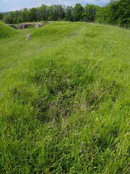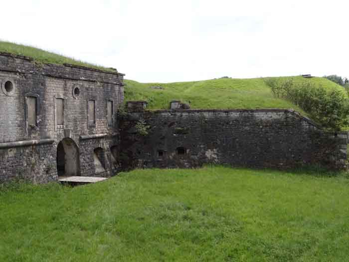 Belfort fortified camp, east of the city, 1883-1886. 381 m/alt. 673 men and 34 guns including 12 flanking. Called Fort Sénarmont. Large pentagonal fort with a broken gorge in the center of which is a wide curtain wall. Its ditches were defended by two wings (salients II and IV) and by a double caponier (salient III); the curtain wall coffers were responsible for protecting the gorge ditch with their crossfire. These coffers were preceded by a ditch preventing the attacker descending into the ditch from reaching their embrasures. The bottom of the curtain wall is occupied by ten casemates where, in particular, the officers were housed. The entrance to the fort consists of a porch separating the fifth from the sixth casemate. In front of it, on the glacis, we still find the stable building. The entrance porch, clad with its two guardhouses, projects slightly from the line of the casemates on the curtain wall. Quite attractive with its drip edge supported by small decorative corbels, it bears a plaque on the pediment indicating its name Boulanger. The entrance tunnel is quite short and opened in the center and in front of a perpendicular alignment of no fewer than 21 bays (on a single level) + two porches making up the troop barracks. These barracks were further extended on both sides by three rooms whose facades further lengthened the stretching of the whole. The imperfect is appropriate since, as we will see, modernizations have somewhat modified the initial appearance of the place. In the returns towards the gorge of the wings of the massif of the main barracks, there were two powder magazines. The rampart street had thirteen sheltered traverses distributed equally on the lateral and head flanks. Barely two years after its construction, the fort was outdated. The modernizations that were to be carried out there made this fort very interesting since one can see the disarray of the Engineers and the first efforts to deal with the torpedo shell crisis. For example, the artillery platforms were retained but the guns were placed under concrete shelters. The rampart street remained. From 1888, the five bays on the far left of the main barracks received a special concrete covering, 2.50 m thick and separated from the extrados of the vaults by 1.50 m of sand. This concrete covering was to be carried in front of the initial facade in order to create a circulation corridor in front of the latter. The circulation corridor at the rear was also maintained and protected in the same way. Note the concern to aestheticize the concrete by imitating, on the courtyard side, rubble masonry. Bessoncourt was the first in the area to have its caponiers replaced by counterscarp vaults, as early as 1895. The forts of Vézelois, Bois d'Oye and Roppe would not follow until eleven years later. That said, being the first would not have been very profitable for him since none of his vaults were connected to the central massif by an underground gallery. The caponier descent shafts were preserved and, at the height of the scarp wall, blocked by a gate. To reach the vaults, it was necessary to cross the open ditch. Probably at the same time (after 1896), a war entrance was created on the right of the curtain wall at the bottom of the ditch. Along the axis of this entrance, a concrete tunnel will lead to what was the second porch of the main barracks, located between bays 14 and 15. This porch, also concreted, will be extended to the rampart street facing the right outlet of a horseshoe-shaped infantry position, with a concrete gallery and chicane entrances, which will replace traverses 6, 7 and 8 in the capital. Similar positions will man salients II and IV and will have artillery sheds attached to them. Similar gun shelters, their two openings facing the gorge, will be cast in front of traverses 1 and 13, which will be condemned and filled with concrete. These shelters and infantry positions are a real particularity of this fort. The rounded concrete massifs are reminiscent of the Belgian forts of the Meuse which were being finished pouring (1892). The powder magazines will be very significantly modified. Only a few meters of the storage room will be preserved, the remainder being completely filled in. Below this backfilled section, the ventilated voids will then serve as a ceiling for a new projectile magazine, after the torpedo shell crisis, the latter being no longer manufactured in the forts. Access to these underground magazines will be from the passages rooted on either side of the large barracks, and this by a gently sloping gallery coming up against a lamp crenel backing onto the magazine airlock. In 1908 and 1909, the fort will receive its armor. Two 75 turrets will be placed next to the new accesses to the projectile magazines just mentioned. Thus, the fort of Bessoncourt will be the only one to have the entrance to its 75 turret blocks facing the front line. A machine gun turret will be intended for salient II and a second for salient V. Two armored observation posts were planned for the latter, but they were not installed. Only those of the 75 turrets and one intended for the command, installed roughly in the center of the III-IV front, will be. The infantry parapets will each have their observation sentry box. Plans had been drawn up to sink a concrete monolith for two 155 R Mle 1907 turrets near the fort. The two turrets would have been separated by projectile magazines as well as two large barracks. This project was not followed up. In 1917, the fort will have a network of underground galleries dug, a bit like those seen at Verdun. The vaults will be connected below the ditch and two diverticula will be launched under the front of the head to receive Pamart bells, bells which will never be installed. Visited in October 2001, the fort appeared to us to be in very good condition, notwithstanding the reinforcement of all its armor. The 1917 tunnel system is probably the most beautiful and intact we have eve