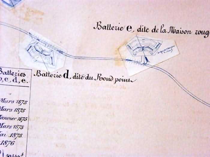 Fortress Paris. Battery E, annex of the fort of Cormeilles, between the redoubt of Franconville and the battery of Rond-Point. Simple earthen rampart with shelter traverses. Sometimes referred to as "du Château-Rouget" or "du Chapeau-Rouge".