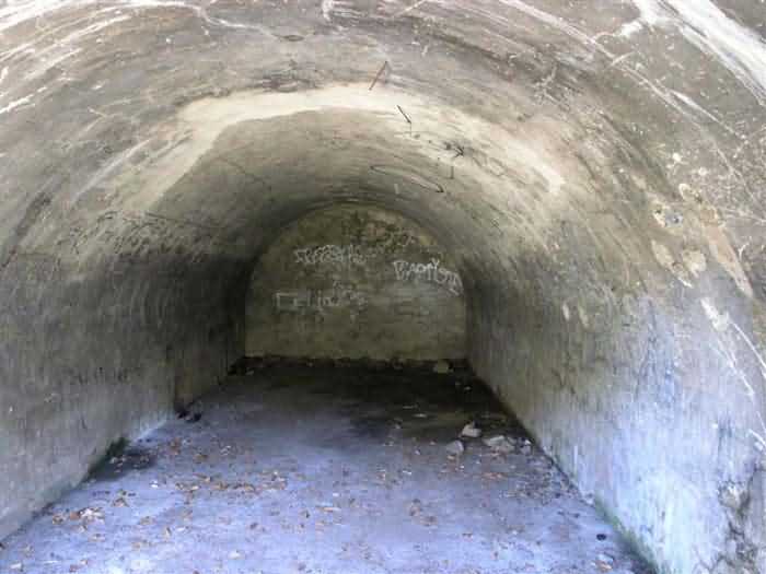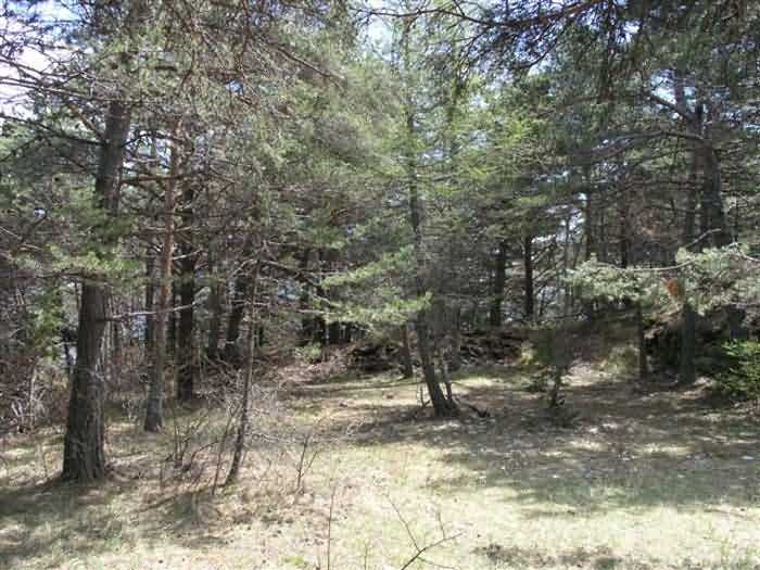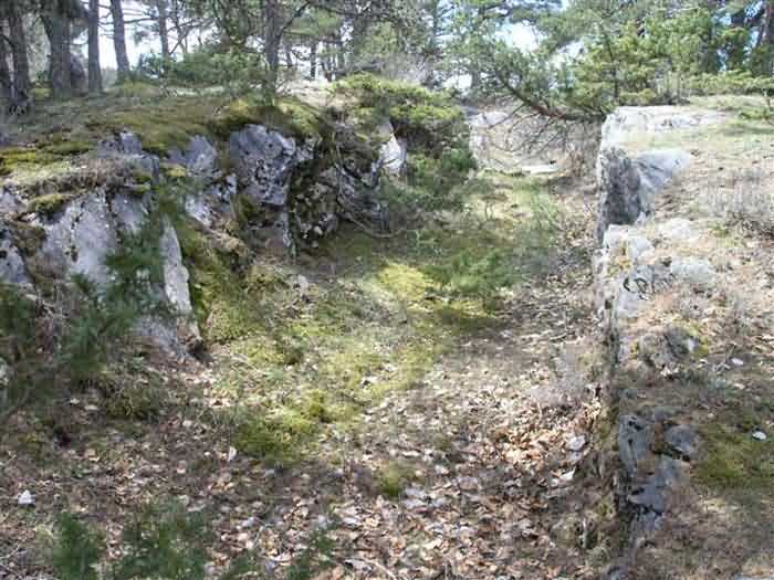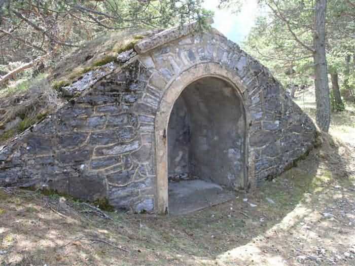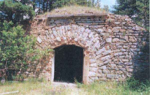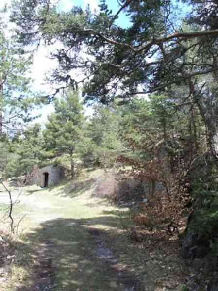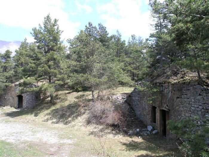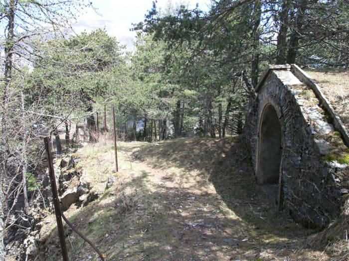 Fortress of Saint-Vincent, southeast of the fortress, 1883-1885. 1464 m/alt. Located 2500 m ahead (upstream) of Saint-Vincent Fort, this battery monitored the Ubaye valley. An area was leveled to receive two traverse-shelters framed by three double platforms. The left traverse had a water pump in the hollow of a niche on the facade, a pump drawing water from a cistern under the shelter. Its wide door made it a magazine and a gun shed. The right traverse, with its narrow door and small window on the facade, seems to have been devoted to accommodation. On the left and behind the firing steps, a small niche in rubble masonry may have sheltered infantry ammunition, but this is with all reservations. The battery is in a remarkable state of preservation, including its reliefs. The landscape and views of the Ubaye valley both upstream and downstream are superb. The left side of the battery rests on a precipice and an infantry crest protects it on its rear. The detour is worth it, and why not have, as we did, a packed lunch there? The path to be taken continues to the Tour ravine post. Completely free access (05/2008). Sometimes spelled "Châtelard".