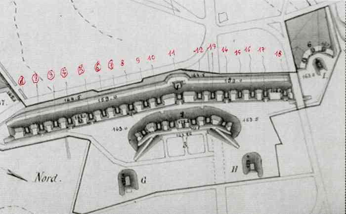 Fortress Paris, south-southwest of the city, 1880. 165 m/alt. Annex battery for around thirty guns to the west of the fort of Châtillon, connected to the latter by a covered way. As such, it can be considered an integral part of the envelope of the neighboring fort, even though the rear of this annex seems to have been free of any obstacles. The two plans of the tops consulted do not even indicate a covered way at the throat of this battery. This cut is an important structure whose origin dates back to the conflict of 1870. The French established a redoubt here because the position dangerously dominated (75 m difference in altitude) the forts of Montrouge, Issy and Vanves. This cut, initially called a redoubt, was established across the N 306 to 150 m northeast of the eponymous fort. After 1874, the redoubt gave way to a line of 18 traverses separated by artillery platforms, the eleventh providing access to a small double caponier flanking the ditch dug on the front line alone. The leftmost traverse was located less than twenty meters from the V salient of the neighboring fort. To the right of this impressive line, adjoining it was a small horseshoe-shaped structure whose arch sheltered three other traverses and the hollow an imposing earthen parados under which a shelter had been built. Behind the main line of traverses, between the eighth and fifteenth, a high battery with six other traverses was erected. The central platform of this cavalier was designed for two guns. It is likely that magazines or even barracks were arranged below this cavalier. Behind each end of this high battery, at the level of the main line of traverses, there were two small isolated and waterproof magazines. This complex is now completely destroyed. It consisted of a line of 18 traverses separated by artillery platforms, the eleventh providing access to a small double caponier flanking the ditch dug on the front line alone. To the right of this impressive line, adjoining it was a small horseshoe-shaped structure whose arch housed three other traverses and the hollow an imposing earthen parados. Behind the main line of traverses, between the eighth and fifteenth, a high battery with six other traverses was erected. The central platform of this cavalier was designed for two guns. Behind each end of this high battery, at the level of the main line of traverses, there were two small magazines. This complex is now destroyed.