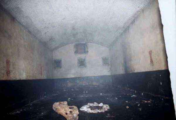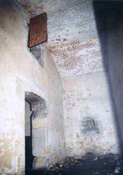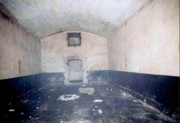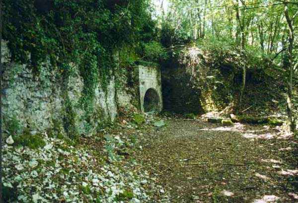 Fortress of Besançon, south of the city, 1889. 380 m/alt. Powder magazine under rock established below and to the east of the hill supporting the old fort of the same name. The configuration of the storage room makes it look more like an 1874 model magazine than a classic rock magazine. The vault of the storage room is segmental arched and made of terracotta bricks. Each side of the magazine has two barbicans for ventilation. There are three lamp crenellations, aligned on the same plane. The side galleries are lined with solid buttresses resting on corbels. In 2001, this magazine was freely accessible, in relatively good condition, but very damp. See also Chaudanne (fort).