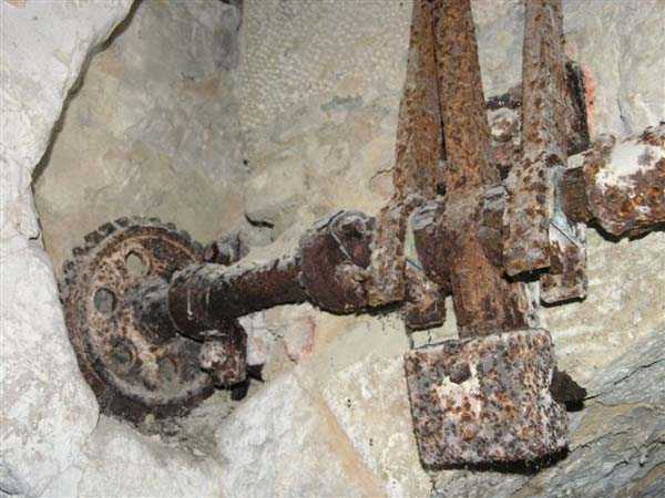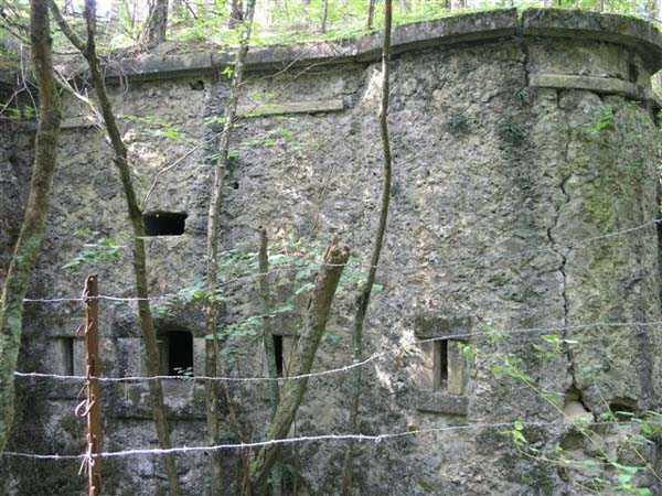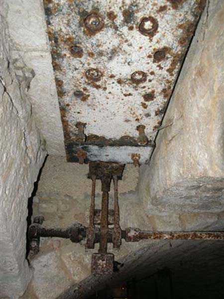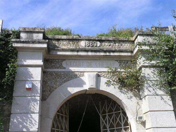 Festung von Reims, nordwestlich der Stadt, 1879–1880. 201 m ü. M. Genannt „Redoute oder Batterie Ronzier“. Das letzte Bauwerk im Gürtel nordwestlich der Stadt Reims und südlich des Forts Saint-Thierry für 138 Mann und 8 Kanonen. Es hat die Form eines unregelmäßigen Trapezes und verfügt an der Kehle über eine Kurtine, die durch zwei kleine Truhen für Musketenfeuer geschützt wird und deren Rückseite von den vier Jochen auf zwei Ebenen (Erdgeschoss und Keller) der Kaserne eingenommen wird. Diese wurde vor kurzem sandgestrahlt (08/2007) und die Zinnen im Keller modifiziert, wobei jedoch eine gewisse Ästhetik erhalten blieb. In der Mitte dieser Kaserne dient ein fünftes, schmaleres Joch als Eingangsportal. Dieses ist schön eingepasst und verfügt über einen schönen Puffer, der das Anheben der darunter liegenden Zugbrücke abfedert. Die Hohlräume zwischen den steinernen Eckketten sind mit Bruchsteinmauerwerk in Opus Incertum gefüllt, allerdings mit viel kleineren Steinen als an der übrigen Fassade der Kaserne. Die beiden Verteidigungszinnen dieses Portals befinden sich in 2 m Höhe und sind nach unten hin stark erweitert. Das Kapitell ist gepflastert und umfasst hinter der Kaserne links einen 50 m tiefen Brunnen und rechts, auf Höhe des Brunnens, die Treppe, die die beiden Gebäudeebenen verbindet. Gekrönt wird der Brunnen von einer sehr alten, allerdings undatierten elektrischen Pumpe. Sie trägt die Aufschrift „RBR N° 2 E. KAMMER constr. REIMS“, und der Motor stand auf einem Sockel in der Nähe. Er trieb einen Riemen an, der ein 82 mm breites Rad mit einem Durchmesser von 82 cm antrieb, das mit einem weiteren Rad von 42 cm Durchmesser gekoppelt war, an dem eine Pleuelstange mit kurzem Hub befestigt war. Im Brunnenraum befinden sich außerdem zwei Metallzisternen sowie eine an der Seite gelagerte antike Handpumpe. Die Treppe führt senkrecht zum Gewölbe des Verkehrskorridors ins Untergeschoss. Die Kante dieser Kreuzung ist ein Juwel aus Mauerwerk. Der Wirtschaftsraum der Zugbrücke beherbergt noch immer den wesentlichen Teil des Mechanismus. Kurioserweise befindet sich unter dem Brunnenraum ein weiterer Raum … durch den die Auskleidung des Brunnens aus vertikal verlegten Terrakotta-Ziegeln verläuft. Das Kapitell endet in einer Gabelung, deren Arme jeweils auf einen kleinen Innenhof führen. In dieser Gabelung befindet sich eine sehr hübsche Rotunde und ein Brunnenterminal, hinter dem sich die Latrinen befanden. Die Front I-II umfasst zwei beschichtete Schutztraversen Mle 1879, hinter denen sich der Pulvermagazinblock mit einem Fassungsvermögen von 30.000 kg befindet. Letzterer ist 3,5 m breit und etwa 15 m lang, hat ein halbrundes Gewölbe, das knapp 3,2 m hoch ist, und wurde durch zwei Lampenzinnen beleuchtet. Die Aufteilung dieser Zinnen wurde durch die Entfernung einer Zinne zugunsten einer Tür verändert. Diese Veränderung scheint sehr alt zu sein, so dass wir uns über das tatsächliche Vorhandensein dieser zweiten Zinne wunderten, denn um den Lampenraum zu bedienen, musste man damals, da es keine Seitengalerien gab, ins Freie treten und den Magazinblock umgehen. Die Anordnung der verschiedenen Stürze, die die Öffnungen einrahmen, ist verwirrend und erlaubt uns keine Klärung der Frage. Auf der Eingangsseite des Ladens muss man senkrecht einen eingegrabenen Gang der Rue du Rempart (mit einer weiteren prächtigen Rotunde aus Mauerwerk) überqueren, um die Traverse 3 zu erreichen. Deren Räumlichkeiten sind durch eine dünne Ziegelwand, die sie vom Abstiegsschacht zur Doppelkaponniere isoliert, schmaler. Heute ist diese Wand eingestürzt, und der Innenraum der Doppelkaponniere… abgeteilt! Die Hauptschießscharte auf jeder Seite hatte einen Schiebeladen zwischen zwei vertikalen Führungen im Abstand von 78 cm. Zwei Rollen mit einem Durchmesser von 14 cm halfen bei der Bedienung. Beachten Sie ein weiteres sehr schönes Gewölbe in dieser Kaponniere. Die Stirnseite umfasst drei weitere Traversen, von denen die mittlere in einer Erdmasse verankert ist, gegenüber der sich die Kapitellgabelung befindet. Der Zugangsschacht zum Flügel des Vorsprungs III mündet nicht in einen tiefen Gang, sondern in den rechten Hof, gegenüber dem rechten Ausgang der Kapitellgabelung. Aus Sicherheitsgründen wurde uns der Zutritt zu diesem Flügel verwehrt, der als gefährlich baufällig gilt. Stirnseite III-IV schließlich umfasst die Schutztraversen Nr. 7 und 8, beide aus dem Mle 1879 und verkleidet. Die Redoute wird von einem trockenen Graben mit einer Böschung und einer Kontereskarpe aus fließender Erde umgangen. Die Kontereskarpe ist jedoch auf der Höhe der Kaponnieren verkleidet. Den Fuß der Böschung ziert noch immer ein Verteidigungsgitter. Dieses, im April 1991 noch vollständig, wurde vor dem Schluchtvorhang leider entfernt. Die bewohnte Redoute ist zum Zentrum eines Reitzentrums geworden und nicht für die Öffentlichkeit zugänglich.