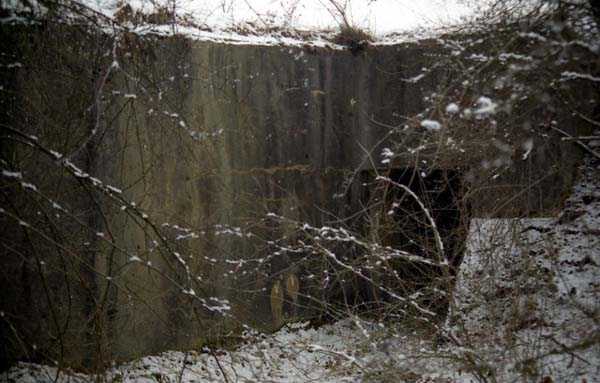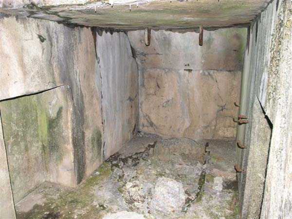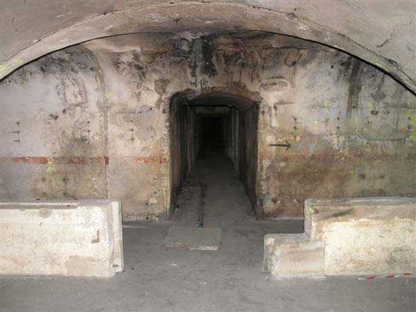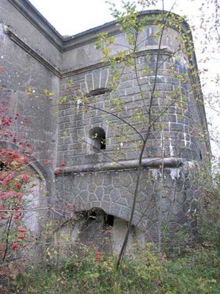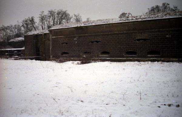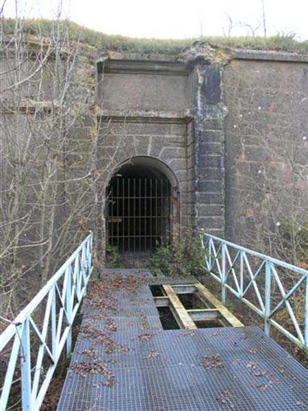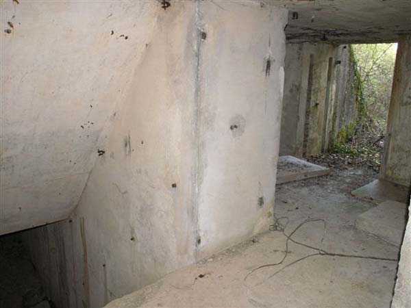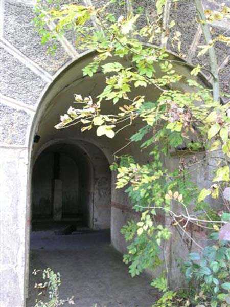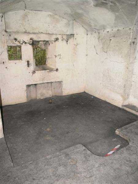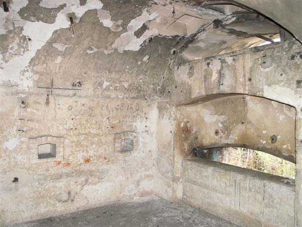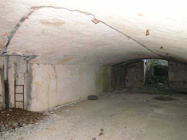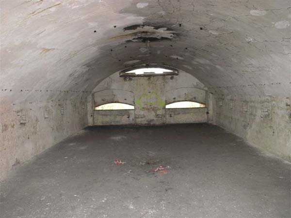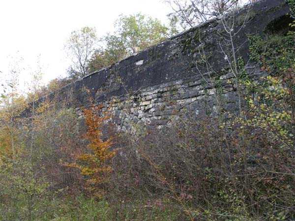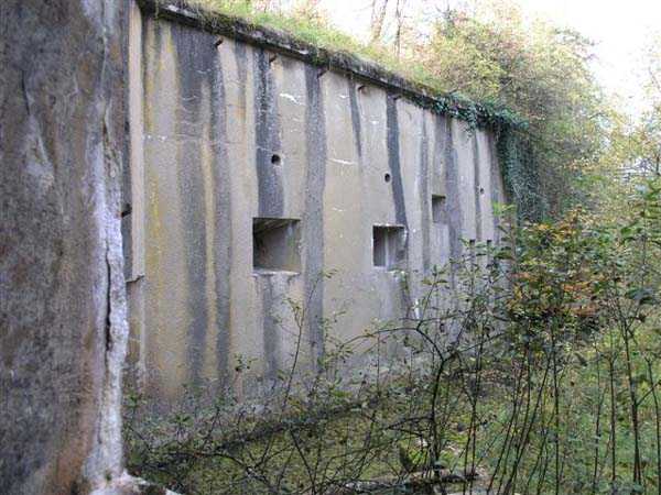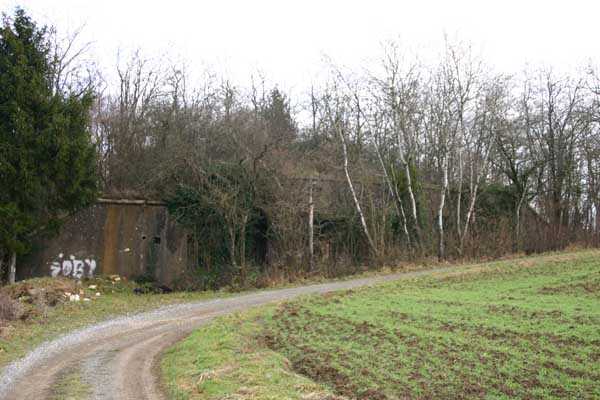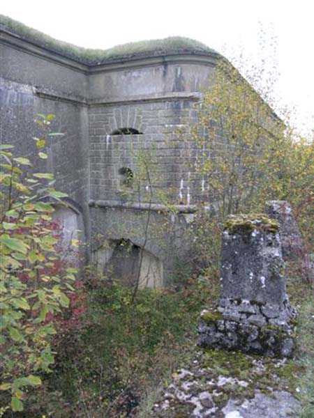 Belfort fortified camp, ESE of the town, 1889-1890. 385 m/alt. Trapezoidal structure occupying the interval between the forts of Vézelois and Bessoncourt. Initially a simple infantry structure, apart from its barracks, it was completely rebuilt in 1906. The ditches were given a triangular profile with a lined counterscarp. Their entire perimeter included a grid at the foot of the escarpments made of flowing earth. The defense of these ditches was ensured by counterscarp coffers, single at salient II and double at salient III. The concrete barracks protrude into the gorge, thus the defense of the ditch was ensured from the sides of this building, the cement covering of which was worked in such a way as to imitate rubble masonry. Note that the arch of the foot crenelation of the basement embrasures, embrasures for a 12-pounder gun and a searchlight, had to be cut out for the installation of this equipment. This is a foot crenelation of the former infantry structure. It is no longer possible to serve this foot crenelation from the upper floor, the room being occupied by a revolver cannon and no longer having any other opening than the embrasure of this gun. The structure of Chèvremont must have had a certain family link with that of Monceau; the barracks will therefore have been preserved with these small modifications to the defense of the gorge. Two doors with drawbridges allowed access to the structure, one on each side of the barracks block. The latter comprises two floors (a ground floor and a basement) with a total of four large barracks for the troops and a whole series of related premises for non-commissioned officers and officers, latrines, etc. Note in passing the support of a balance pump still surmounting a cistern. Beyond the circulation corridor at the rear of the barracks, another series of premises surmounts the cisterns. This extension is crossed perpendicularly by the capital gallery on which a power station has been grafted. Beyond, it gives right to a machine gun turret at the right rear of which is the command observatory. From here, two diverticula branch off laterally, serving the counterscarp chests as well as, in passing, two 75 Mle 05 turrets. The substructures of these two turrets are identical. From the gallery parallel to the front, you have to go down a flight of stairs leading, about 3 m below, into a large room where light partitions (now gone, only traces remain on the ceiling) separated the projectiles from the men whose bench supports are still fixed to the wall. This room provides level access to the turret's balance floor, at the foot of the armored observatory shaft, but also to the descent shaft to the corresponding counterscarp box. When they took action, the scrap metal dealers recovered the voussoirs of the 75 turrets with explosives, this caused a certain quantity of concrete rubble. This rubble was pushed into the access shafts to the boxes, making access difficult today. That being said, if the metal salvagers took the trouble to go with a ladder to remove one by one the letters of the name of the structure from its pediment, they abandoned these boxes which had become difficult to access. The shaft of the double box still has its grille. Most of the metal elements such as the bench and brush supports are in place. It is also worth noting the presence of twelve (double chest) and six (single chest) collars for attaching oxygen bottles from the oxyacetylene plants. The originality of the gallery leading to the single chest lies in the extraordinary development of saltpeter that can be observed there. The work contains rare wall inscriptions, but, as is customary in Belfort, marks intended to help re-aim the 12-gauge breech-loaded cannon, marks in the form of a cross or a simple vertical line, sometimes called "sand sights", are faithful to the position at the rear of each of the embrasures of these cannons, except for the one flanking salient I. In the barracks, in the flanking casemates on the ground floor, a deep line in the ground allowed the revolver cannon to be wedged. The upper parts, between the line of armor and the barracks massif, are organized in infantry positions. On either side of the barracks is a concrete shelter from which one can access an observation post. These shelters are quite original with several niches, a curved entrance, one end with a cul-de-four vault, etc. On the glacis, a vast network of barbed wire completely surrounded the structure. The structure is generally in good condition (10/2007), notwithstanding the disappearance of its armor and some rooms where fires have blackened the walls. This is a military site dependent on the 35th Infantry Regiment and access is prohibited. The glacis in front of the gorge are still lined with barracks that served as barracks and stores in peacetime. There are probably some dating from the interwar period. Some are in a state close to ruin. We were told that unit insignia painted on the walls were still visible here and there, but we were unable to verify this.