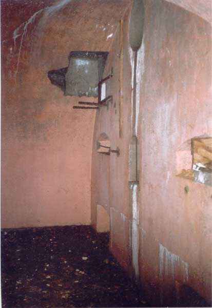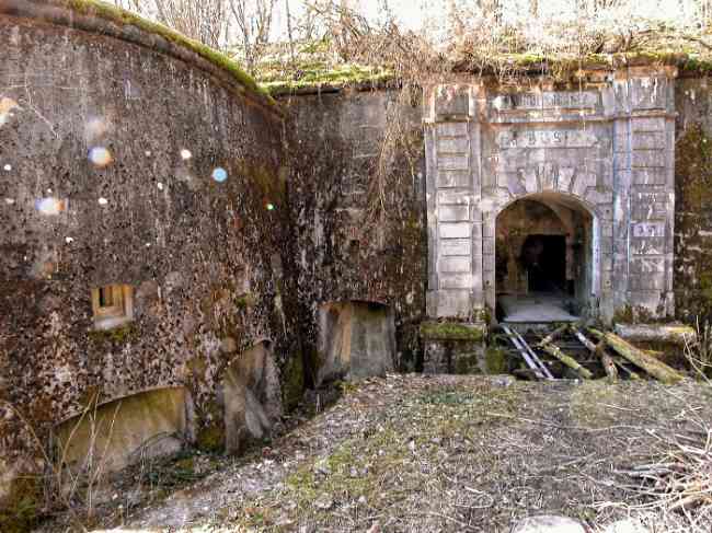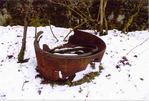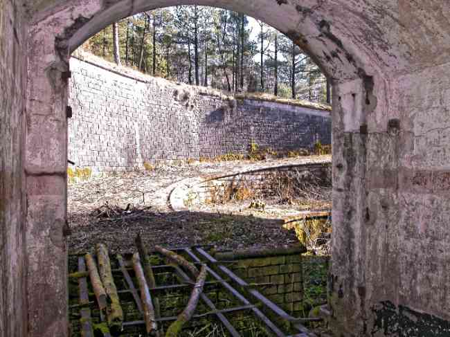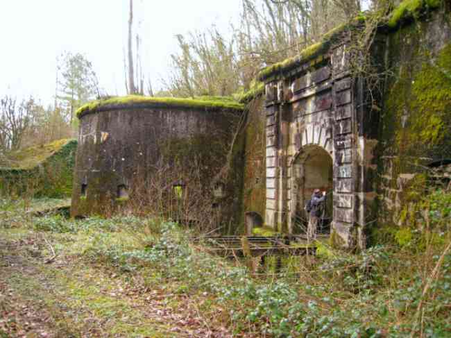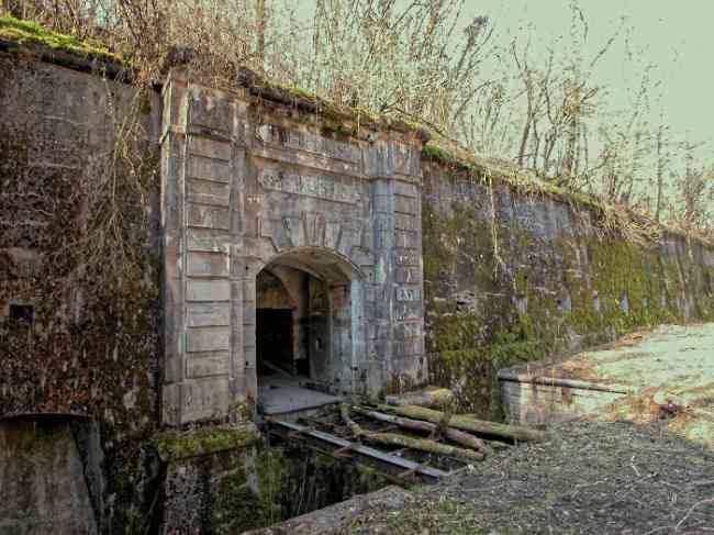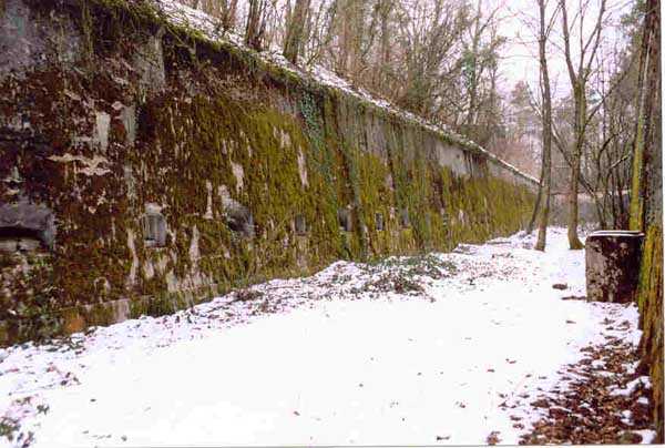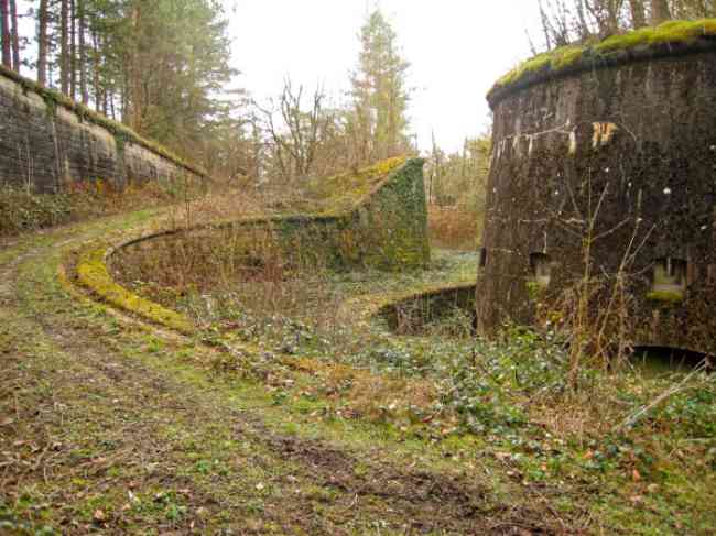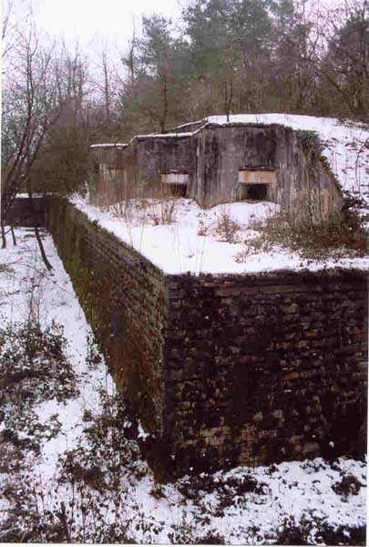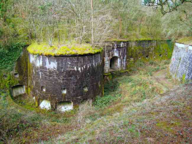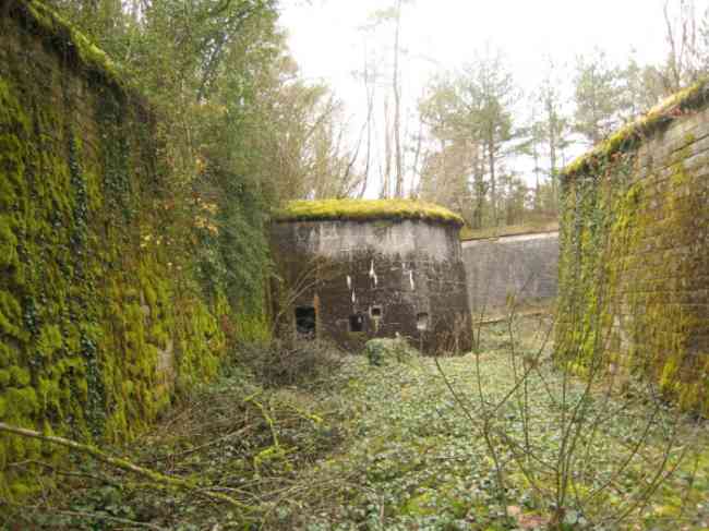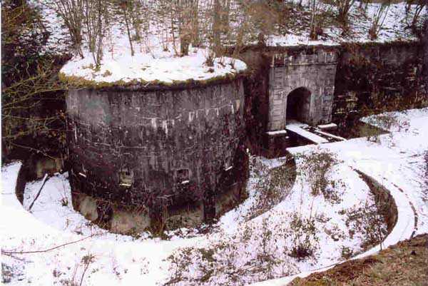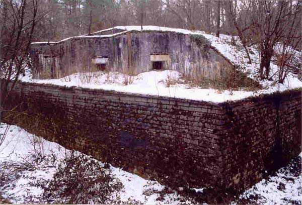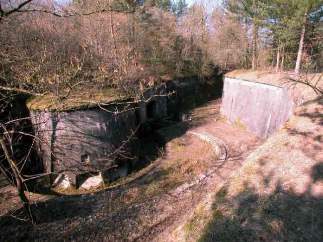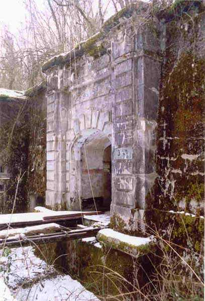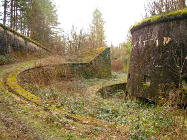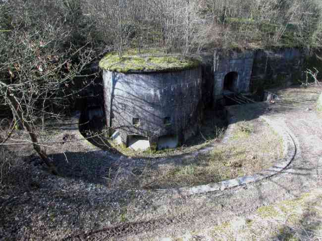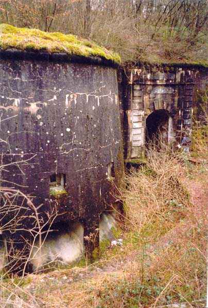 Verdun fortified camp, west-northwest of the city, 1883-1886. 289 m/alt. Called fort Manèque. Pentagonal fort for which we have been unable to find a plan before modernization. We can bet that the current counterscarp coffers (single at salients II and IV and double at salient III) replaced caponiers, that the barracks were preceded by a courtyard and surrounded by a street of the classical rampart; this is subject to verification, of course. This reservation is more than necessary because it would have been foolhardy of us to be satisfied with such a simplistic hypothesis. Indeed, the old barracks are located at the same level as the glacis and its barracks have battlements instead of windows. We are therefore dealing with a defensive barracks that is reminiscent of that of the Belle Épine post. Therefore, did not this barracks constitute the bottom of a curtain wall, a curtain wall absorbed by the extension towards the gorge required by the concreting of the war barracks? This is simply to demonstrate that in the absence of reference, it is always advisable to take advantage of what the terrain shows us and to avoid drawing hasty conclusions. Choisel was modernized or rather redesigned in several phases (1894, 1901 and 1906), which will give rise to a resolutely modern structure. A ramp descends, resting on the counterscarp, reaching the bottom of the ditch opposite the entrance. This entrance is preceded by a small ditch crossed by a drawbridge of the longitudinal Tripier type (with a bascule underneath). To the left of the entrance is a double caponier protected by the extension of the small ditch in front of the entrance. This horseshoe-shaped caponier is practically identical to that of the fort of Sartelles. To the right of the entrance is the alignment of the five large barracks of the concrete barracks. These barracks are preceded by a circulation corridor whose battlements overlook the gorge ditch. Note, a rare thing, that a urinal with a drainage pit is leaning against the counterscarp facing these barracks. Behind and right next to these barracks, a notch higher, is the old barracks. Two-thirds of the latter was buried so that these premises could continue to be occupied, but with a certain protection. As is the case in most of the reworked structures, the combat organs can be reached without leaving the protection of concrete ducts. Thus, behind front I-II, one can access a first Bourges casemate. The staircase joining the firing chambers to the basement has disappeared, but we will note that each of these firing chambers has its own niches for supplying ammunition. Behind the machine gun turret located to the right of this casemate, is the access shaft to the single vault of salient I. The latter is quite conventional except for its pink wall painting. The capital opens onto a rooted and chicane passage in which one can observe a washhouse as well as, singularly offset to the left in relation to salient III, the old access shaft to the caponier of this salient. We do not understand the usefulness of having preserved it, especially since it is blocked at its end, but it is a case that one sometimes encounters. Parallel to this shaft, a few meters on the right, is another, concreted, which leads to the double vault and to the 75 Mle 05 turret. It is necessary to return to the war barracks and cross it to reach behind the IV-V front a second Bourges casemate whose observatory has preserved its goniometer support. This casemate touches, within a meter, the gorge escarpment with its right rear and that of the IV-V front with its wing protection wall; this shows how close it is to the ditch. Via the left of this casemate, we reach a machine gun turret itself bypassed by the gallery leading to the simple vault of the IV salient. Note, on the top, between this machine gun turret and the 75 turret the presence of an infantry parapet with an observation sentry box whose neck is very long. Visited in February 1999 and March 2005, Choisel, although military terrain, is abandoned. It still has all of its armor. However, in 1944, the U.S. troops, before going to confront the Siegfried Line, carried out explosive tests here. Thus, the three armored observation posts were broken and their pieces stuck in their respective shafts. The body of the machine gun turret of salient II lies in the ditch, turret 75 resembles a puzzle with pieces scattered across the top. The cap of the machine gun turret of salient IV lies intact, three meters from its shaft. Even the armored sentry box appears to have received a massive hammer blow. That said, the underside of turret 75 offers a unique and Dantesque spectacle. During the explosion, the turret was in battery. The force of the blast pushed it back so violently that its lever arm was broken clean off. The rest of the mobile part, shredded, has something pathetic about it. From 1916-17, work was done to make it a center of resistance; galleries were chicaned, and an underground network with a cumulative length of 807 m, with access to two Pamart cloches, was dug. The most motivated will manage to find two concrete cisterns, isolated from the surrounding walls to reduce the vibrations caused by bombardment, cisterns one of whose faces is covered with graffiti dating from the 1920s. If it weren't for the state of its armor, and even then it is very informative, the fort is in a very satisfactory state of preservation. Note an annex battery on either side of the fort. A third was planned in the 1909 program, much further back, about 800 m to the east, for 4 x 155 L, but it seems to have remained in the boxes. In June or July 2008, the fort's gate was walled up with concrete blocks.