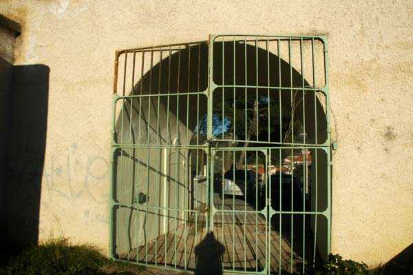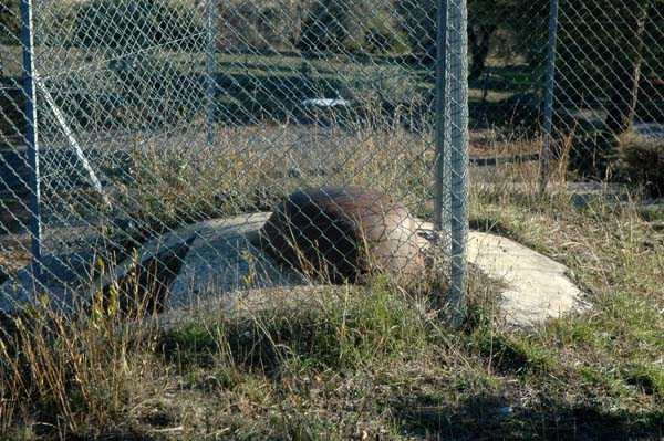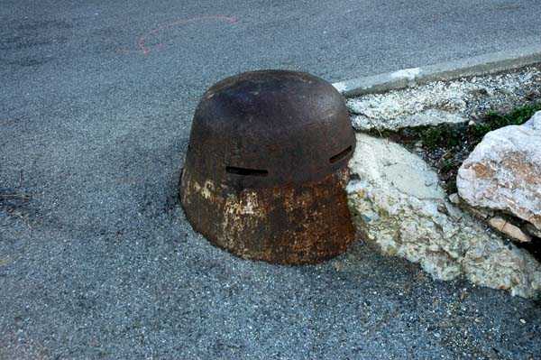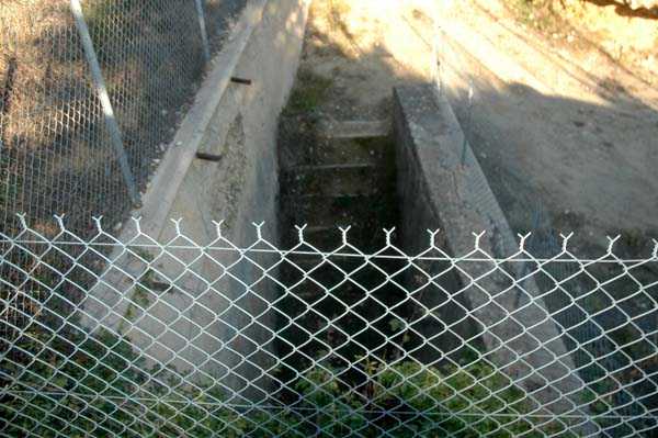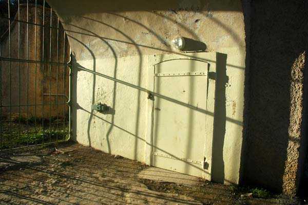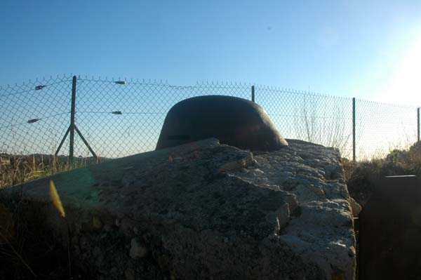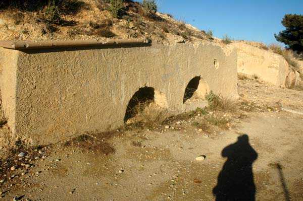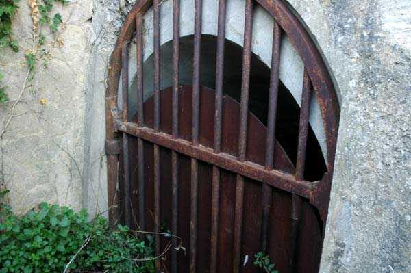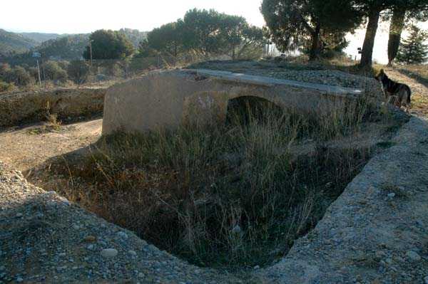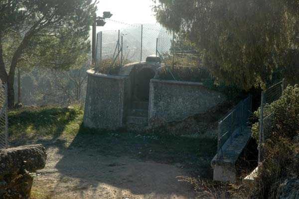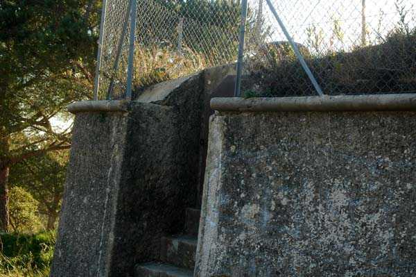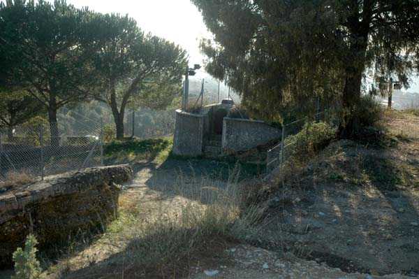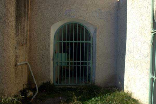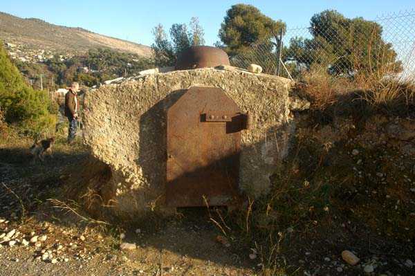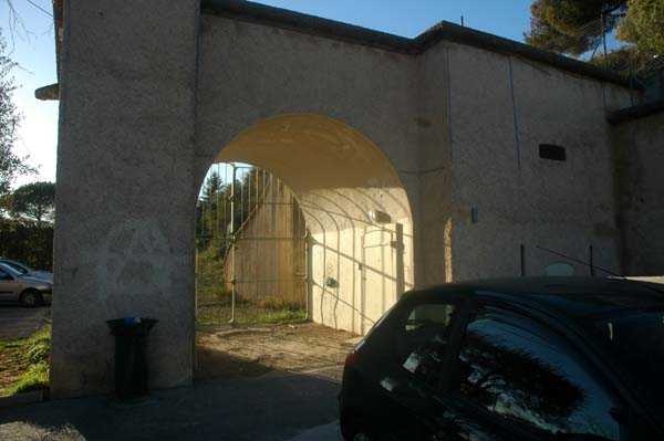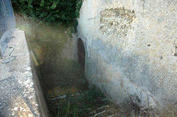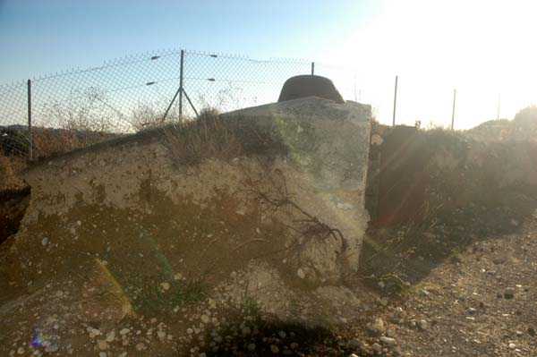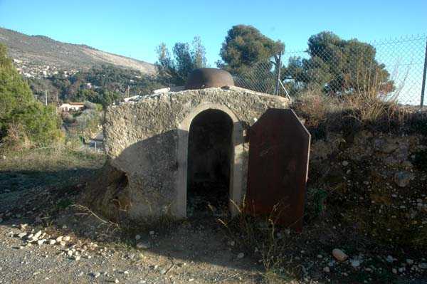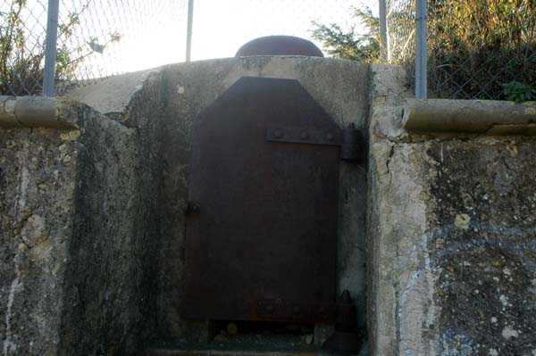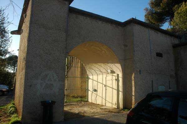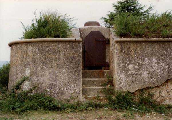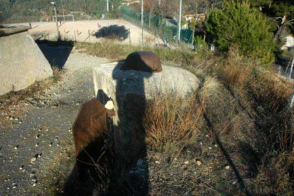 Fortress of Nice, north-north-west of the town, ± 1888. 290 m/alt. Located 2500 m west-south-west of the fort of Mont Chauve d'Aspremont, it had views over the Var valley. We have not unearthed any plan of this work that old maps mention as battery of the Cabanes. These same maps show us a rectangular, almost square work, with an outgrowth at salients II and IV. On site (05/2008), the work has become difficult to read. It is totally phagocytized by a sports complex that has literally nibbled it away. The entrance porch no longer resembles much. Nevertheless, at about one meter in height, on the right, a small cogwheel (nine ogival teeth separated by a flat of about one and a half times the height of each tooth) of a diameter of about 25 cm testifies to the presence of a drawbridge whose type we could not determine. Of a ditch, there is no more trace, no more than of a scarp to the left of this porch moreover. The latter has moreover been covered with an awful rendering. This work is no more than fifteen to twenty years old. The entrance porch is hardly more than four meters in length. Beyond, one engages straight ahead on an ascending ramp which, shortly before reaching a bastion at salient II (or what remains of it), performs a 180° turn. On the outside of this turn, a sentry box-observation post has preserved its armored door. It looks ahead of front I-II. To its right, a staircase allows to reach a small artillery magazine. Thus retracing the path towards the gorge, however adopting a weaker descending slope, the path runs alongside three artillery platforms and as many full traverses. These traverses, as is customary in Nice, are not very high, but recent earthworks had just brought traverses and platforms to light, therefore their relief is debatable. Parapets and flanks of the firing steps, as well as the roots of the traverses comprise one or several niches for safety shots and the whole is in unarmed concrete. The parapet of the central platform constitutes the high point of the work. The path comes up against a second sentry box-observation post, having also preserved its door and looking at the glacis of the gorge. The salient III also comprises a bastion, covered with a cement coating and with very slender foot embrasures. The rest of the work on the other hand is difficult to interpret. At most, near salient IV, one has preserved, embedded in tarmac, a third sentry box-observation post. Sometimes spelled "Colmars", it was supported, 150 m to the east, by an annex battery called "of the Cabanes". It is sometimes itself designated by this name. Its access is not regulated by any sign.