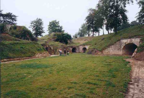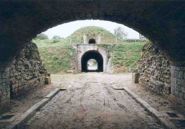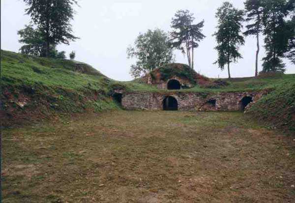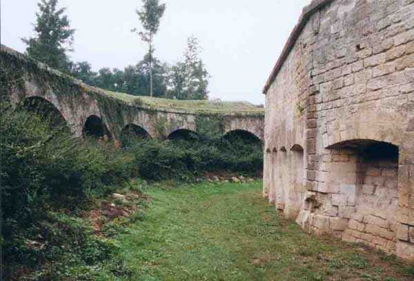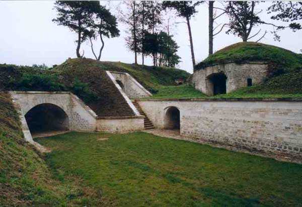 Position La Fère - Laon – Soissons, northeast of Soissons, 1877-1882. 168 m/alt. 658 men (incl. the strength of the battery of the same name) and 36 guns. Named fort Pille. With the fort of La Malmaison, it ensured the liaison between Laon and Soissons. Its shape is that of an irregular trapezoid with a re-entrant angle at the gorge. This angle is occupied by a double caponier whose, unusual configuration, the faces present an obtuse angle before the scarp. The flanking embrasures towards salient I are very deep, just like those of salient II flanking towards this same salient I. The flanking battery salient II for its part has the particularity of being reached by a very short and curved shaft. To the right of this gorge caponier, the entrance was provided with a bridge of the Tripier system. The entrance porch passed, one arrives in a first courtyard and, curiously, opposite emerges the rampart street. Traverse number 17 is situated to the left of this courtyard. To reach the barracks, one must take the tunnel passage on the left, passage also giving access to a first powder magazine. The barracks courtyard shows, facing each other, five bays on two floors with nicely festooned pediment. The second powder magazine is located beyond. The cumulative capacity of these two magazines was 126,000 kg. One should also note the presence of a cartridge magazine with a capacity of 445,200 cartridges and two bread ovens for 300 rations each (destroyed). Not far from salient I, a drinking water well is 87 meters deep. The fort comprises a second well. Between salient I and salient IV, 17 traverses are lined by the rampart street. They are two-storied, very similar to those of the fort of La Malmaison. Numbers 2 to 15 are connected to each other by an enveloping gallery. Number 7 also serves as access shaft to the double caponier of salient II. In front of the traverse, this shaft passes underneath a first armored casemate in hard cast iron Model 1878. A second casemate, of the same type, occupies the front of traverse number 13. These two casemates were received on July 21, 1881. These two casemates have been miraculously preserved, one of them still possessing its carriage and its gun mounting. The fort also possesses two optical communications posts, both casemated. The first is located above the fort entrance and its two embrasures communicate, one with Soissons and the other with the signal of Montaigu. The second crowns the east angle of the barracks and communicated with the relay of Vrigny and the lookout of Berru of the place of Reims. On its glacis, very close to the fort, from salient III to salient I were found no less than 7 battery emplacements. The fort was declassified by the law of July 17, 1912. Very degraded, the fort is, since 1978, cherished and restored little by little by Françoise and Pierre Potier who, notably thanks to reintegration worksites, have given back their soul to these old walls. Open to the public. We lack recent information regarding the progress of the restoration works and, consequently, its current state.